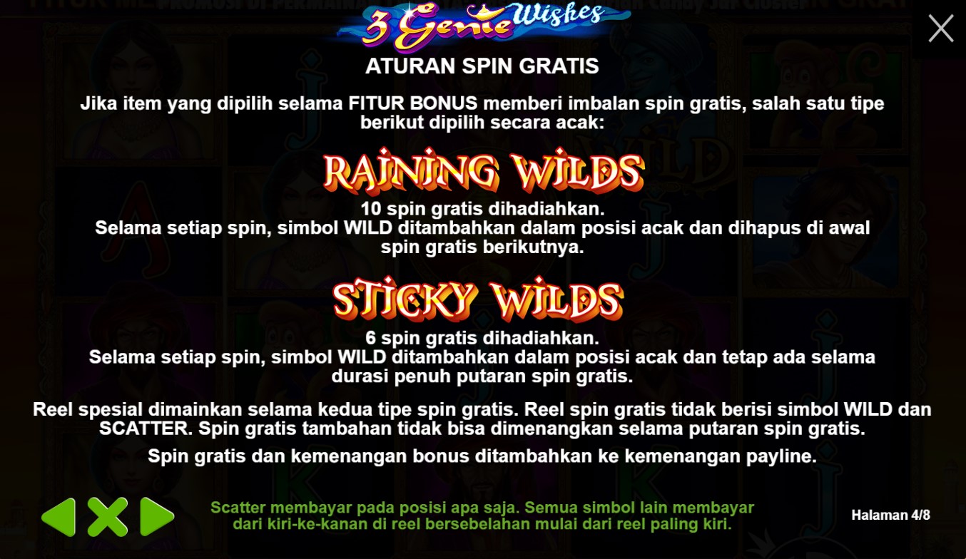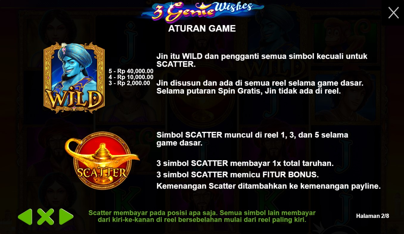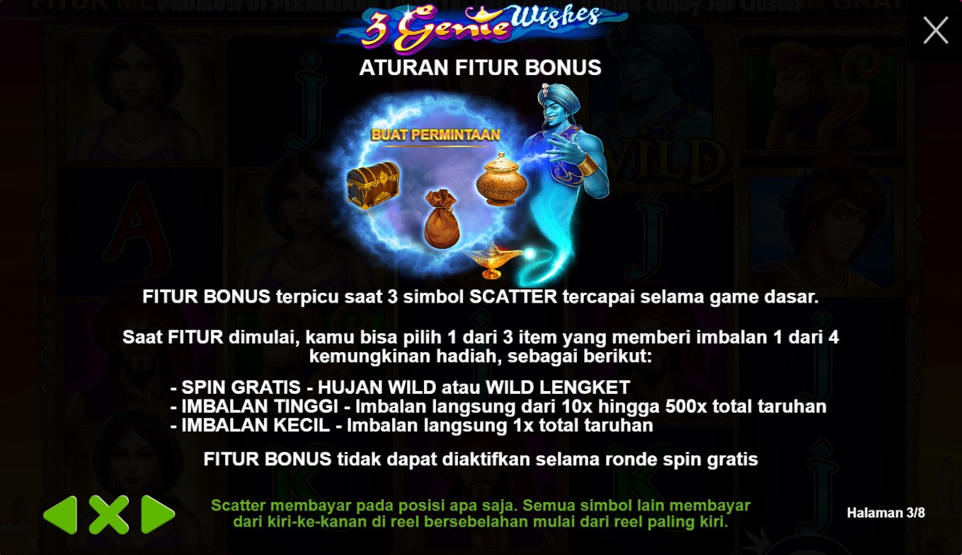 Paytable Slot Online Terpercaya 3 Genie Wishes" menampilkan kekayaan hadiah yang menanti Anda dalam permainan ini. Dengan sekilas pada paytable, Anda akan terpesona oleh simbol-simbol magis dan nilai-nilai kemenangan yang menggiurkan. Mulai dari kombinasi pemenang hingga fitur-fitur bonus yang mengagumkan, paytable ini memberikan gambaran jelas tentang potensi kemenangan yang luar biasa dalam permainan slot online terpercaya ini. Bersiaplah untuk menggosok lampu ajaib dan mengejar hadiah-hadiah menakjubkan dalam "Paytable Slot Online Terpercaya 3 Genie Wishes"!