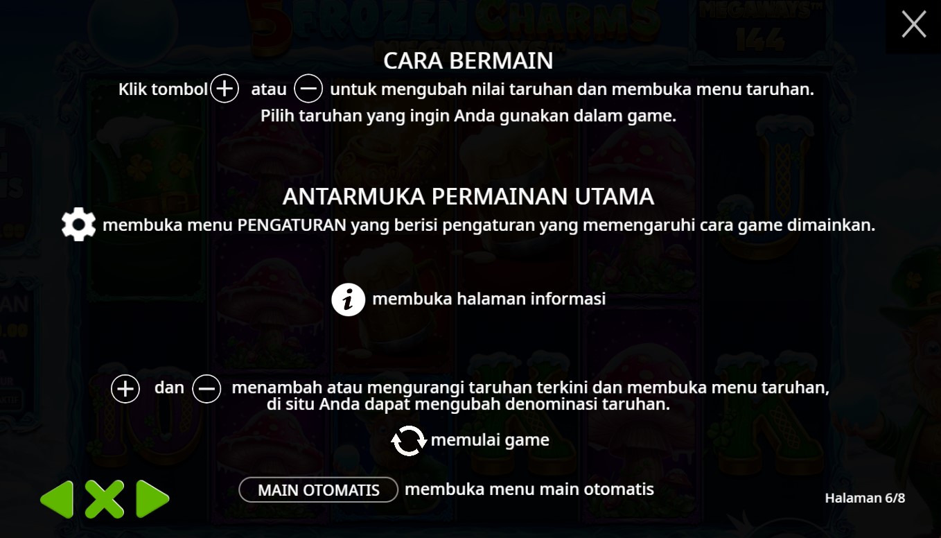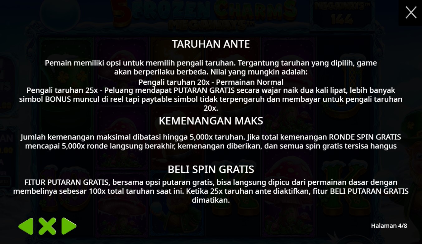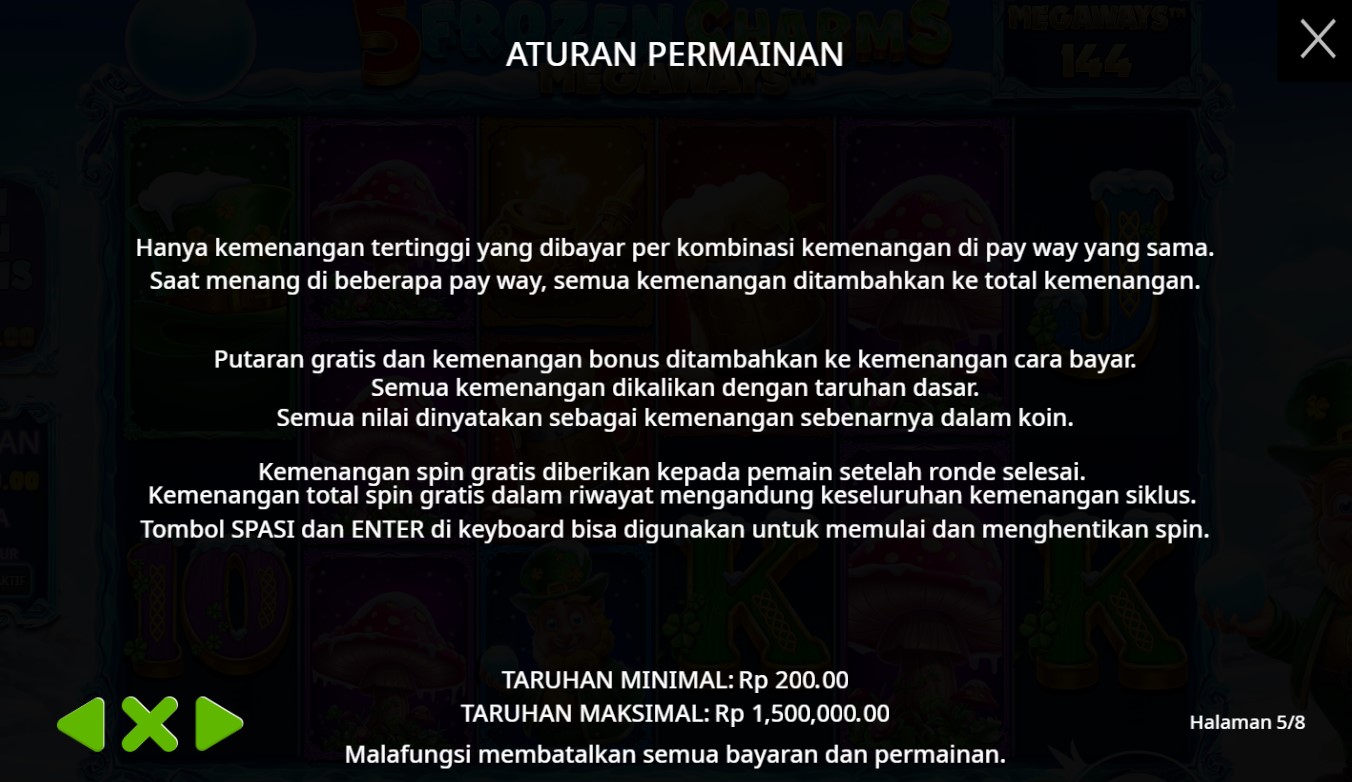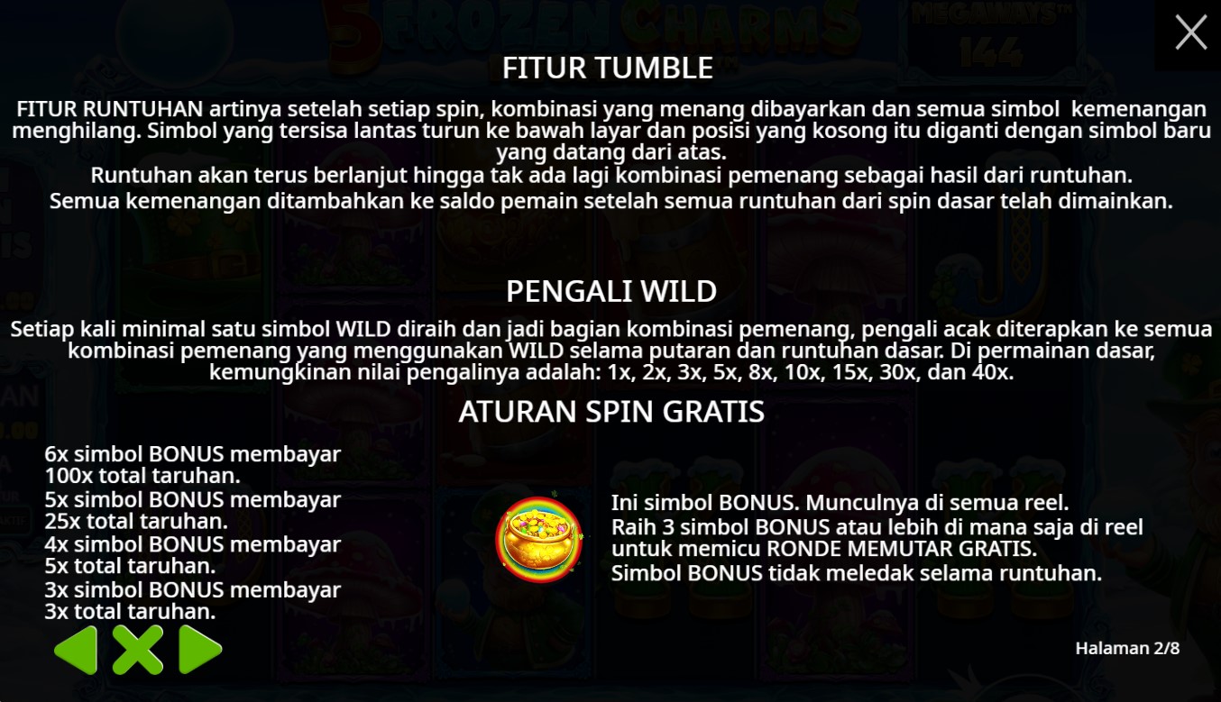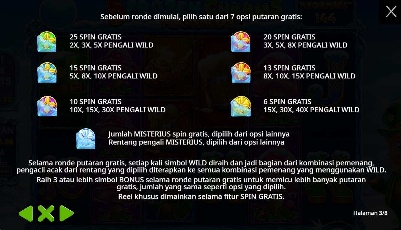 Paytable Slot Online 5 Frozen Charms Megaways adalah permainan slot online yang menawarkan petualangan magis di dunia fantasi yang memukau. Dikembangkan oleh Pragmatic Play, game ini menampilkan berbagai simbol yang menghadirkan nuansa ajaib dan misterius. Simbol-simbol yang dapat ditemui dalam permainan ini termasuk karakter-karakter ajaib seperti peri, naga, dan berbagai artefak magis seperti kalung berlian dan tongkat sihir. Selain itu, simbol kartu remi klasik seperti A, K, Q, J, dan 10 juga dihiasi dengan elemen fantasi yang menarik. Setiap simbol memiliki nilai yang berbeda dan dapat memberikan kemenangan yang menggiurkan kepada para pemain. Dengan fitur Megaways yang inovatif, setiap putaran memberikan peluang besar untuk meraih kemenangan spektakuler. Segera bergabung dalam petualangan ajaib 5 Frozen Charms Megaways dan rasakan sensasi magis yang tak terlupakan!