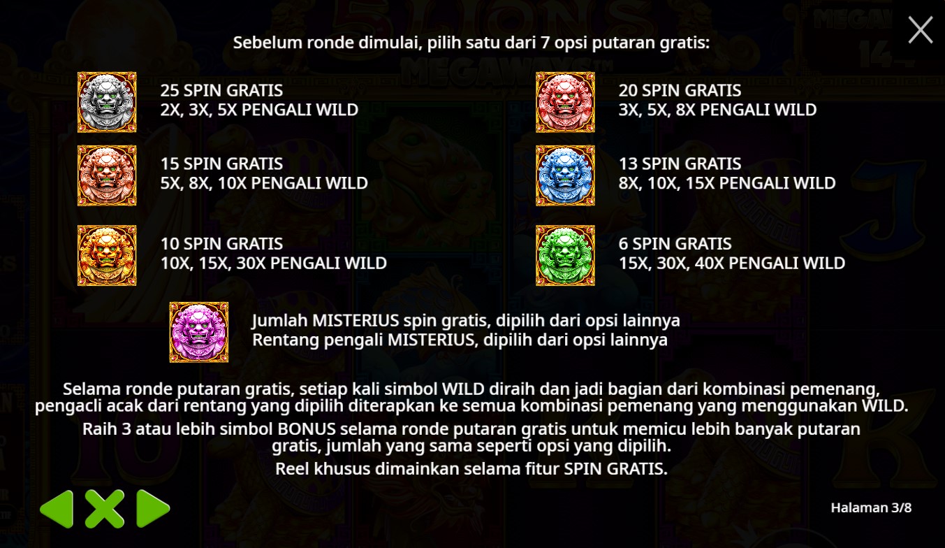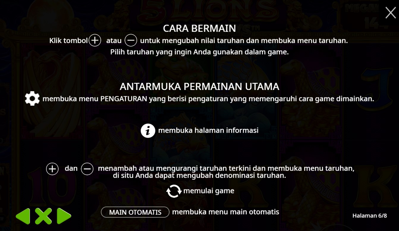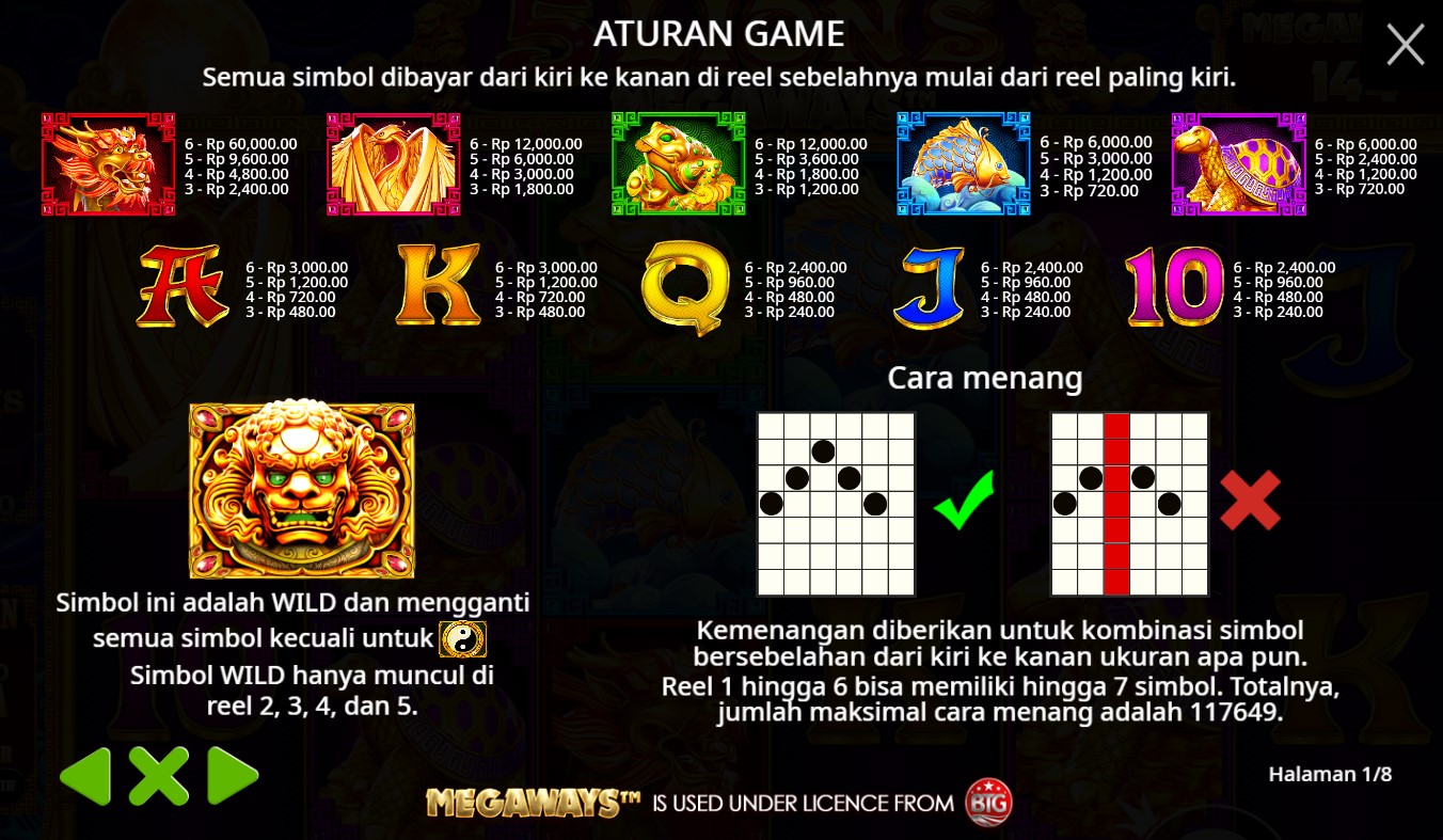 Paytable Slot Online 5 Lions Megaways adalah kumpulan simbol-simbol yang menarik dan beragam, menciptakan pengalaman bermain yang mengasyikkan. Simbol-simbol yang dapat ditemui dalam permainan ini termasuk singa, naga, phoenix, koi, dan penjaga gerbang. Singa merupakan simbol dengan nilai tertinggi, diikuti oleh naga dan phoenix yang juga memberikan kemenangan besar. Simbol koi dan penjaga gerbang memberikan kemenangan yang lebih rendah namun tetap menarik. Selain itu, terdapat simbol Wild yang diwakili oleh gambar singa emas, yang dapat menggantikan simbol lain untuk menciptakan kombinasi kemenangan. Simbol Scatter yang diwakili oleh gambar potongan puzzle juga hadir dalam permainan ini, memicu fitur bonus yang menguntungkan. Dengan kombinasi simbol-simbol yang menarik dan beragam, Paytable Slot Online 5 Lions Megaways menawarkan pengalaman bermain yang seru dan penuh kejutan bagi para penggemar slot online. Jelajahi keindahan simbol-simbol ini dan raih kemenangan besar di dalam dunia magis 5 Lions Megaways!