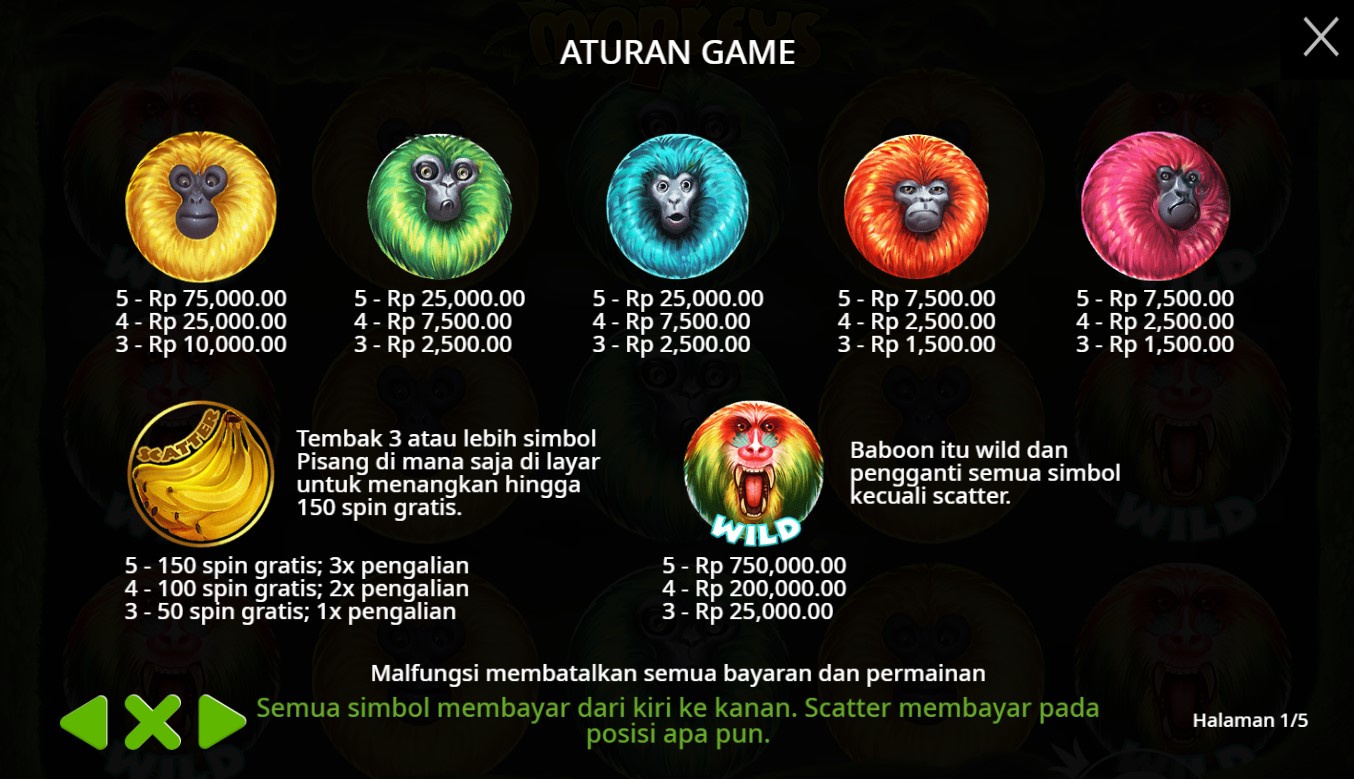 Paytable Slot Online Terpercaya 7 Monkeys adalah informasi yang menjelaskan detail tentang simbol-simbol dalam permainan slot 7 Monkeys, termasuk nilai setiap simbol, kombinasi yang dapat menang, serta fitur bonus yang tersedia. Dalam permainan ini, pemain bisa melihat berapa banyak kemenangan yang bisa didapatkan berdasarkan simbol yang muncul di gulungan. Selain itu, paytable juga dapat memberikan informasi tentang jackpot, wild symbols, scatter symbols, dan fitur khusus lainnya yang mungkin meningkatkan peluang menang. Penting bagi pemain untuk memahami paytable sebelum bermain agar dapat mengoptimalkan strategi mereka.