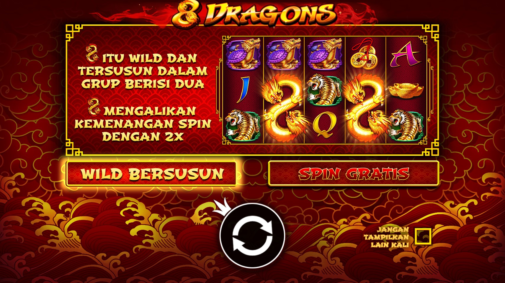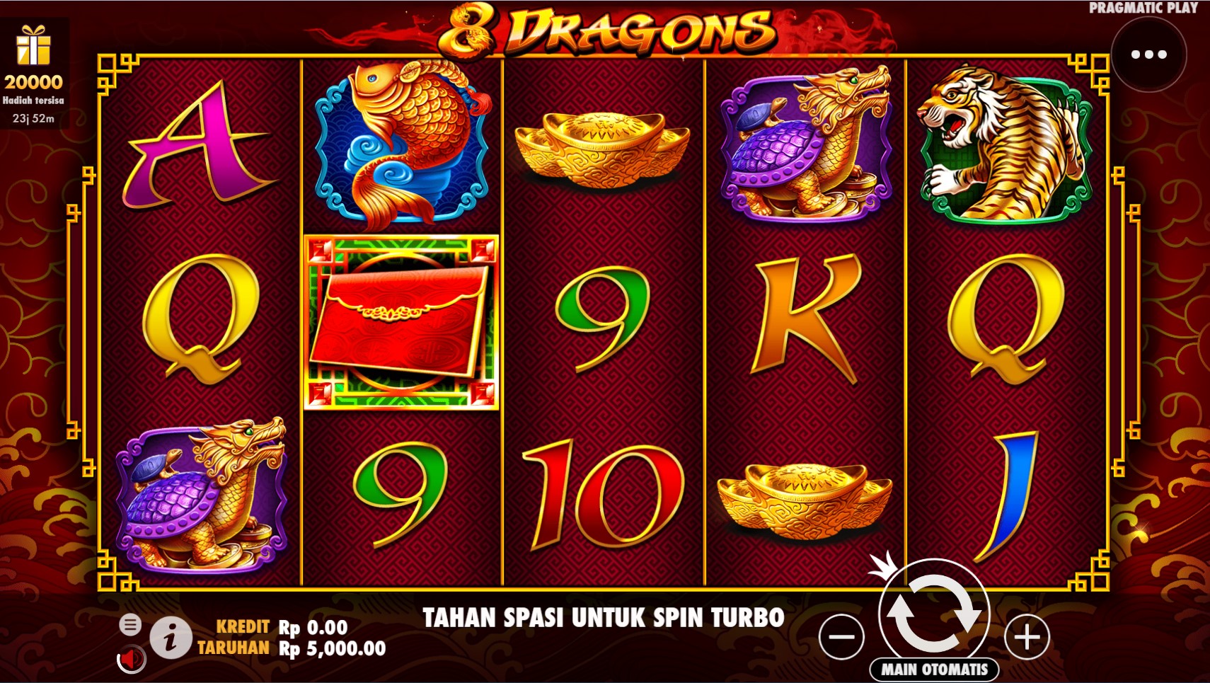 8 Dragons adalah petualangan epik yang menanti Anda di dunia slot online yang penuh keajaiban. Dari rumah pengembang game terpercaya, Pragmatic Play, hadir sebuah slot yang menggabungkan mitos dan keberuntungan menjadi sebuah pengalaman bermain yang tak terlupakan. Dalam 8 Dragons, Anda akan memasuki dunia mistis Tiongkok kuno, di mana delapan naga legendaris menjaga gulungan yang berputar dengan kuasa dan kekayaan tak terbatas. Setiap putaran akan memikat Anda dengan simbol-simbol yang indah dan fitur-fitur bonus yang mempesona, menawarkan peluang besar untuk memenangkan hadiah yang menggiurkan. Siapkan diri Anda untuk merasakan kekuatan naga dan menaklukkan gulungan ini dalam pencarian Anda untuk kemenangan yang spektakuler. Bergabunglah dalam perjalanan menuju keberuntungan di 8 Dragons sekarang!