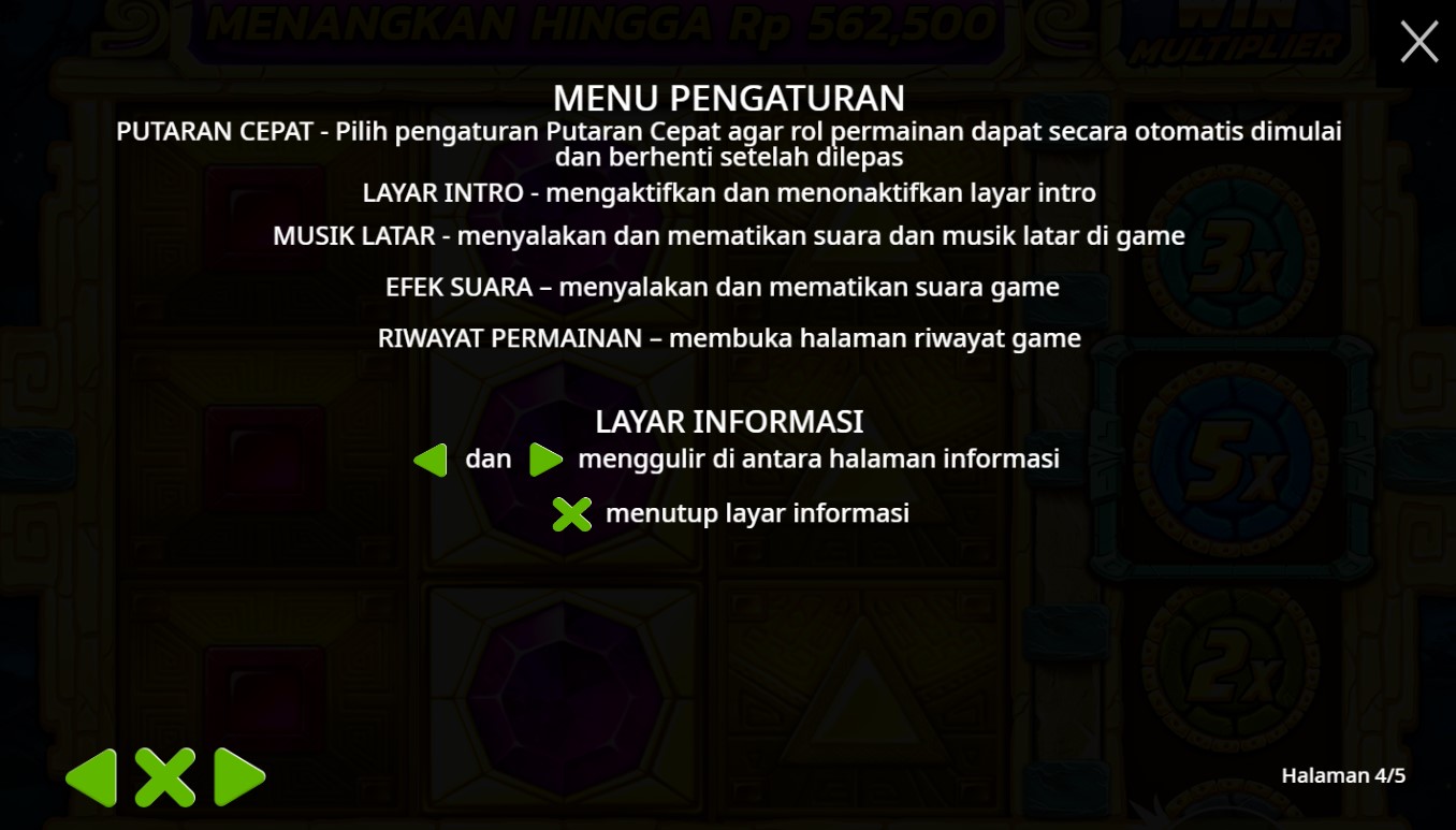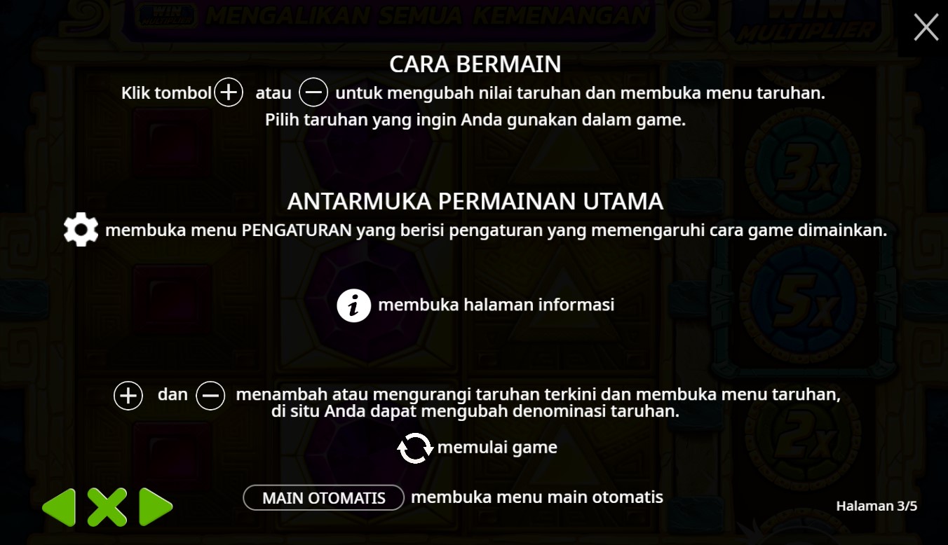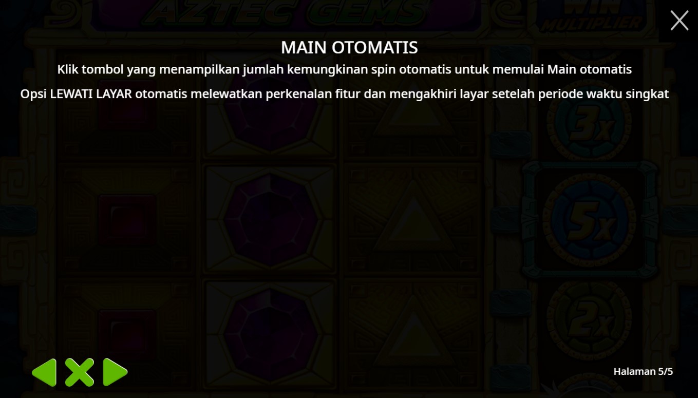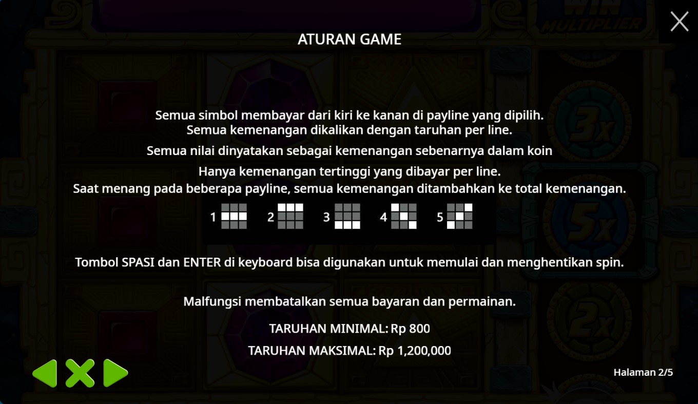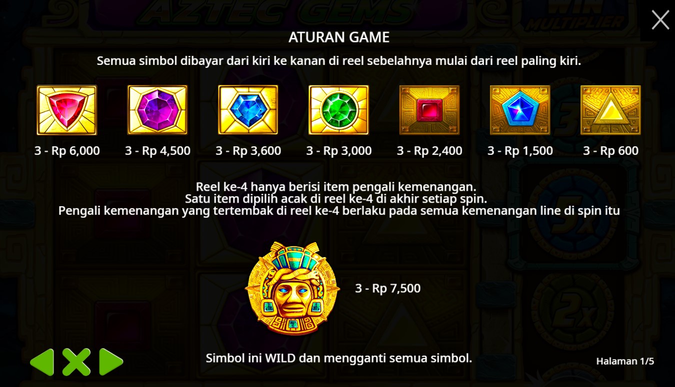 Paytable Slot Online Aztec Gems adalah kumpulan simbol yang mewakili keajaiban dan kekayaan dari peradaban Aztec. Simbol-simbol tersebut termasuk berbagai artefak berharga seperti kalung permata, topeng Aztec, dan harta karun kuno, semuanya menambahkan nuansa misteri dalam permainan. Selain itu, simbol panah dan keping emas juga memiliki nilai yang tinggi dalam pembayaran. Tidak hanya itu, game ini juga dilengkapi dengan simbol Special seperti Wilds dan Scatters yang memicu fitur-fitur bonus menarik. Wilds dapat menggantikan simbol lain untuk membentuk kombinasi pemenang, sementara Scatters biasanya memicu putaran Free Spins atau fitur bonus lainnya. Dengan kombinasi simbol-simbol yang beragam dan menguntungkan, pemain dapat menikmati pengalaman bermain yang seru dan berpotensi untuk meraih kemenangan besar. Segera telusuri kekayaan dunia Aztec dan temukan keberuntungan Anda di Aztec Gems!