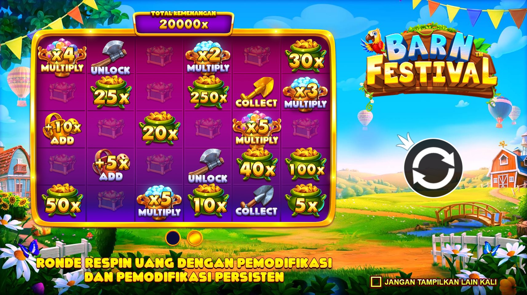 Barn Festival adalah perayaan yang menggembirakan dan penuh keceriaan dalam slot online terpercaya dari Pragmatic Play. Dalam permainan ini, Anda akan merasakan atmosfir yang kental dengan kehidupan pedesaan, di mana gulungan-gulungan yang berputar dipenuhi dengan simbol-simbol yang melambangkan kegembiraan dan keberlimpahan. Namun, apa yang membuat Barn Festival benar-benar istimewa adalah fitur-fitur bonus yang menarik. Dari putaran gratis yang mempesona hingga mini game seru, setiap momen di Barn Festival adalah kesempatan emas untuk meraih hadiah yang luar biasa. Dengan tampilan yang ceria dan antarmuka yang mudah digunakan, Anda akan merasakan pengalaman bermain yang tak terlupakan. Siapkan diri Anda untuk bergabung dalam perayaan penuh sukacita dalam Barn Festival yang menakjubkan ini!