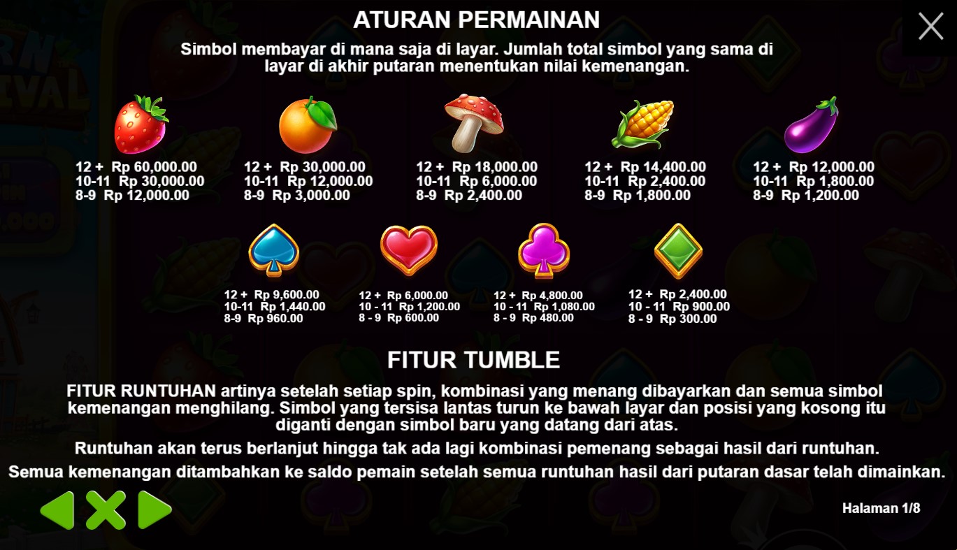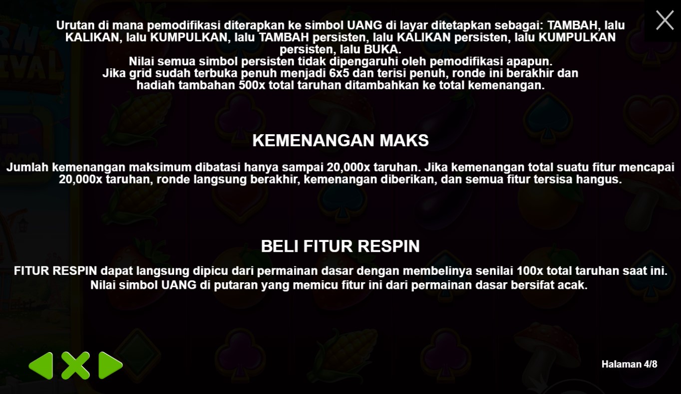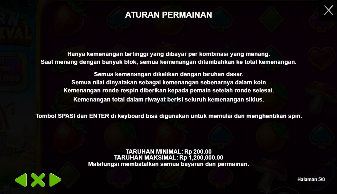 paytable yang menggembirakan dari slot online terpercaya, Barn Festival! Di dalam paytable ini, Anda akan menemukan simbol-simbol yang penuh keceriaan dan keberlimpahan dari dunia pedesaan. Setiap simbol yang muncul di gulungan akan membawa Anda pada perayaan yang tak terlupakan, dengan kombinasi yang menggiurkan dan nilai taruhan yang menarik. Jelajahi setiap rincian paytable ini dan temukan kebahagiaan yang tersembunyi di setiap putaran. Bersiaplah untuk merasakan sensasi kemenangan yang riang dalam permainan Barn Festival yang menarik ini. Ayo, bergabunglah dalam perayaan dan nikmati setiap momen kegembiraan dalam permainan slot online terpercaya, Barn Festival!