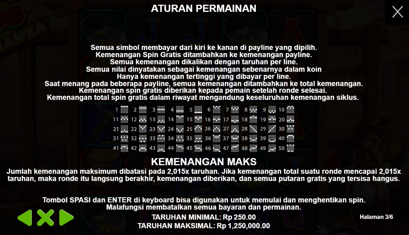 paytable yang memicu ledakan kegembiraan dari slot online terpercaya, Bomb Bonanza! Di dalam paytable ini, Anda akan menemukan simbol-simbol yang melambangkan aksi dan ketegangan, dengan bom-bom yang siap meledak. Setiap simbol yang muncul di gulungan akan membawa Anda pada petualangan yang memompa adrenalin, dengan kombinasi yang menggiurkan dan nilai taruhan yang menarik. Jelajahi setiap rincian paytable ini dan temukan hadiah yang tersembunyi di setiap putaran. Bersiaplah untuk merasakan sensasi kemenangan yang meledak-ledak dalam permainan Bomb Bonanza yang memompa adrenalin ini. Ayo, siapkan diri Anda untuk menghadapi ledakan-ledakan kegembiraan dan nikmati setiap momen keunggulan dalam permainan slot online terpercaya, Bomb Bonanza!