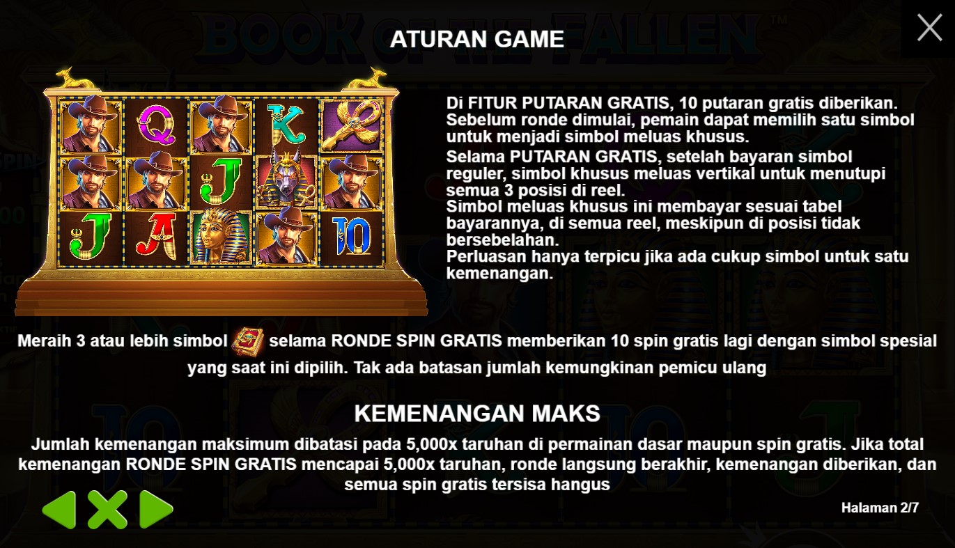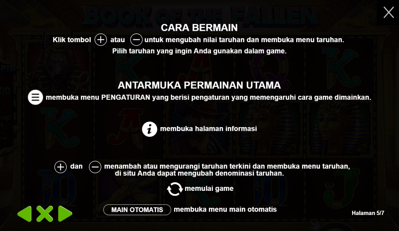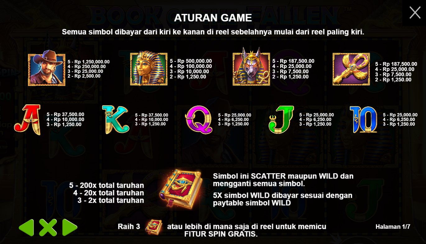 paytable yang mempersembahkan keajaiban dari slot online terpercaya, Book Of The Fallen! Di dalam paytable ini, Anda akan menemukan simbol-simbol yang melambangkan misteri dan kekuatan magis, dengan buku kuno sebagai pusat perhatian. Setiap simbol yang muncul di gulungan akan membawa Anda pada petualangan yang epik, dengan kombinasi yang menggiurkan dan nilai taruhan yang menarik. Jelajahi setiap rincian paytable ini dan temukan hadiah yang tersembunyi di setiap putaran. Bersiaplah untuk merasakan sensasi kemenangan yang magis dalam permainan Book Of The Fallen yang memikat ini. Ayo, siapkan diri Anda untuk memecahkan teka-teki dan mengungkap keajaiban dalam permainan slot online terpercaya, Book Of The Fallen!