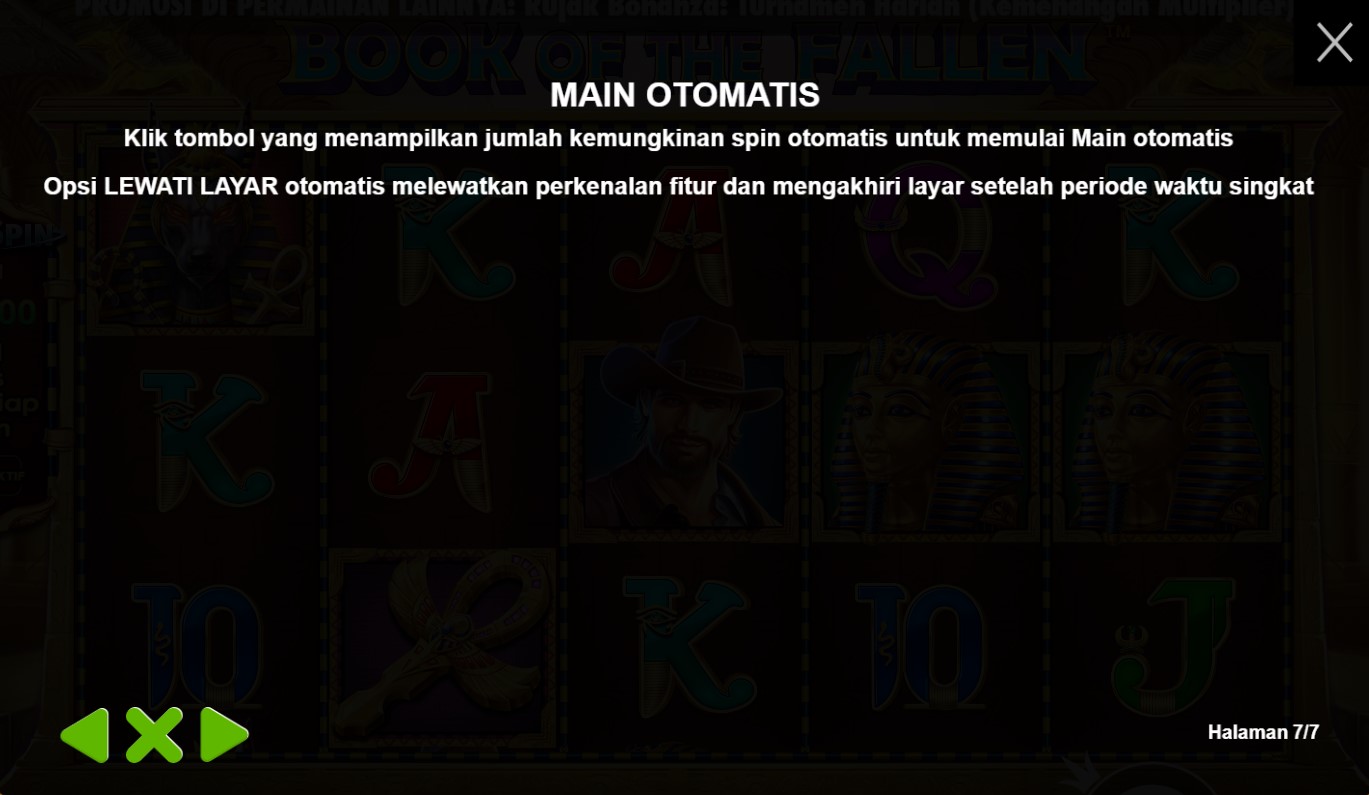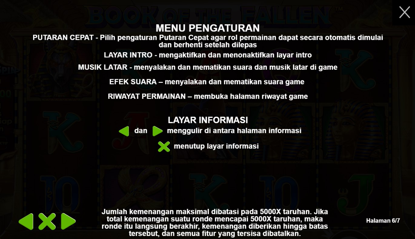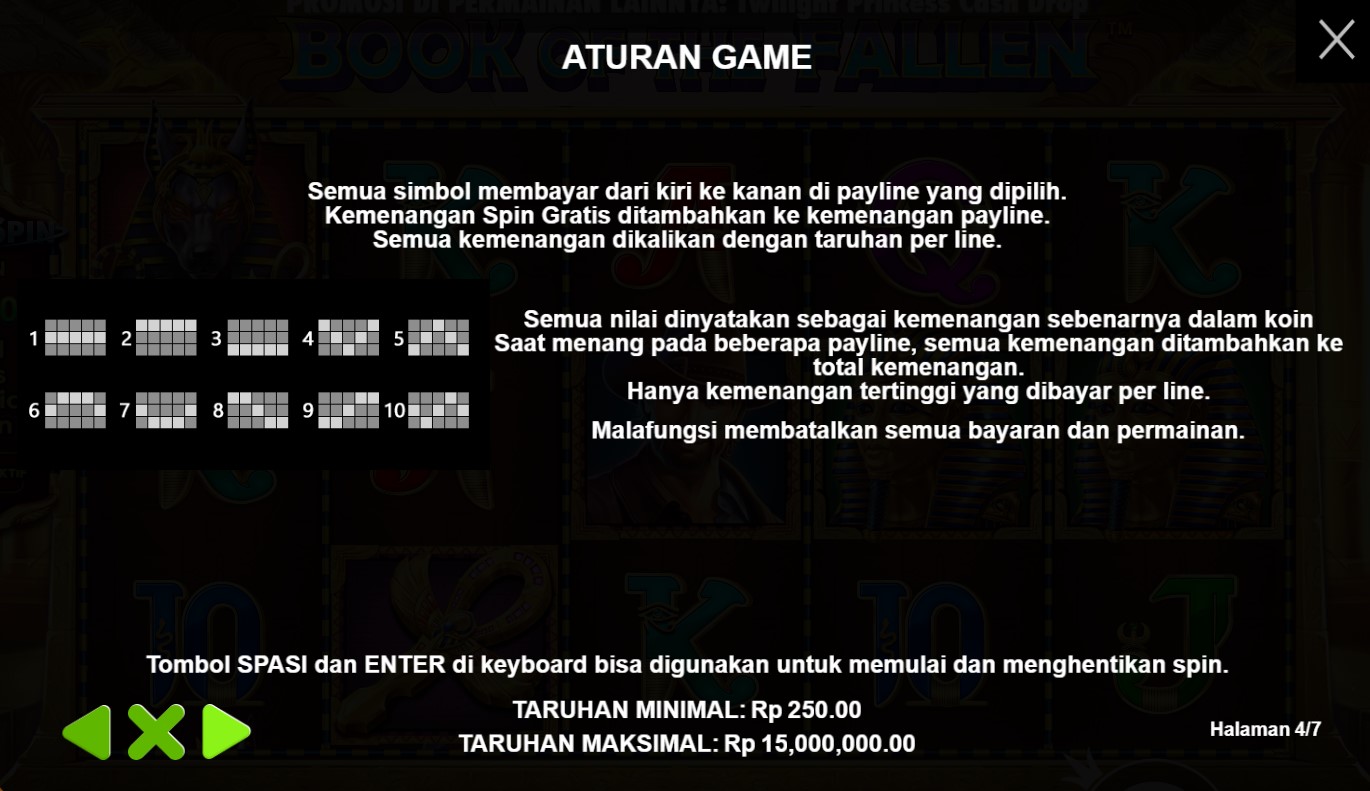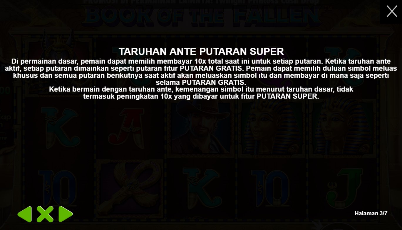 paytable yang mempersembahkan keajaiban dari slot online terpercaya, Book Of The Fallen! Di dalam paytable ini, Anda akan menemukan simbol-simbol yang melambangkan misteri dan kekuatan magis, dengan buku kuno sebagai pusat perhatian. Setiap simbol yang muncul di gulungan akan membawa Anda pada petualangan yang epik, dengan kombinasi yang menggiurkan dan nilai taruhan yang menarik. Jelajahi setiap rincian paytable ini dan temukan hadiah yang tersembunyi di setiap putaran. Bersiaplah untuk merasakan sensasi kemenangan yang magis dalam permainan Book Of The Fallen yang memikat ini. Ayo, siapkan diri Anda untuk memecahkan teka-teki dan mengungkap keajaiban dalam permainan slot online terpercaya, Book Of The Fallen!