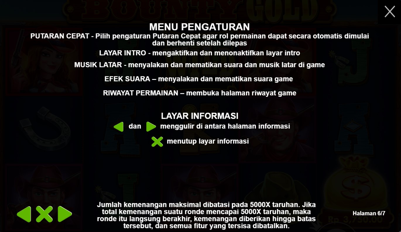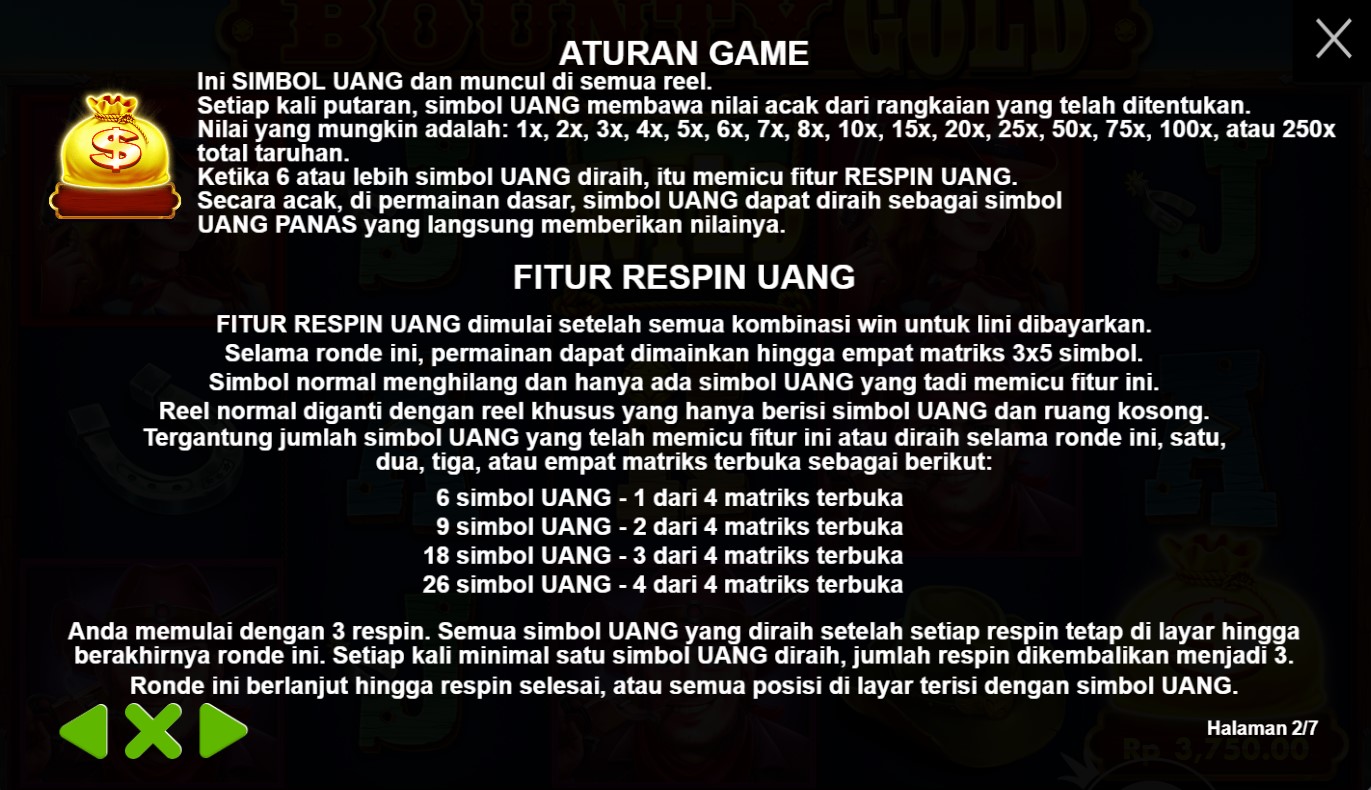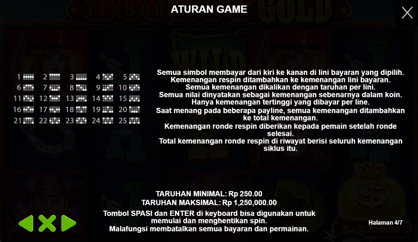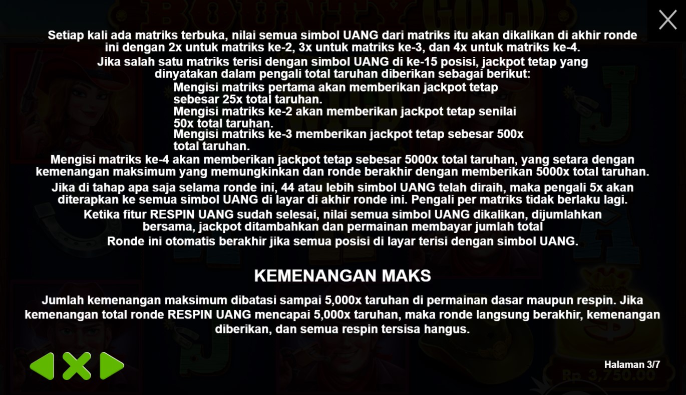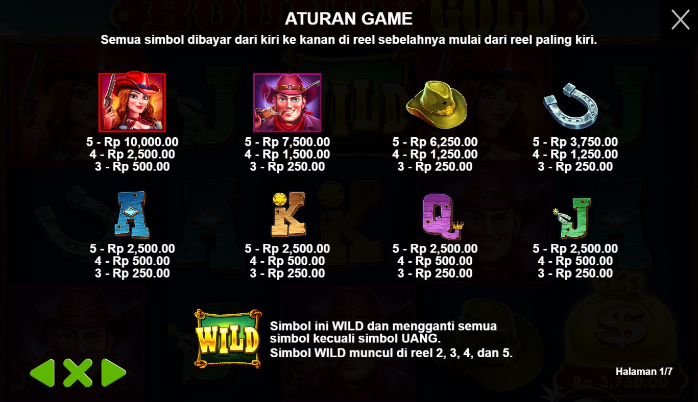 paytable yang mengungkap keuntungan dan kegembiraan dalam slot online terpercaya, Bounty Gold! Di dalam paytable ini, Anda akan menemukan simbol-simbol yang melambangkan petualangan dan harta karun, dengan keseruan Bounty Gold sebagai pusat perhatian. Setiap simbol yang muncul di gulungan akan membawa Anda pada petualangan yang menegangkan, dengan kombinasi yang menggiurkan dan nilai taruhan yang menarik. Jelajahi setiap rincian paytable ini dan temukan hadiah yang tersembunyi di setiap putaran. Bersiaplah untuk merasakan sensasi kemenangan yang memompa adrenalin dalam permainan Bounty Gold yang menarik ini. Ayo, siapkan diri Anda untuk memburu harta karun, dan nikmati setiap momen keunggulan dalam permainan slot online terpercaya, Bounty Gold!