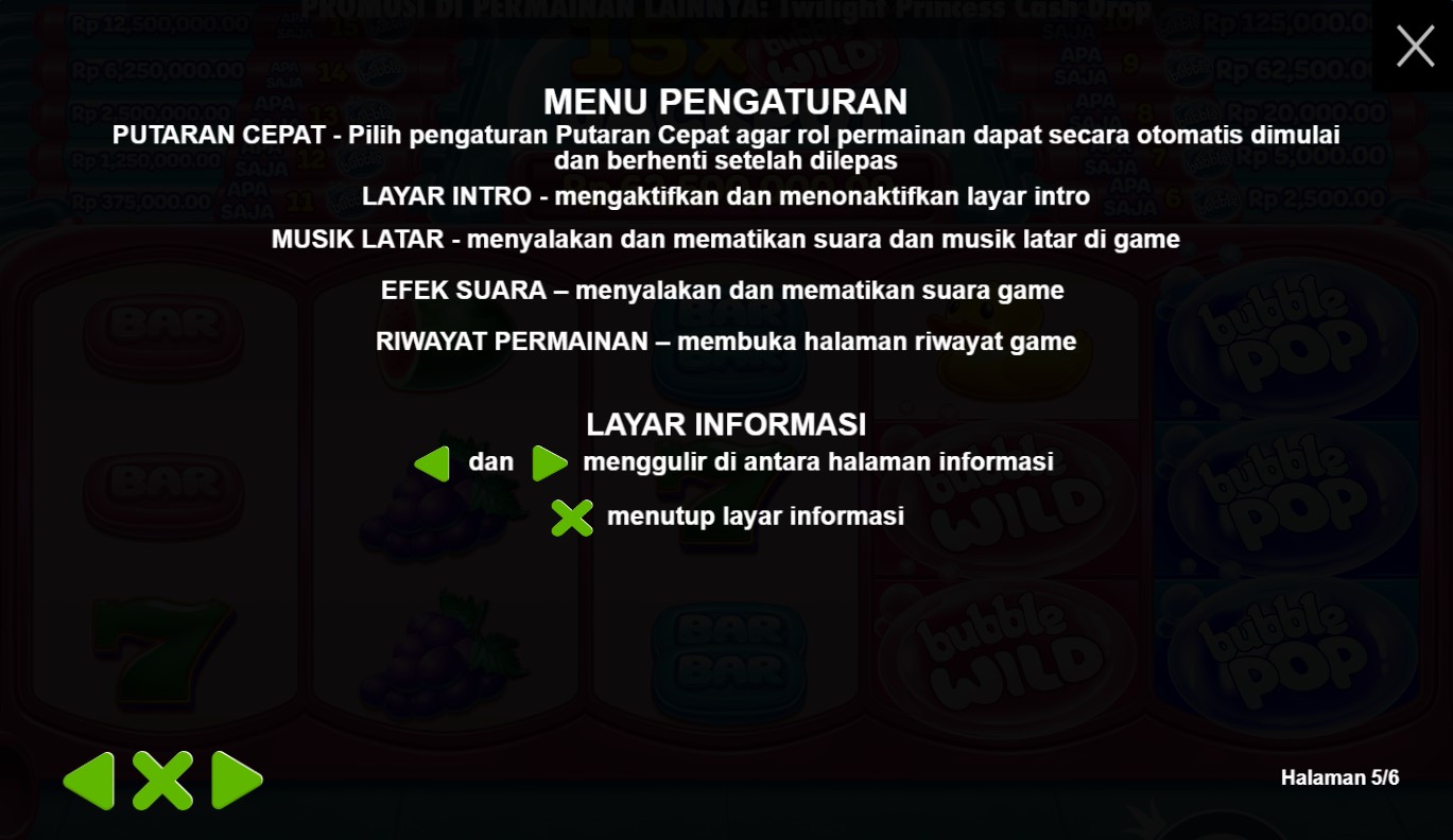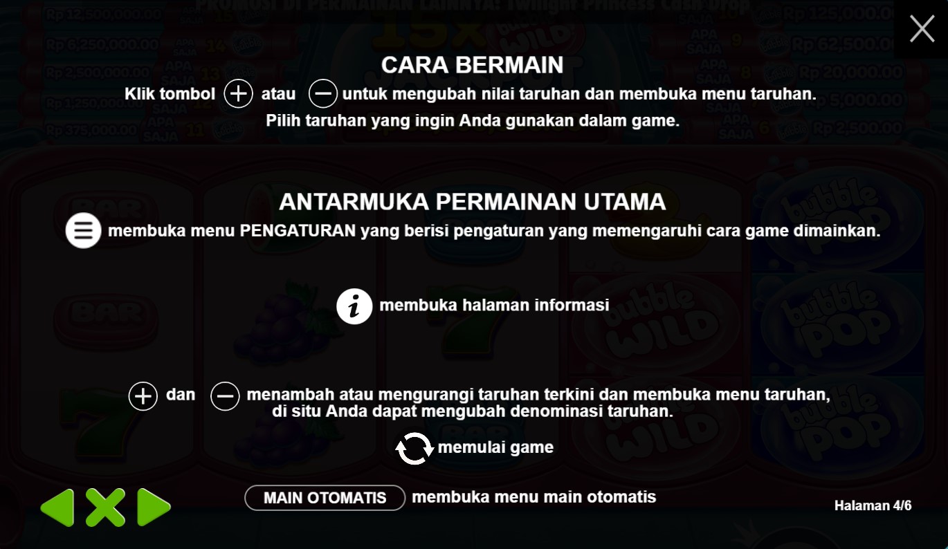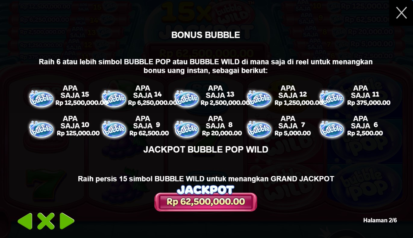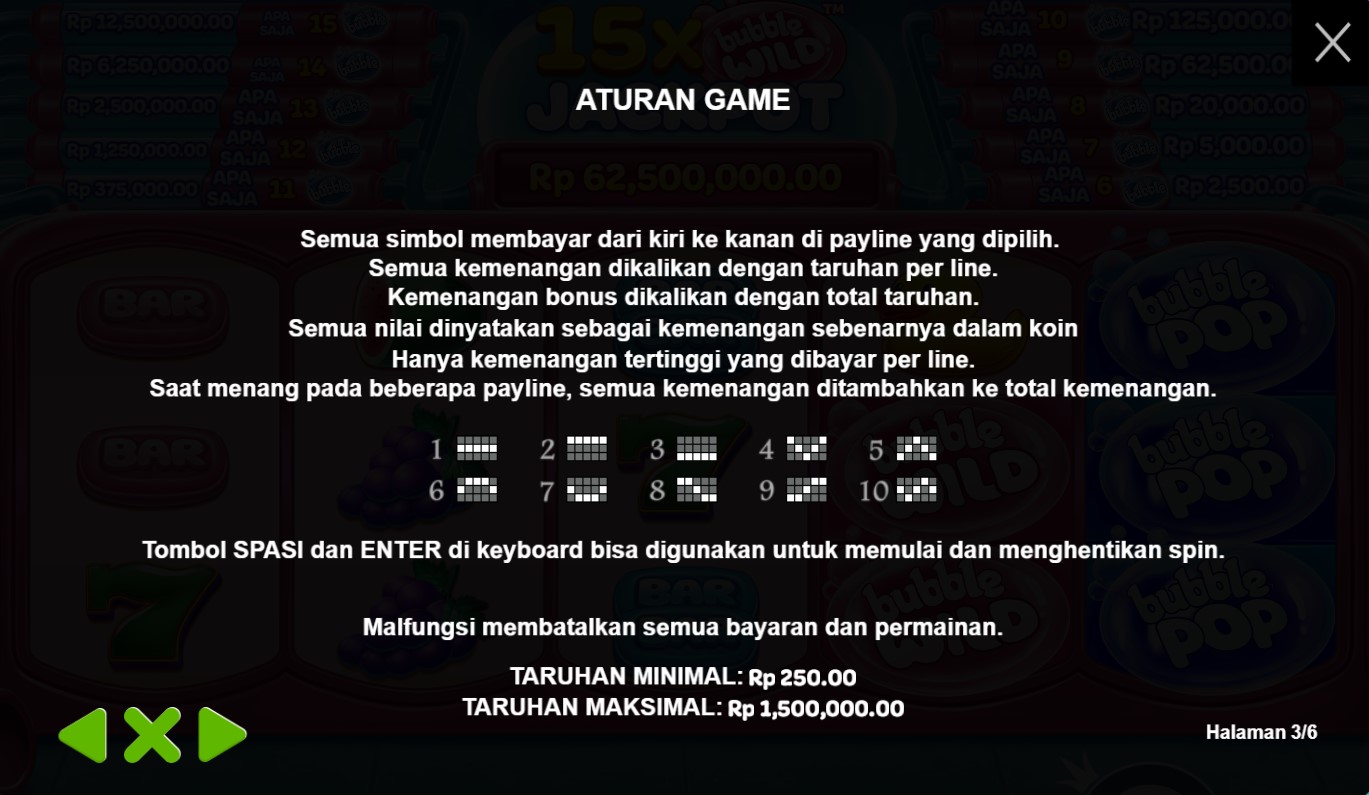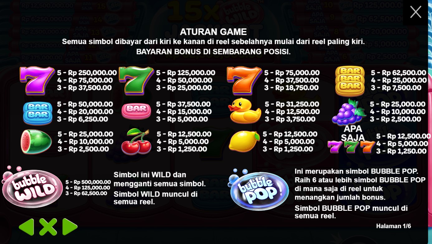paytable yang mengungkap kegembiraan dan potensi kemenangan dalam slot online terpercaya, Bubble Pop! Di dalam paytable ini, Anda akan menemukan gelembung-gelembung warna-warni yang siap meletus, dengan kesenangan Bubble Pop yang menjadi sorotan utama. Setiap simbol yang muncul di gulungan akan membawa Anda pada petualangan yang mengasyikkan, dengan kombinasi yang menguntungkan dan nilai taruhan yang menarik. Jelajahi setiap rincian paytable ini dan temukan hadiah yang tersembunyi di setiap putaran. Bersiaplah untuk merasakan sensasi kemenangan yang meletup-letup dalam permainan Bubble Pop yang unik ini. Ayo, siapkan diri Anda untuk meraih kegembiraan dan mendapatkan kemenangan yang melimpah dalam slot online terpercaya, Bubble Pop!