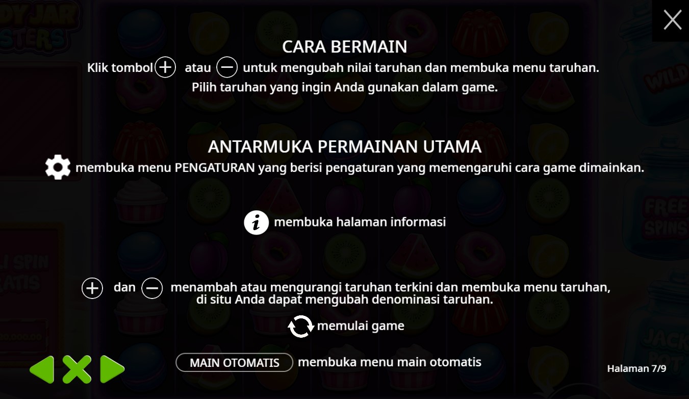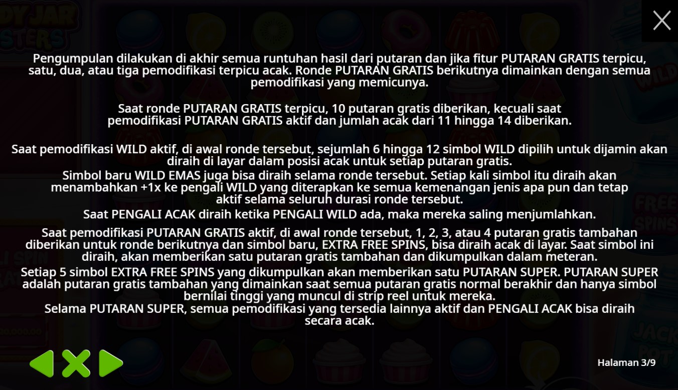 Paytable Slot Online Candy Jar Cluster adalah panduan yang mengungkapkan simbol-simbol manis yang menghiasi permainan ini. Dalam Candy Jar Cluster, Anda akan menemui simbol-simbol yang membuat setiap putaran semakin menggairahkan. Simbol-simbol yang hadir termasuk berbagai jenis permen dengan warna dan bentuk yang berbeda, seperti permen gula, permen kapas, permen jelly, dan permen karet. Setiap simbol memiliki nilai yang berbeda-beda, dan Anda akan diberikan imbalan yang menggiurkan ketika Anda berhasil mengumpulkan kelompok simbol-simbol yang sama secara berdekatan. Jadi, siapkan diri Anda untuk memasuki dunia manis dan menggoda di Paytable Slot Online Terpercaya Candy Jar Cluster, di mana simbol-simbol yang menggemaskan menanti untuk memberikan Anda hadiah-hadiah yang manis seperti permen itu sendiri!