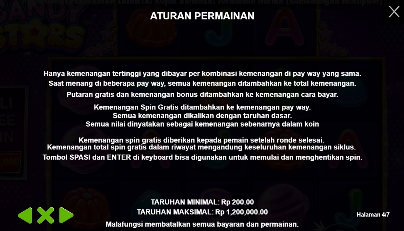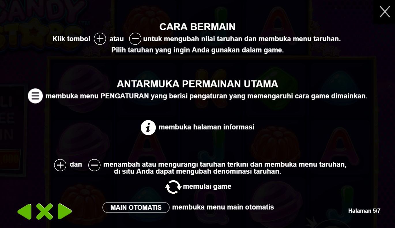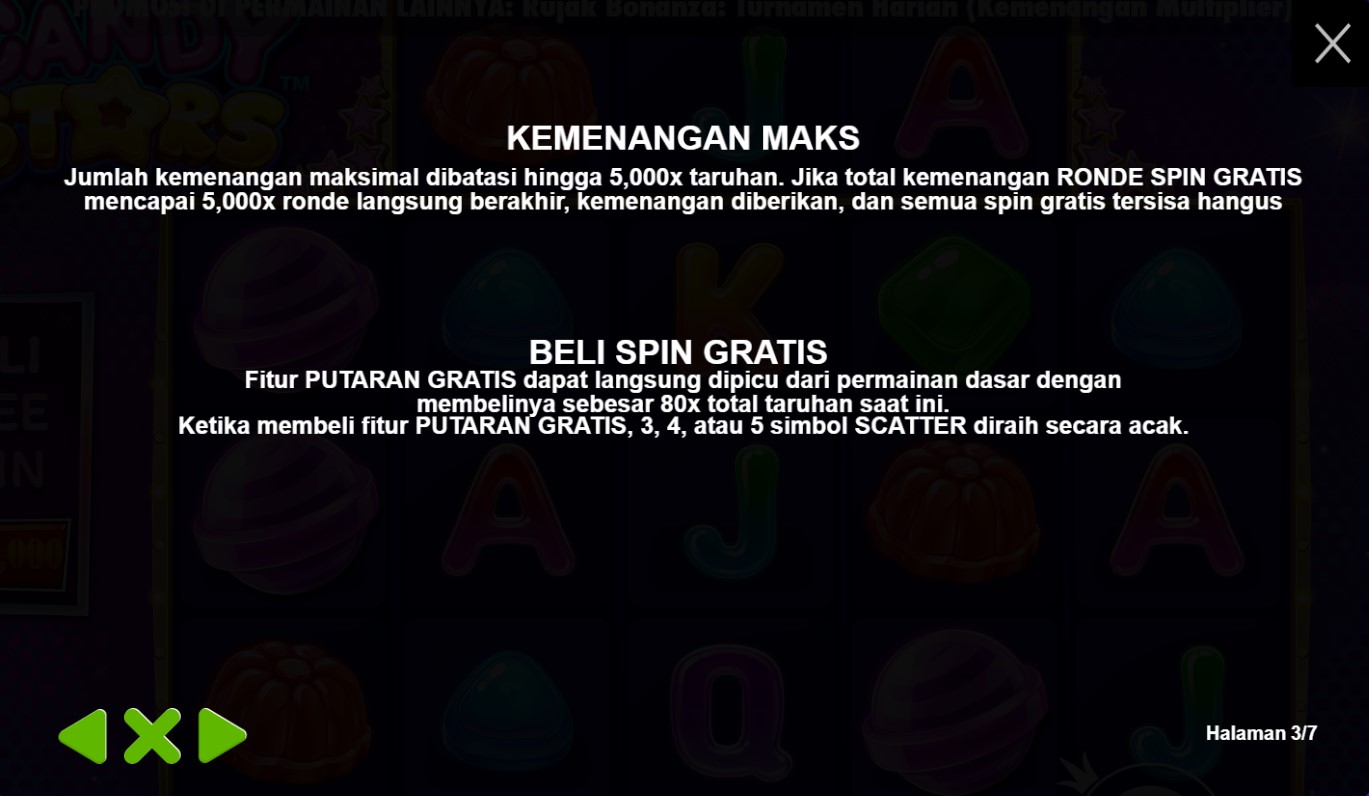 Paytable Candy Stars adalah sebuah panduan yang membawa Anda ke dalam dunia manis dan menggugah selera permainan slot online terpercaya ini. Dalam paytable ini, Anda akan menemukan berbagai simbol permen yang memikat hati dengan nilai kemenangan yang beragam. Setiap gulungan penuh dengan kejutan dan potensi untuk meraih hadiah manis yang akan membuat Anda tergoda untuk terus bermain. Dalam paytable Candy Stars, Anda akan menemukan simbol-simbol permen yang berbeda dengan nilai kemenangan yang beragam. Mulai dari permen berbentuk jeli yang memberikan hadiah kecil namun sering, hingga permen berbentuk lollipop berwarna-warni yang memberikan kemenangan besar yang menggoda. Setiap simbol memiliki nilai kemenangan yang tertera dengan jelas dalam paytable, sehingga Anda dapat melihat potensi pembayaran yang bisa Anda dapatkan. Selain itu, Candy Stars juga menawarkan simbol-simbol khusus seperti simbol Wild yang dapat menggantikan simbol lainnya, serta simbol Scatter yang bisa memicu fitur-fitur bonus menarik.