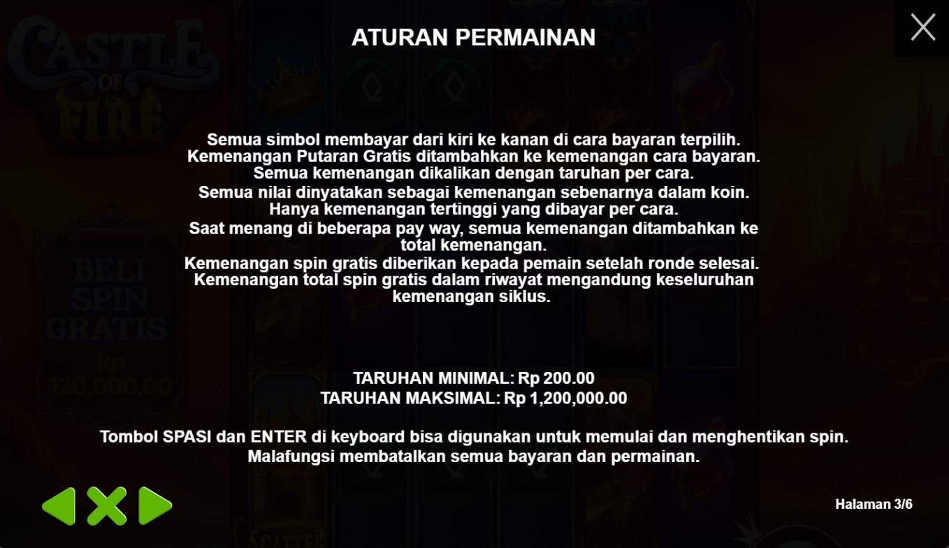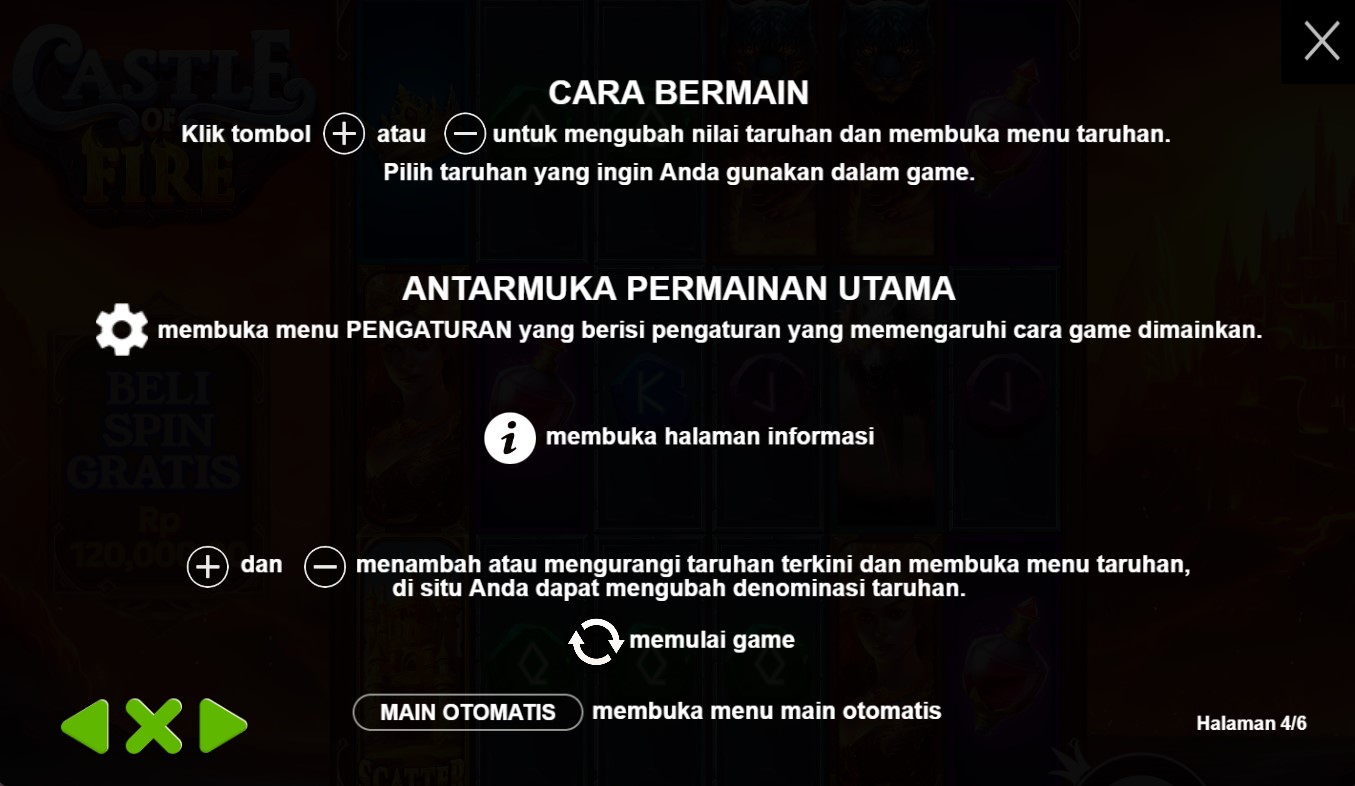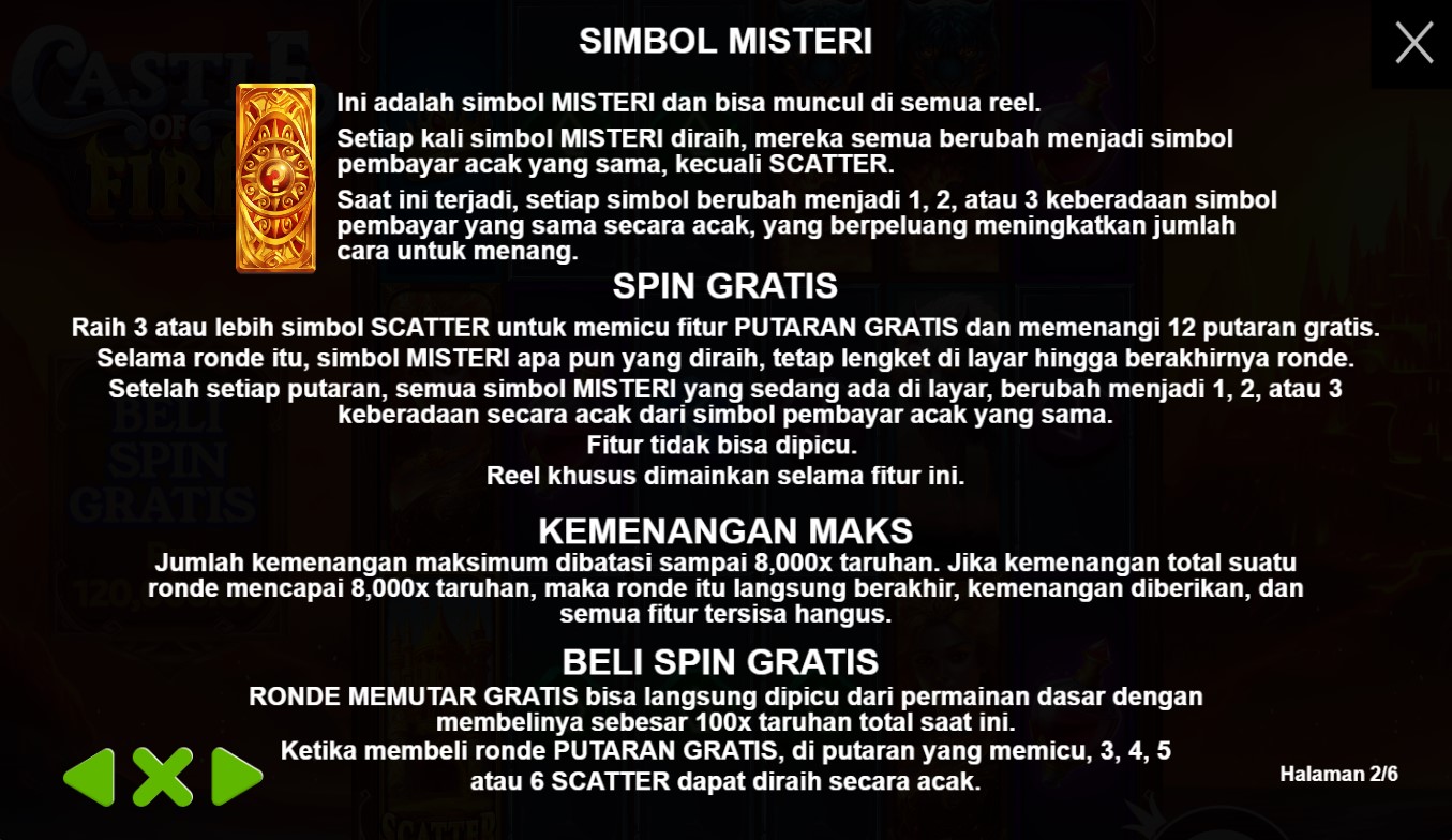 Paytable Slot Online Castle Of Fire adalah terdiri dari simbol-simbol yang mencerminkan kekayaan dan misteri tema fantasi permainan ini. Simbol-simbol rendah termasuk potongan batu dengan huruf 10 hingga A, sedangkan simbol-simbol tinggi meliputi botol ramuan, cincin, mahkota, serigala, harimau, dan simbol karakter. Untuk mendapatkan kemenangan, pemain perlu mencocokkan simbol-simbol ini dengan 2,5 hingga 8 kali lipat taruhan untuk simbol-simbol premium. Permainan ini tidak memiliki simbol liar, namun hadir dengan fitur simbol misteri yang dapat berubah menjadi 1, 2, atau 3 simbol yang sama, meningkatkan peluang kemenangan pemain