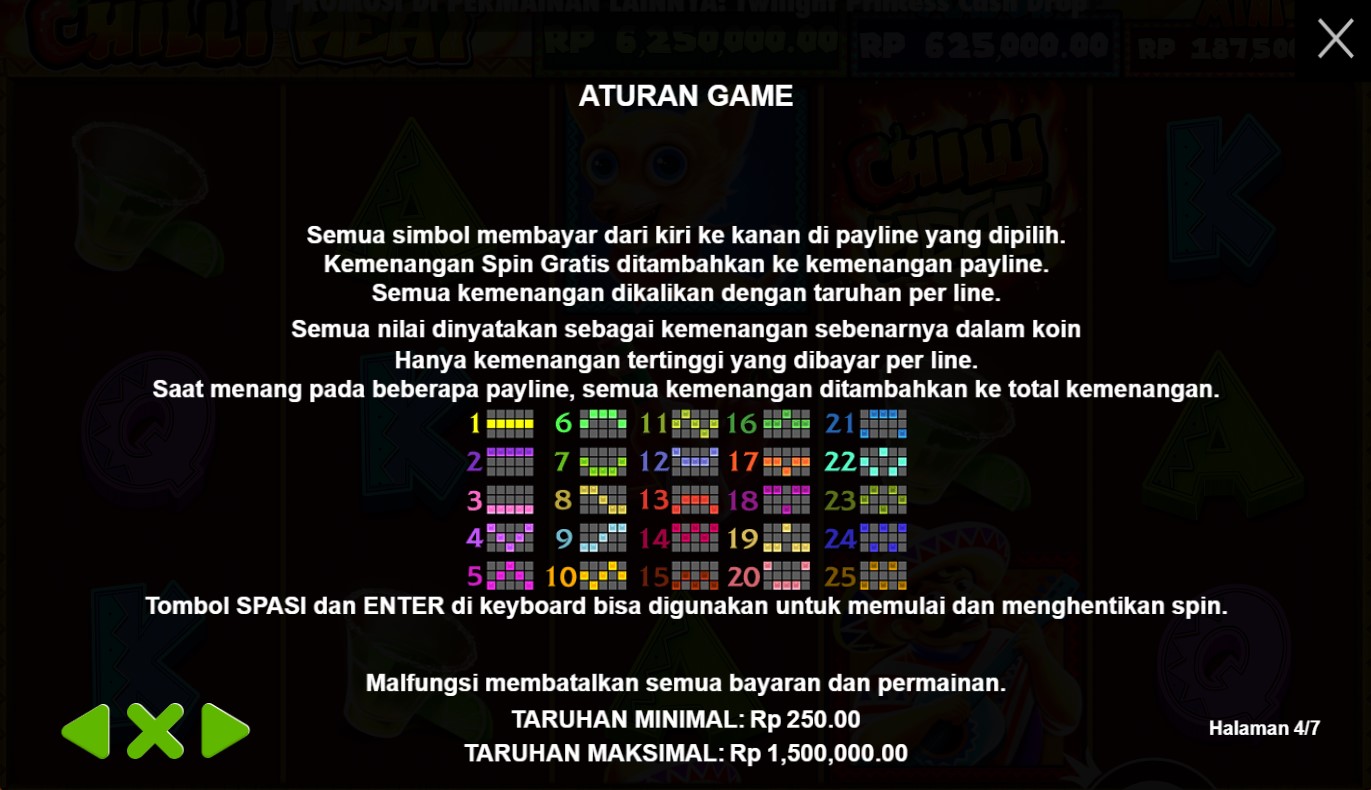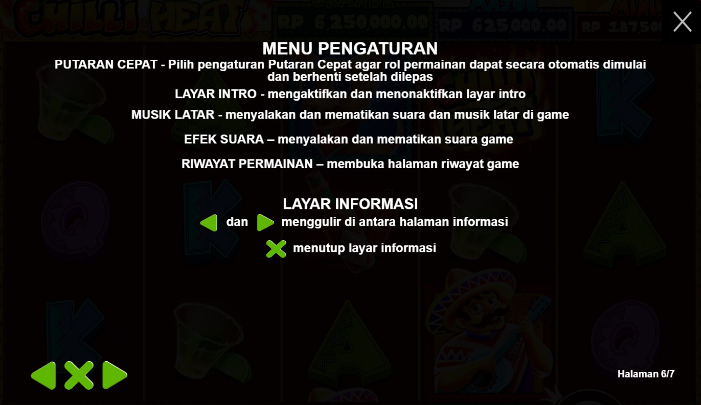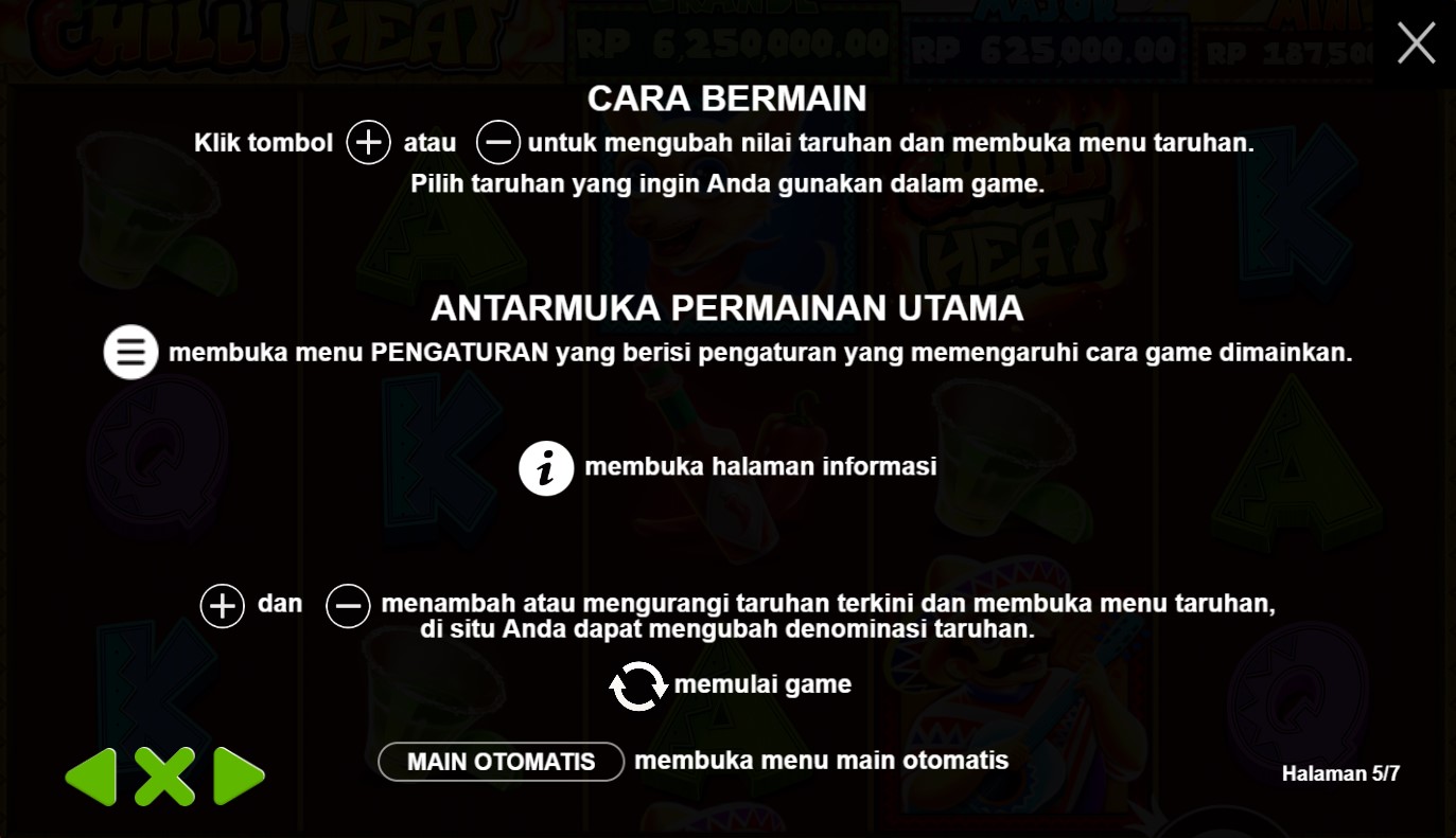 Paytable Chilli Heat adalah panduan yang mengungkapkan rahasia nilai kemenangan yang membara dalam permainan slot online terpercaya ini. Dalam paytable ini, Anda akan menemukan simbol-simbol pedas yang terkait dengan tema Meksiko, serta informasi mengenai nilai kemenangan yang terkait dengan setiap simbol tersebut. Paytable Chilli Heat memberikan wawasan yang jelas tentang potensi pembayaran yang bisa Anda raih ketika simbol-simbol ini muncul dalam kombinasi yang tepat. Setiap simbol memiliki nilai kemenangan yang tertera dalam paytable, memberikan gambaran yang jelas tentang potensi keuntungan yang bisa Anda dapatkan. Simbol-simbol dengan nilai kemenangan yang lebih tinggi menawarkan pembayaran yang lebih besar, sementara simbol-simbol dengan nilai kemenangan yang lebih rendah tetap memberikan keuntungan yang menguntungkan. Selain simbol-simbol utama, Chilli Heat juga menawarkan simbol-simbol bonus yang dapat meningkatkan peluang Anda untuk meraih kemenangan yang membara. Misalnya, simbol Wild dapat menggantikan simbol lainnya untuk membentuk kombinasi pemenang, sementara simbol Scatter dapat memicu putaran bebas dengan potensi pembayaran yang tinggi. Dengan memahami paytable Chilli Heat dengan baik, Anda dapat merencanakan strategi permainan Anda dan menargetkan simbol-simbol yang dapat membawa Anda ke kemenangan yang menggiurkan.