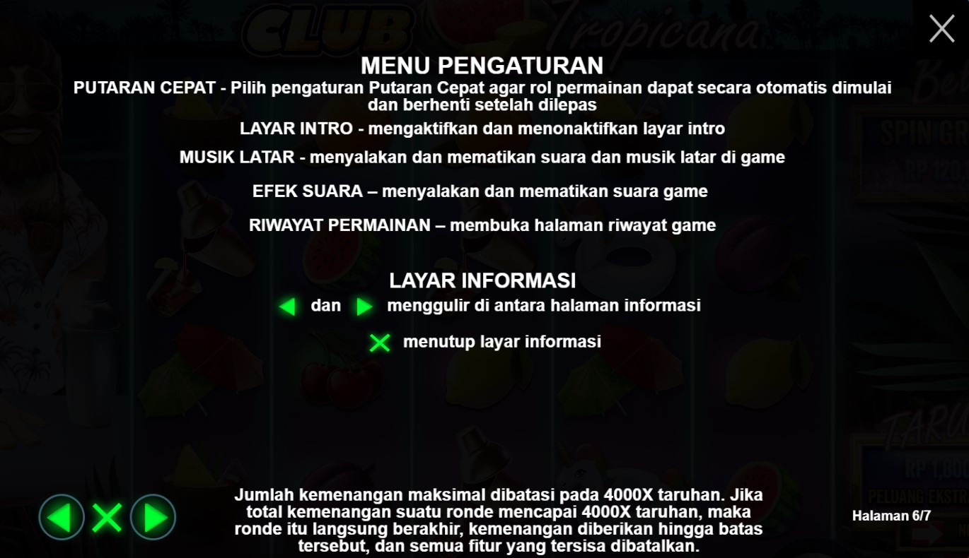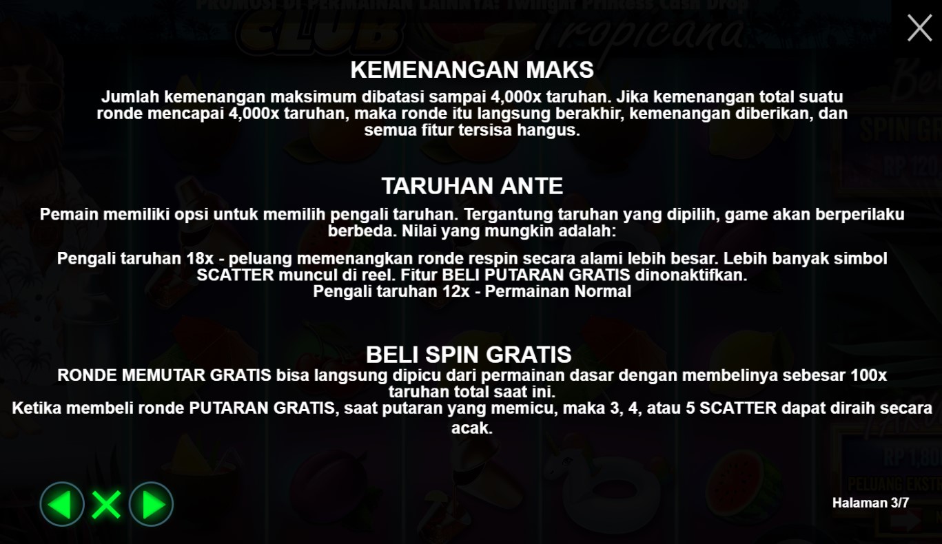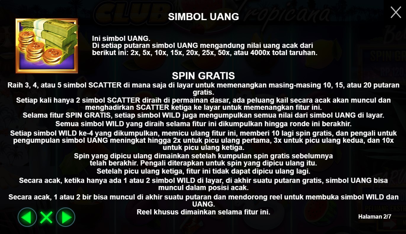 Paytable Club Tropicana adalah panduan yang akan membawa Anda ke dalam dunia yang penuh semangat liburan tropis dan memberikan gambaran lengkap tentang potensi kemenangan dalam permainan slot online terpercaya ini. Dalam paytable ini, Anda akan menemukan informasi detail tentang simbol-simbol yang terkait dengan tema liburan tropis dan nilai kemenangan yang terkait dengan masing-masing simbol tersebut. Paytable Club Tropicana memberikan panduan yang jelas tentang kombinasi-kombinasi yang menguntungkan dan peluang pembayaran yang menarik dalam permainan ini. Dalam Paytable Club Tropicana, Anda akan menemukan simbol-simbol yang menghadirkan pesona liburan tropis, seperti pohon kelapa, minuman berwarna-warni, pakaian renang, dan ikon-ikon liburan lainnya. Setiap simbol memiliki nilai kemenangan yang tertera dalam paytable, memungkinkan Anda untuk melihat secara langsung potensi keuntungan yang bisa Anda raih dari setiap kombinasi simbol. Selain itu, permainan ini juga menyediakan fitur-fitur khusus, seperti putaran bebas dan simbol-simbol Wild, yang dapat meningkatkan peluang Anda untuk meraih kemenangan yang menggairahkan.