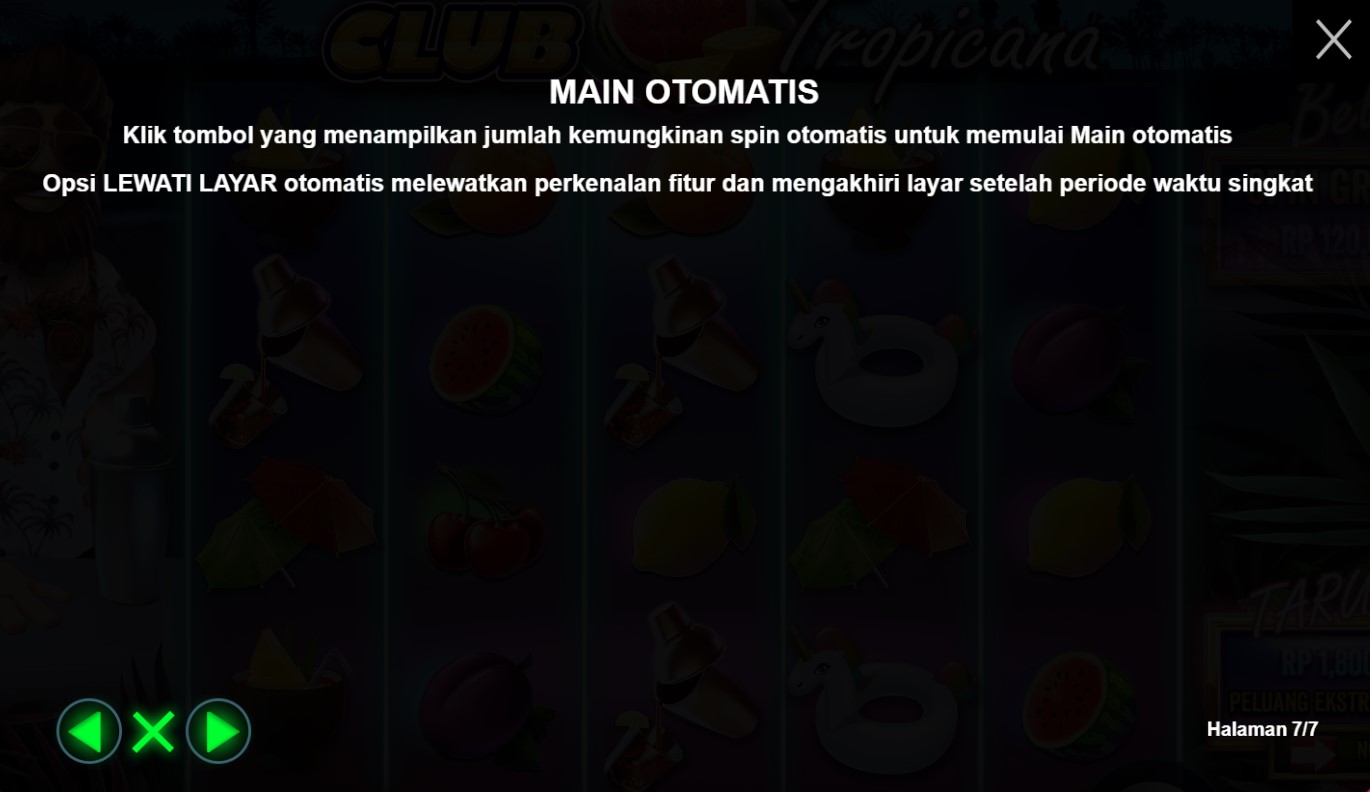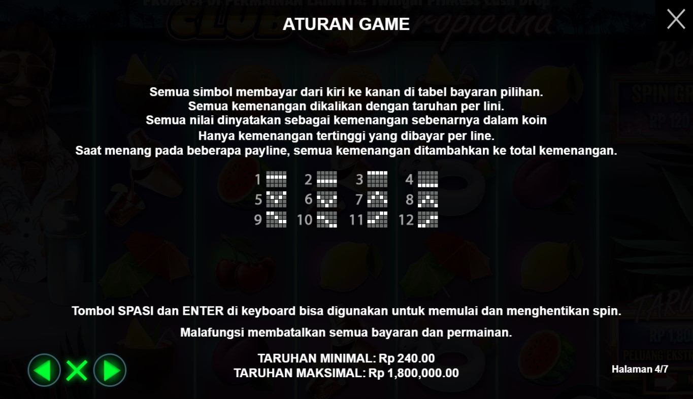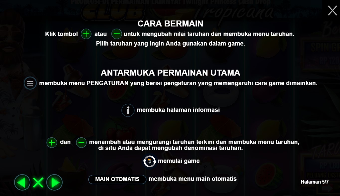 Paytable Club Tropicana adalah panduan yang akan membawa Anda ke dalam dunia yang penuh semangat liburan tropis dan memberikan gambaran lengkap tentang potensi kemenangan dalam permainan slot online terpercaya ini. Dalam paytable ini, Anda akan menemukan informasi detail tentang simbol-simbol yang terkait dengan tema liburan tropis dan nilai kemenangan yang terkait dengan masing-masing simbol tersebut. Paytable Club Tropicana memberikan panduan yang jelas tentang kombinasi-kombinasi yang menguntungkan dan peluang pembayaran yang menarik dalam permainan ini. Dalam Paytable Club Tropicana, Anda akan menemukan simbol-simbol yang menghadirkan pesona liburan tropis, seperti pohon kelapa, minuman berwarna-warni, pakaian renang, dan ikon-ikon liburan lainnya. Setiap simbol memiliki nilai kemenangan yang tertera dalam paytable, memungkinkan Anda untuk melihat secara langsung potensi keuntungan yang bisa Anda raih dari setiap kombinasi simbol. Selain itu, permainan ini juga menyediakan fitur-fitur khusus, seperti putaran bebas dan simbol-simbol Wild, yang dapat meningkatkan peluang Anda untuk meraih kemenangan yang menggairahkan.
