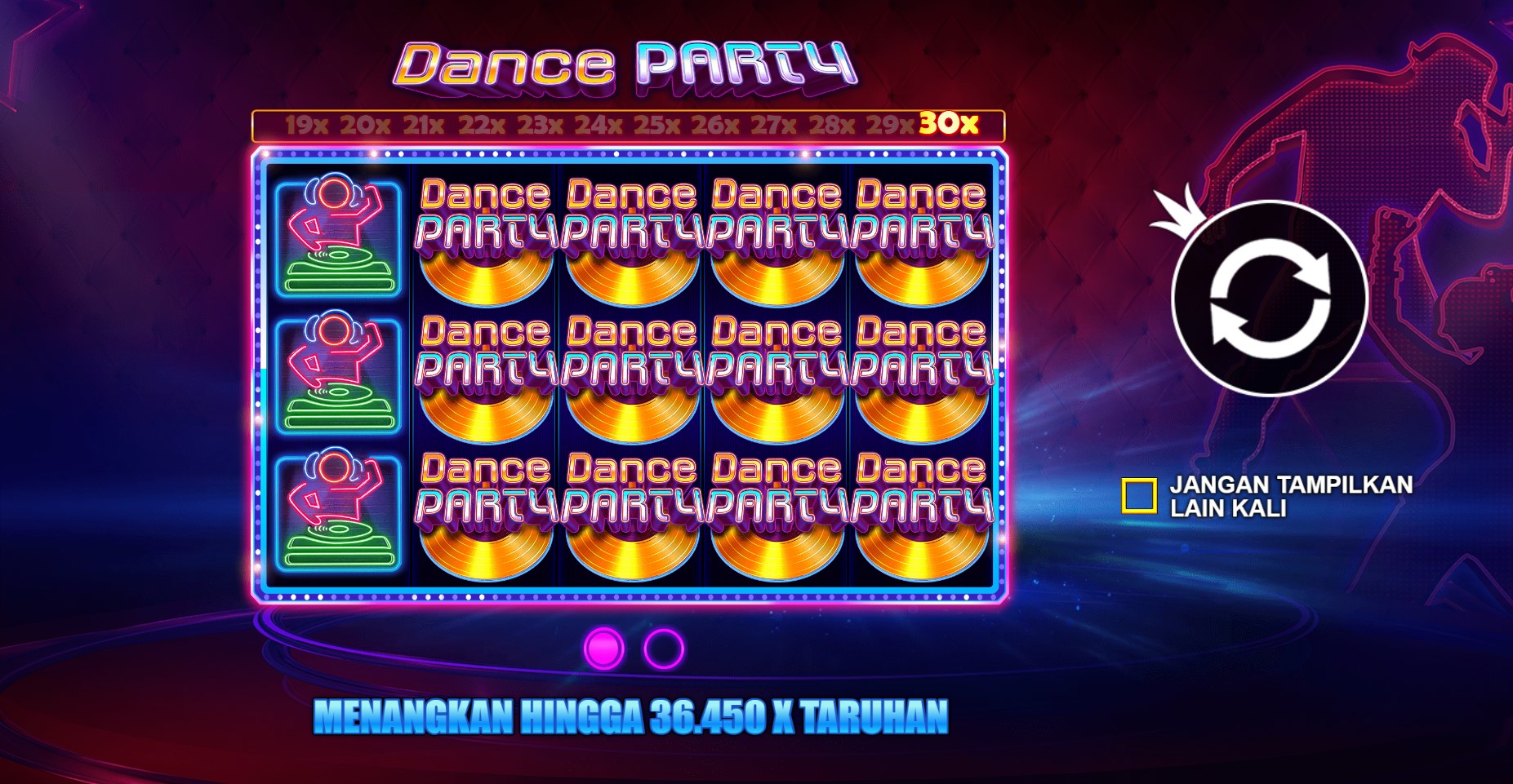 Dance Party adalah undangan eksklusif untuk bergabung dalam pesta dansa yang menggetarkan hati dan menggoyangkan gulungan slot. Begitu Anda memasuki permainan ini, langkah-langkahmu akan seiring dengan irama musik yang menghentak, dan Anda akan merasakan semangat penuh energi yang memenuhi ruangan. Mulailah menari bersama dengan karakter-karakter funky yang menghiasi gulungan slot, dan rasakan getaran euforia yang mengalir melalui setiap putaran.