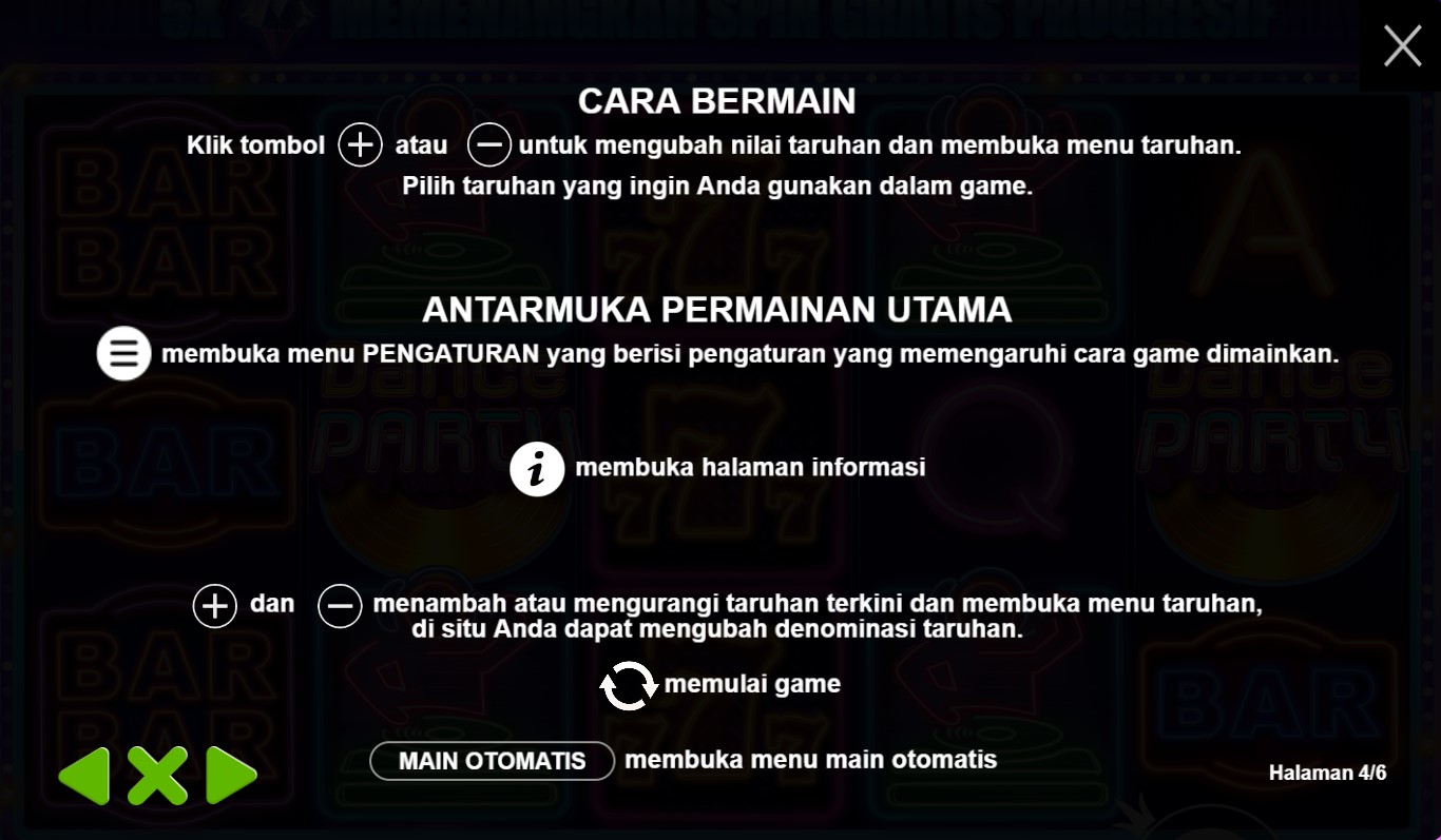 Paytable Dance Party adalah kunci untuk mengungkap rahasia simbol-simbol yang memikat dan potensi kemenangan yang menarik dalam permainan ini. Dalam paytable ini, Anda akan menemukan daftar lengkap simbol-simbol yang menghiasi gulungan slot, mulai dari sepatu dansa yang berkilauan hingga bola disko yang mempesona. Setiap simbol memiliki nilai kemenangan yang jelas tercantum dalam paytable, memberikan gambaran yang jelas tentang potensi keuntungan yang dapat Anda raih saat simbol-simbol ini membentuk kombinasi yang menang. Paytable Dance Party juga menyediakan penjelasan mendalam tentang fitur-fitur menggembirakan dalam permainan ini. Anda akan menemukan informasi tentang fitur Wild yang hadir dalam bentuk bola disko berkilauan, yang dapat menggantikan simbol-simbol lain untuk membantu Anda menciptakan kombinasi kemenangan. Selain itu, paytable juga akan mengungkapkan fitur-fitur bonus lainnya, seperti putaran Free Spins yang memikat dan pengganda kemenangan, yang akan meningkatkan peluang Anda untuk meraih kemenangan yang luar biasa.