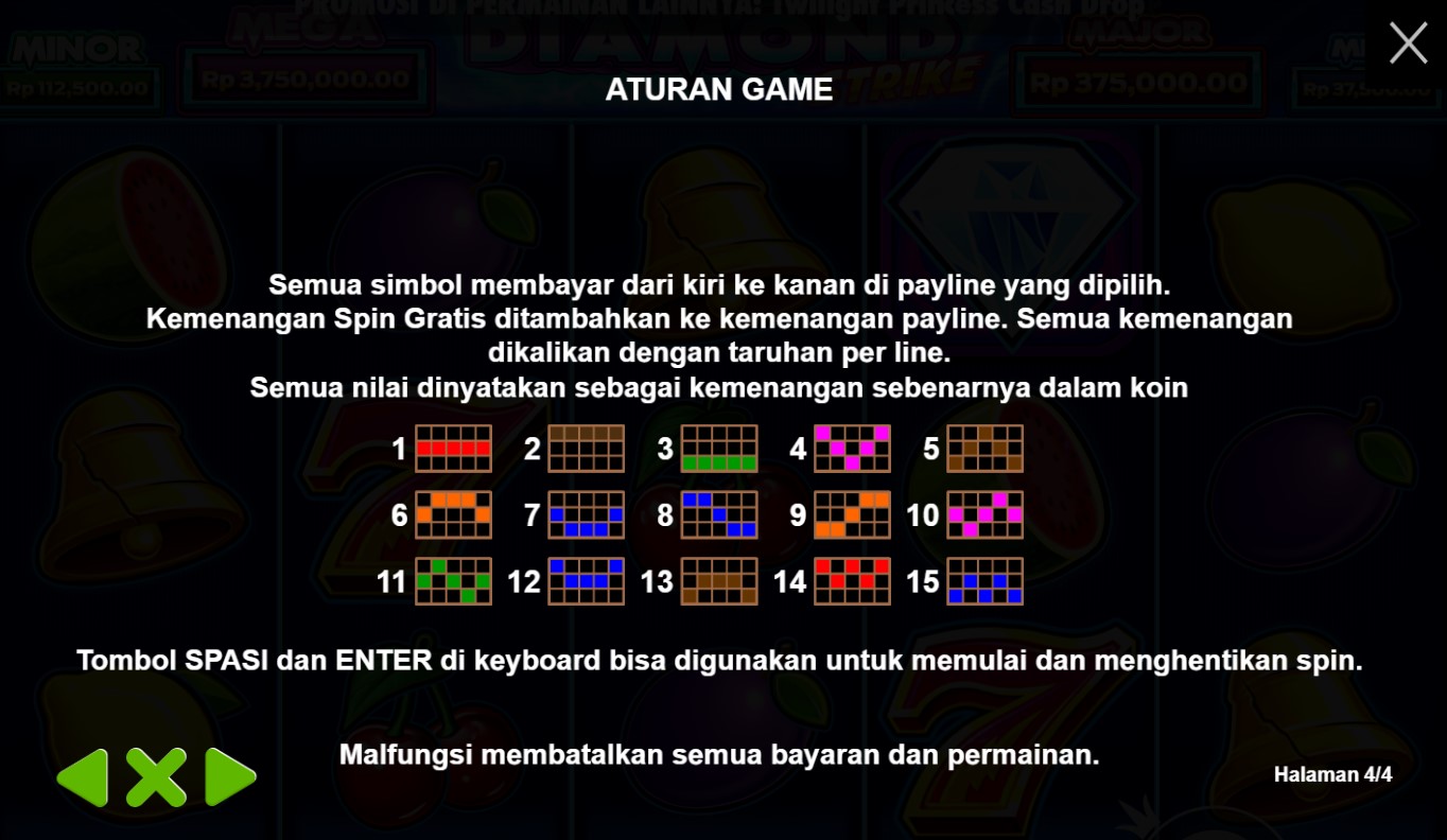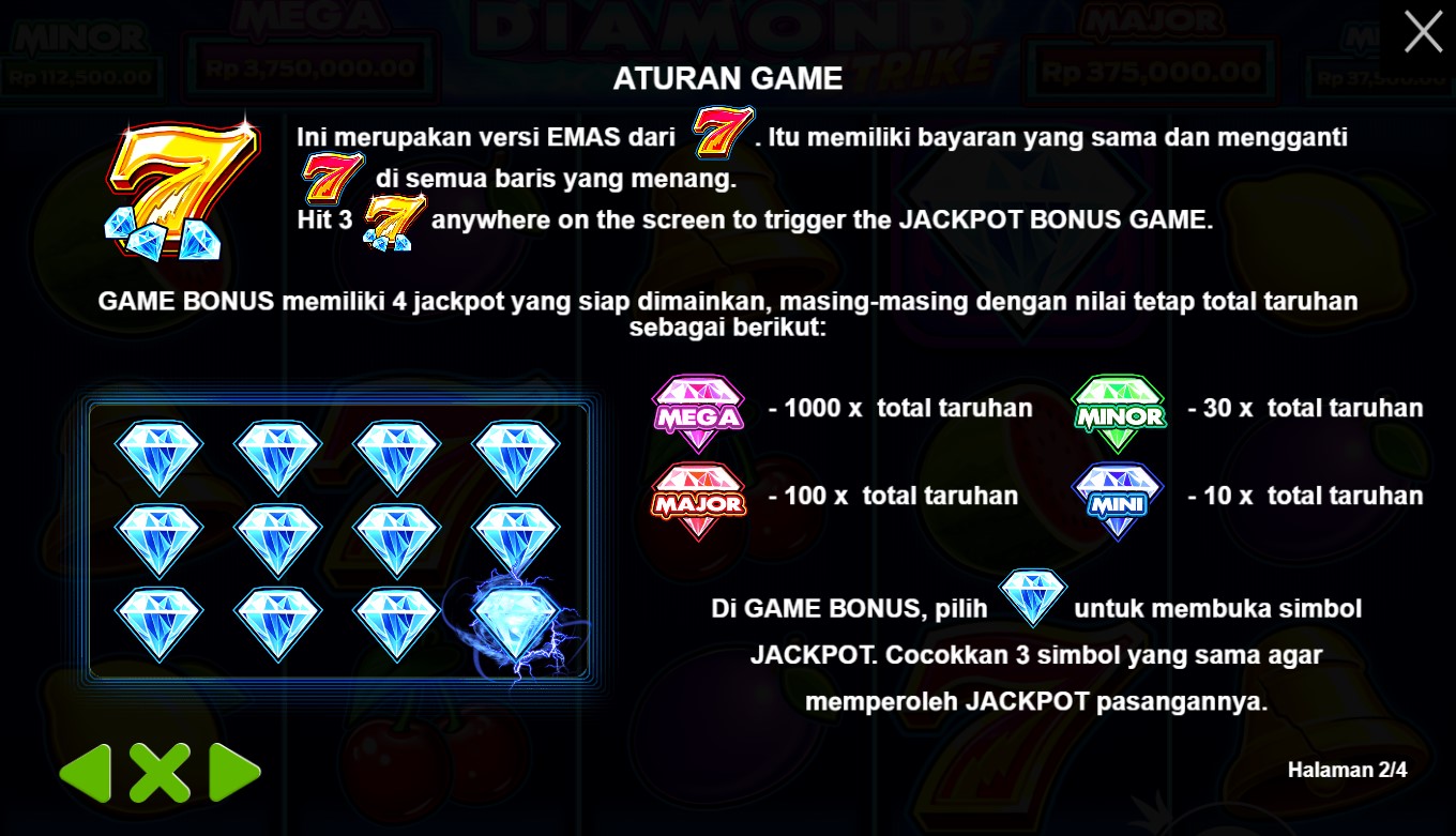 Paytable Diamond Strike adalah panduan yang lengkap dan informatif yang akan membawa Anda ke dalam dunia keajaiban berlian dan peluang kemenangan yang mengagumkan dalam permainan slot online terpercaya ini. Dalam paytable ini, Anda akan menemukan semua informasi yang Anda butuhkan untuk memahami simbol-simbol misterius dan potensi hadiah yang luar biasa dalam Diamond Strike. Paytable Diamond Strike juga akan mengungkapkan fitur-fitur menarik yang ada dalam permainan ini. Anda akan menemukan penjelasan tentang fitur Wild yang diwakili oleh simbol berlian, yang memiliki kemampuan untuk menggantikan simbol lain dan membantu Anda menciptakan kombinasi kemenangan yang mengagumkan. Selain itu, paytable juga akan mengungkapkan fitur-fitur bonus lainnya, seperti fitur Jackpot yang menarik perhatian dan memberikan kesempatan untuk meraih hadiah-hadiah yang luar biasa.