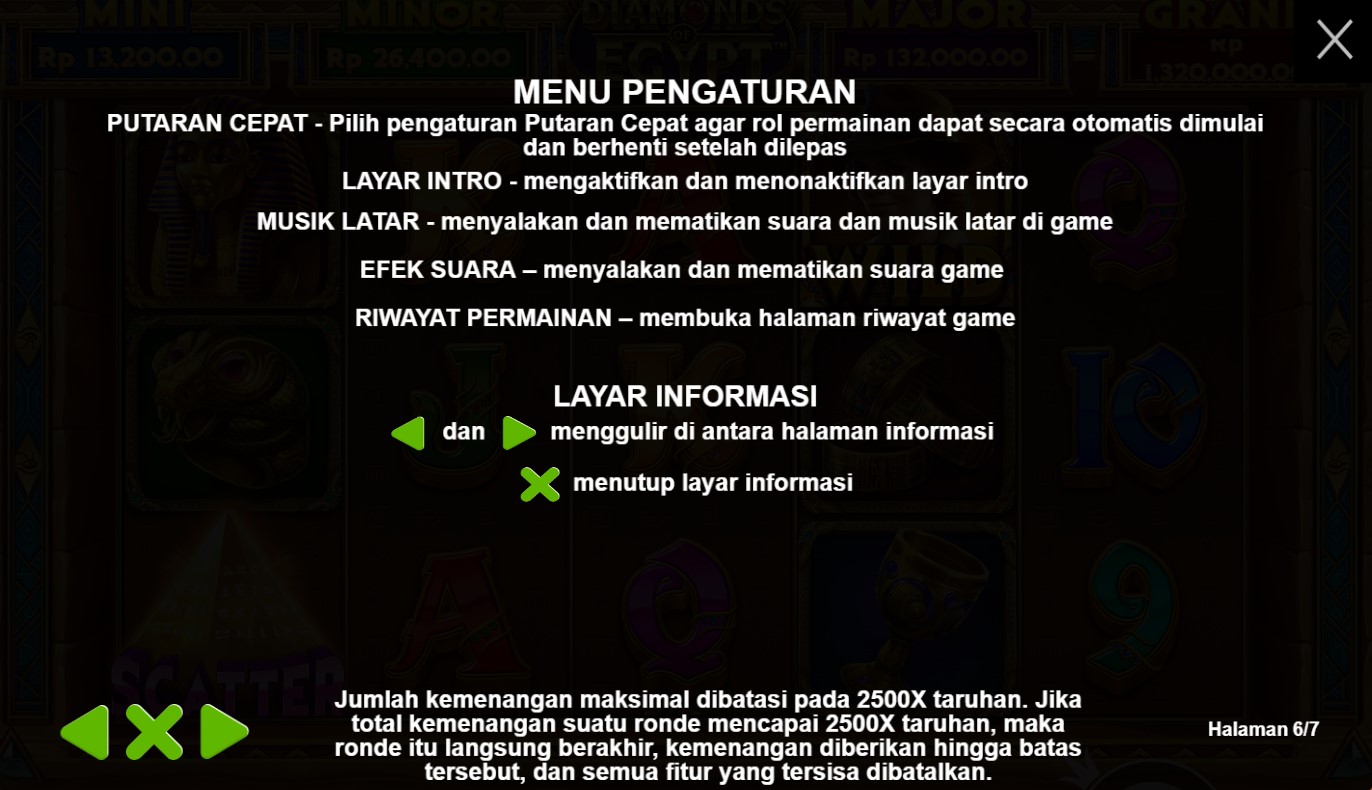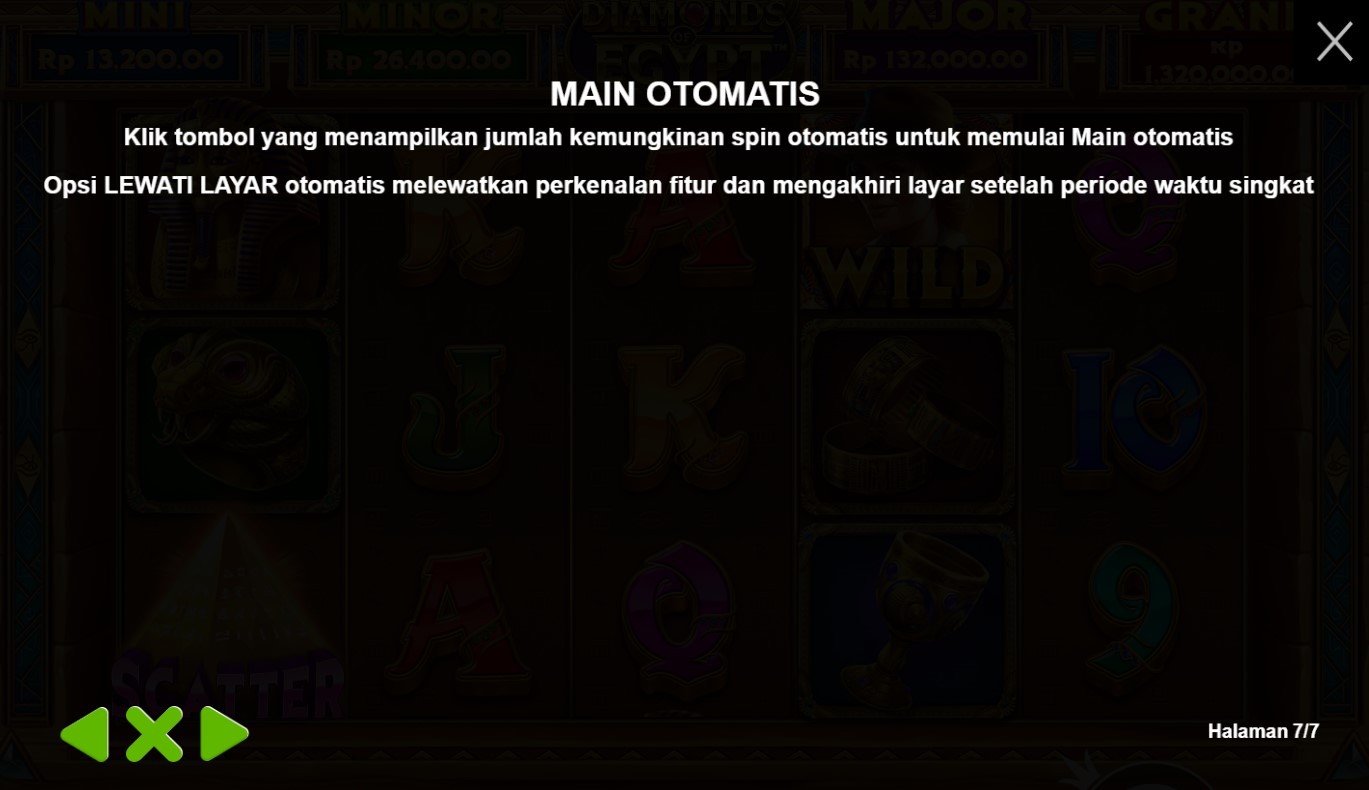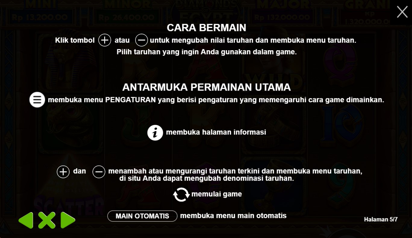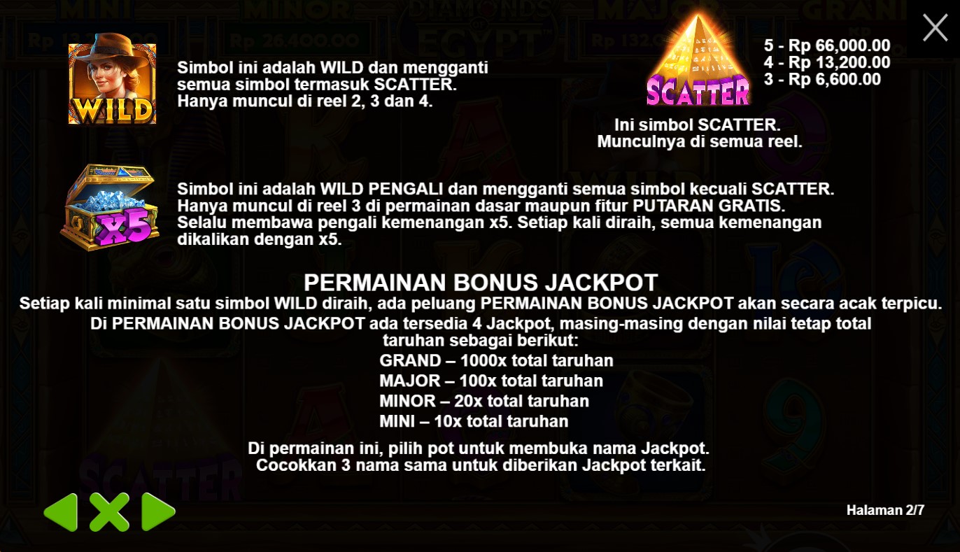 Diamonds Of Egypt adalah undangan eksklusif untuk menjelajahi kehidupan firaun dan menemukan harta karun yang tersembunyi dalam gulungan slot. Begitu Anda memasuki permainan ini, Anda akan disambut oleh pemandangan yang memukau, di mana piramida kuno menjulang tinggi dan kolom-kolom misterius terhampar di sekitarnya. Dalam perjalanan Anda, Anda akan menemui simbol-simbol yang mencerminkan kekayaan dan keindahan Mesir, seperti berlian, emas, masker firaun, dan hieroglif kuno. Setiap putaran gulungan akan membawa Anda pada petualangan yang menarik, dengan harapan meraih keberuntungan yang mengagumkan.