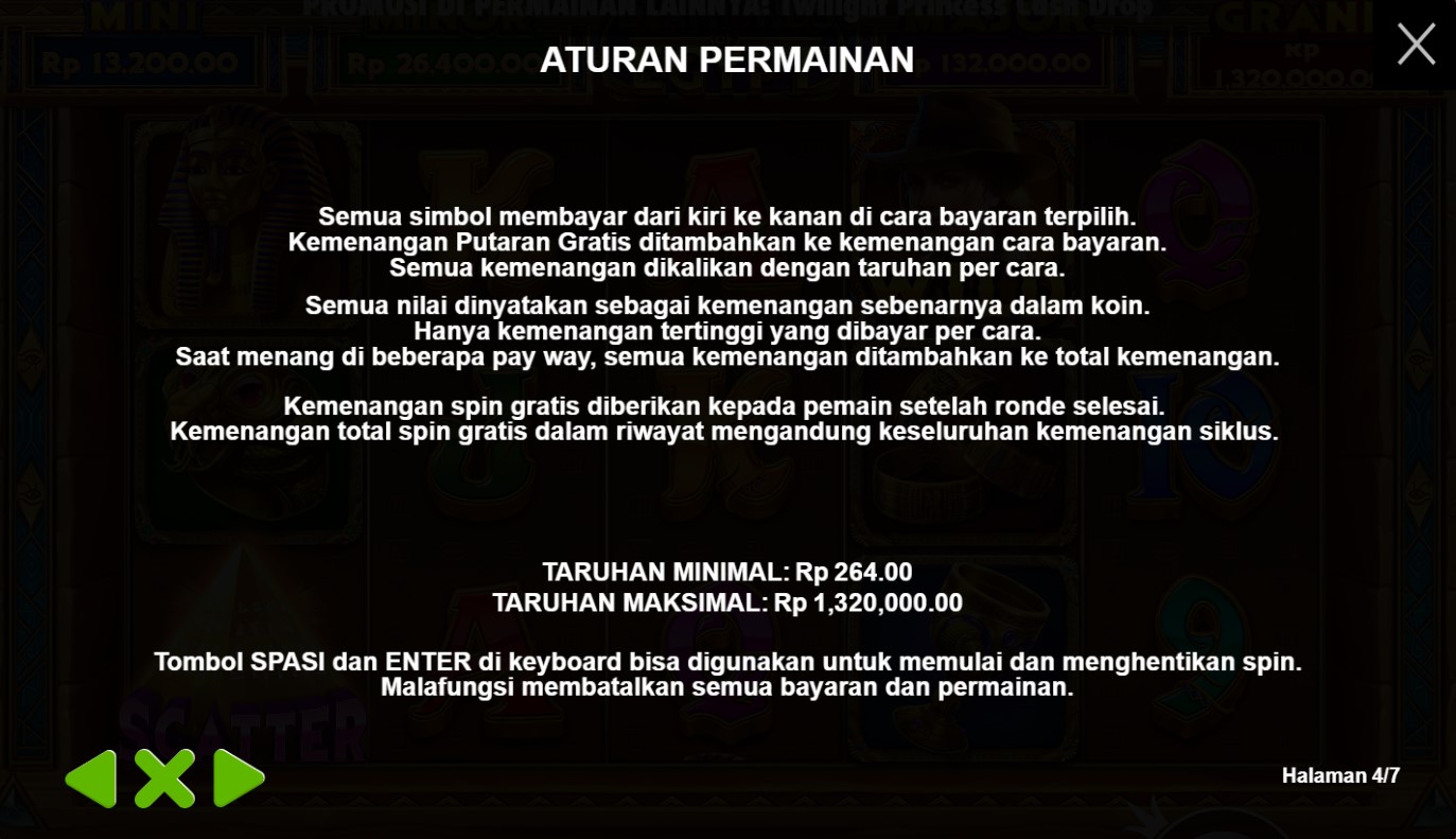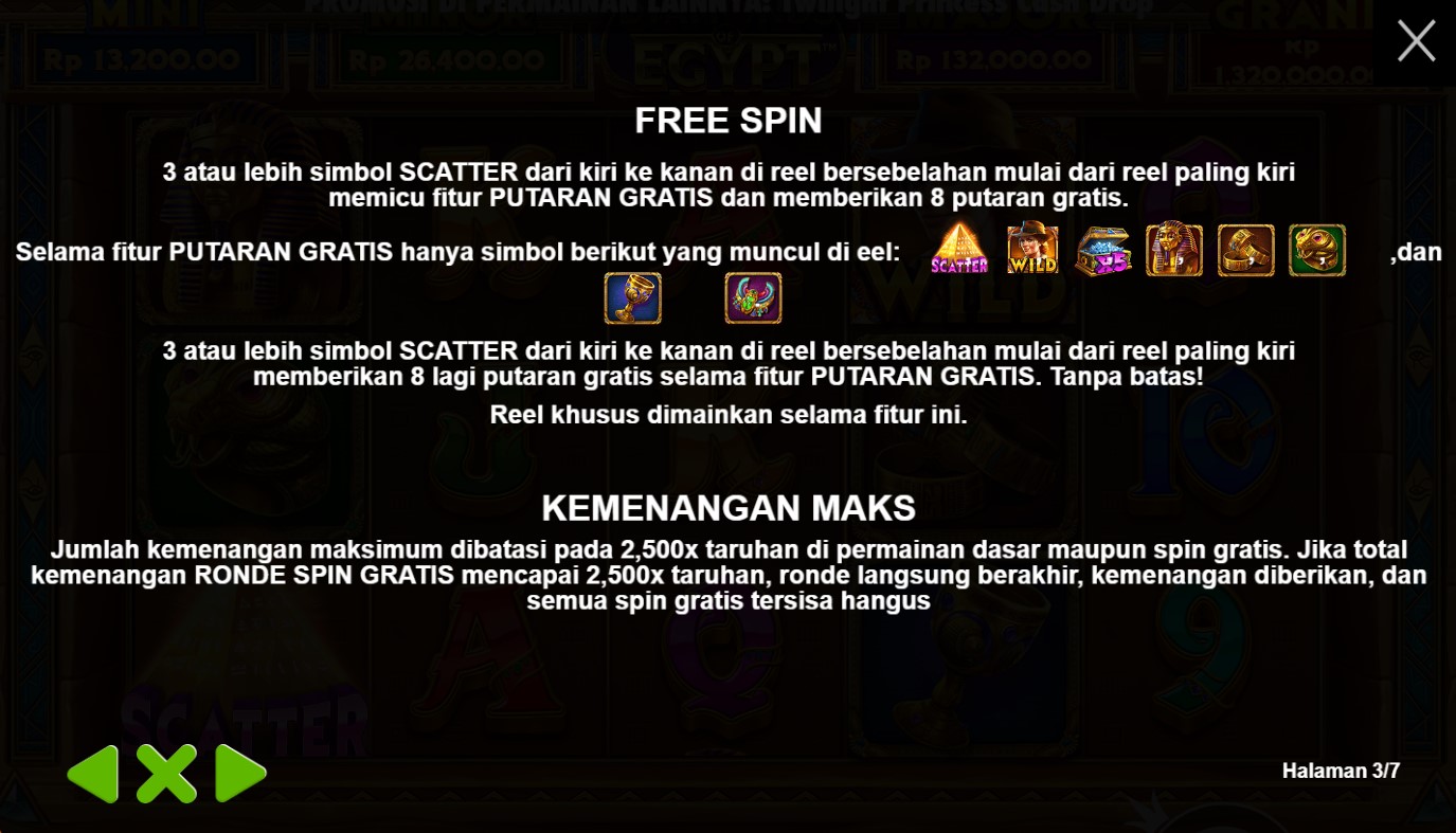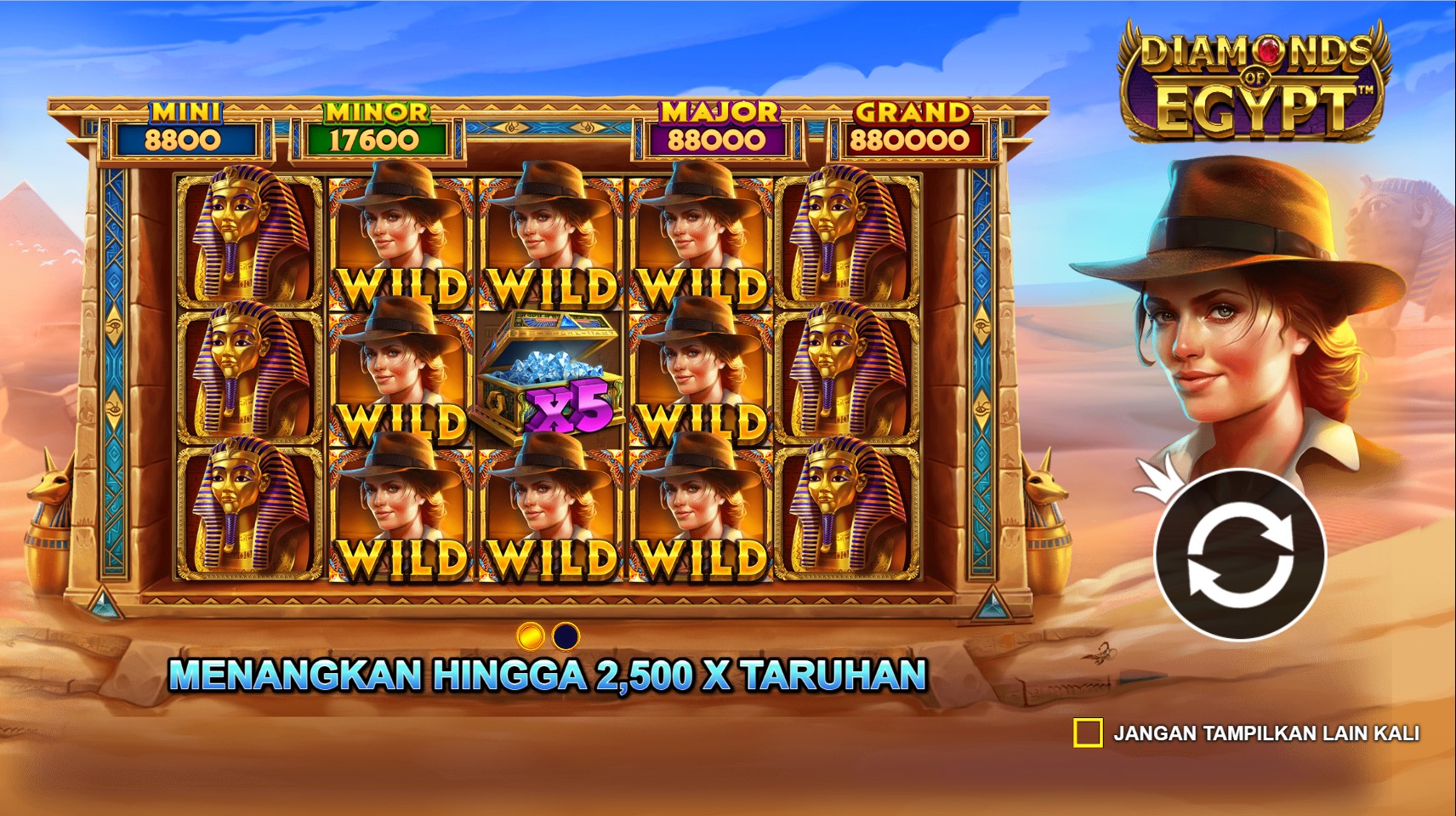Diamonds Of Egypt adalah undangan eksklusif untuk menjelajahi kehidupan firaun dan menemukan harta karun yang tersembunyi dalam gulungan slot. Begitu Anda memasuki permainan ini, Anda akan disambut oleh pemandangan yang memukau, di mana piramida kuno menjulang tinggi dan kolom-kolom misterius terhampar di sekitarnya. Dalam perjalanan Anda, Anda akan menemui simbol-simbol yang mencerminkan kekayaan dan keindahan Mesir, seperti berlian, emas, masker firaun, dan hieroglif kuno. Setiap putaran gulungan akan membawa Anda pada petualangan yang menarik, dengan harapan meraih keberuntungan yang mengagumkan.