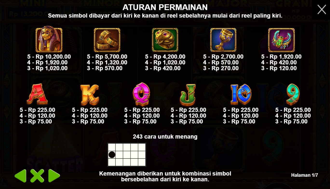 Paytable Diamonds Of Egypt adalah panduan lengkap yang akan membuka gerbang menuju dunia keajaiban dan kekayaan dalam permainan slot online terpercaya ini. Dalam paytable ini, Anda akan menemukan semua informasi yang Anda butuhkan untuk memahami simbol-simbol misterius dan potensi kemenangan yang spektakuler dalam Diamonds Of Egypt. Paytable Diamonds Of Egypt juga menyediakan penjelasan mendalam tentang fitur-fitur menggembirakan dalam permainan ini. Anda akan menemukan informasi tentang fitur Wild yang hadir dalam bentuk berlian yang berkilauan, yang dapat menggantikan simbol-simbol lain untuk membantu Anda menciptakan kombinasi kemenangan yang luar biasa. Selain itu, paytable juga akan mengungkapkan fitur-fitur bonus lainnya, seperti putaran Free Spins yang memikat dan pengganda kemenangan, yang akan meningkatkan peluang Anda untuk meraih kemenangan yang spektakuler. Dengan memahami Paytable Diamonds Of Egypt dengan baik, Anda akan dapat mengalami petualangan tak terlupakan dalam dunia kekayaan dan keajaiban Mesir kuno. Anda akan mengetahui nilai kemenangan yang terkait dengan masing-masing simbol serta fitur-fitur yang dapat membantu Anda meraih kemenangan yang mengagumkan. Paytable ini akan menjadi panduan yang tak ternilai bagi Anda saat Anda menjelajahi gulungan slot dan meraih kesuksesan dalam permainan slot online terpercaya Diamonds Of Egypt.