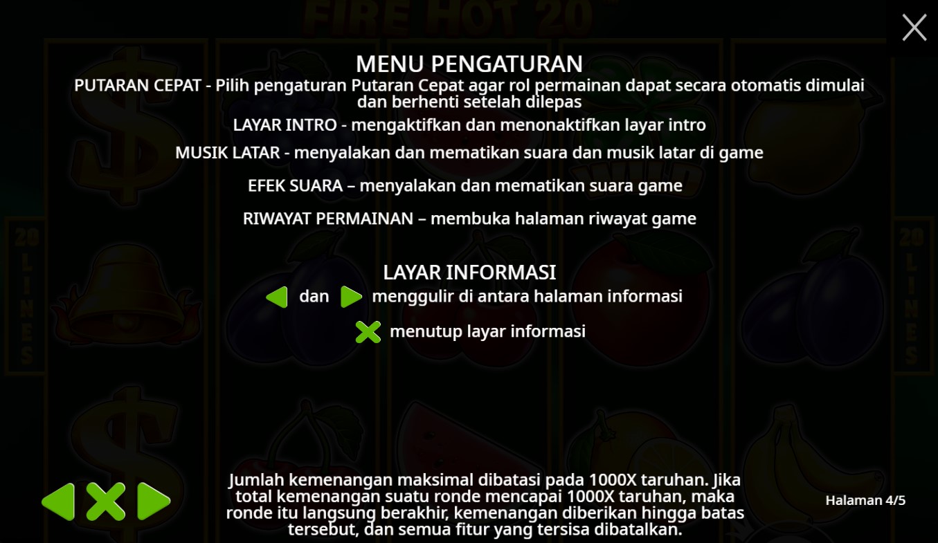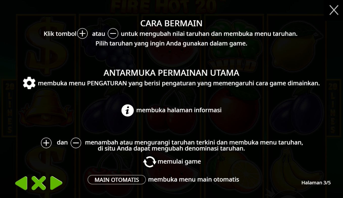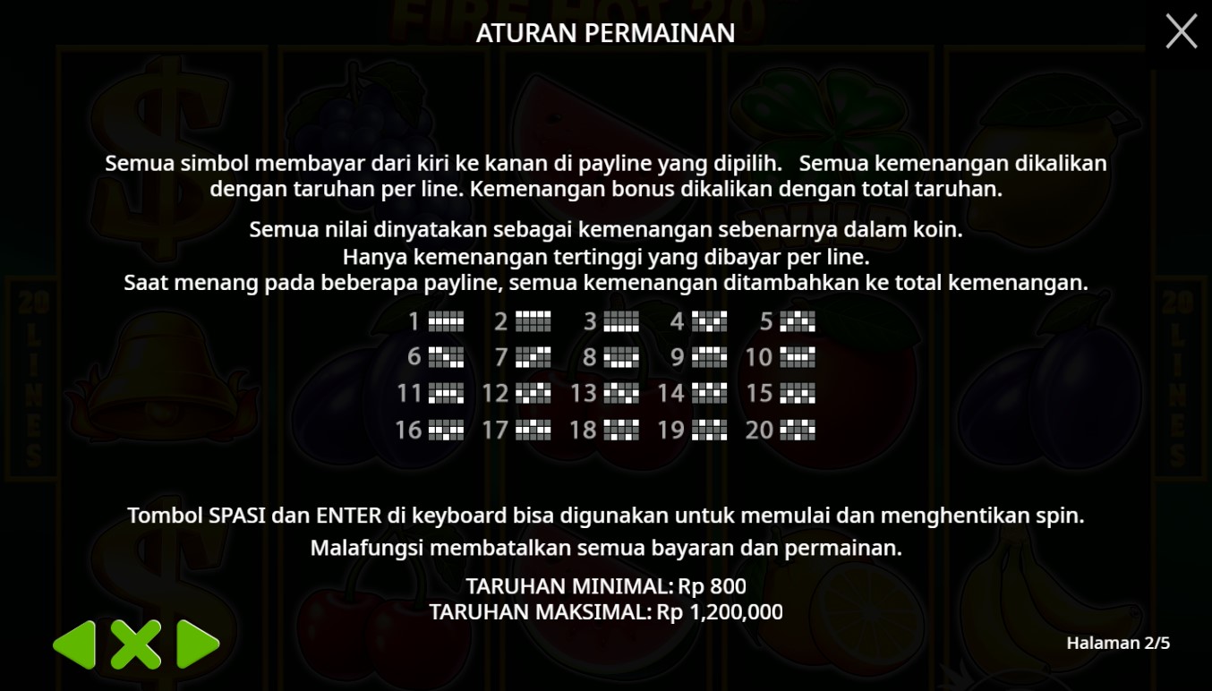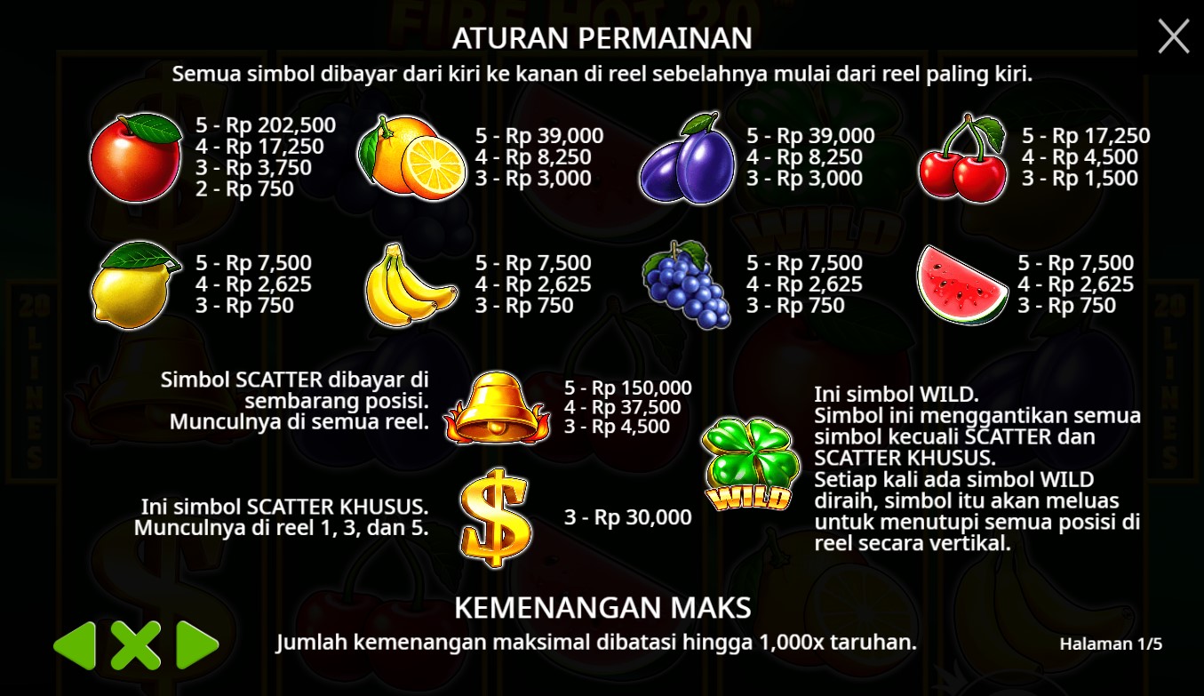 Paytable Slot Online Fire Hot 20 adalah jantung dari pengalaman bermain yang memukau pada permainan "Fire Hot 20!! Slot Online Terpercaya - Pragmatic Play". Simbol-simbol klasik yang kaya akan makna hadir untuk memberikan pemain kesempatan meraih kemenangan spektakuler. Dalam paytable game ini, Anda akan menemukan simbol-simbol tradisional yang sudah tidak asing lagi, seperti Buah-buahan, Lonceng, dan Tujuh. Simbol Buah-buahan yang segar dan menggoda akan menjadi simbol tertinggi, menawarkan hadiah berlipat jika berhasil membentuk kombinasi pemenang. Simbol Lonceng yang elegan juga dapat memberikan hadiah yang menggiurkan.