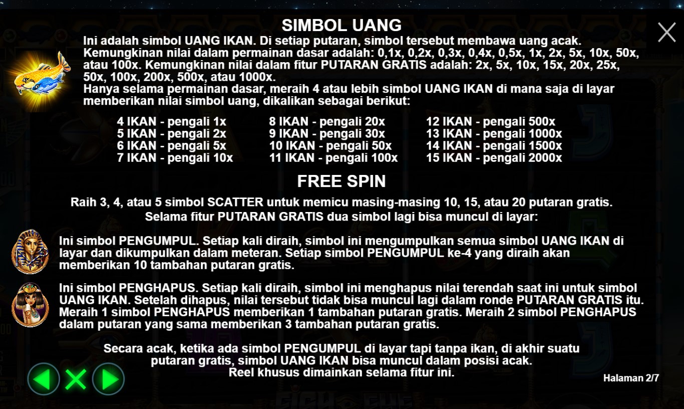 Paytable Fish Eye adalah panduan tak ternilai bagi para pemain slot online yang mencari pengalaman bermain terpercaya dan mengasyikkan di Fish Eye. Dalam permainan ini, Anda akan diajak untuk menyelam ke dalam lautan yang memukau dan menemukan kekayaan yang tersembunyi di dasar laut dengan bantuan simbol-simbol yang menarik. Simbol ini mampu menggantikan simbol lain dalam rangkaian kombinasi pemenang, membantu Anda meraih lebih banyak kemenangan. Selain itu, permainan ini juga menawarkan simbol Scatter yang dapat memicu fitur "Free Spins". Ketika Anda berhasil mengumpulkan simbol Scatter secara cukup, Anda akan diberikan putaran gratis yang memungkinkan Anda menjelajahi lautan dalam dengan kesempatan untuk meraih hadiah-hadiah yang luar biasa.