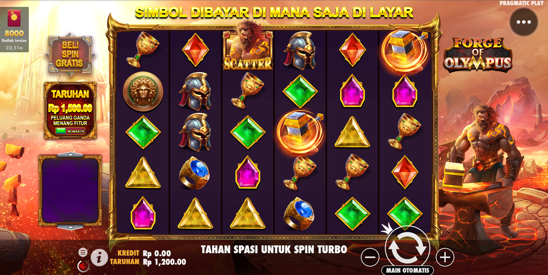Forge Of Olympus adalah permainan slot online terpercaya yang membawa Anda ke dalam dunia mitologi Yunani yang epik. Dikembangkan oleh Pragmatic Play, permainan ini menampilkan grafis yang memukau, simbol-simbol dewa yang kuat, dan fitur-fitur seru yang akan menghidupkan kisah para dewa dan dewi. Bersiaplah untuk merasakan kekuatan Olympus dan mengejar kemenangan yang luar biasa dalam Forge Of Olympus!