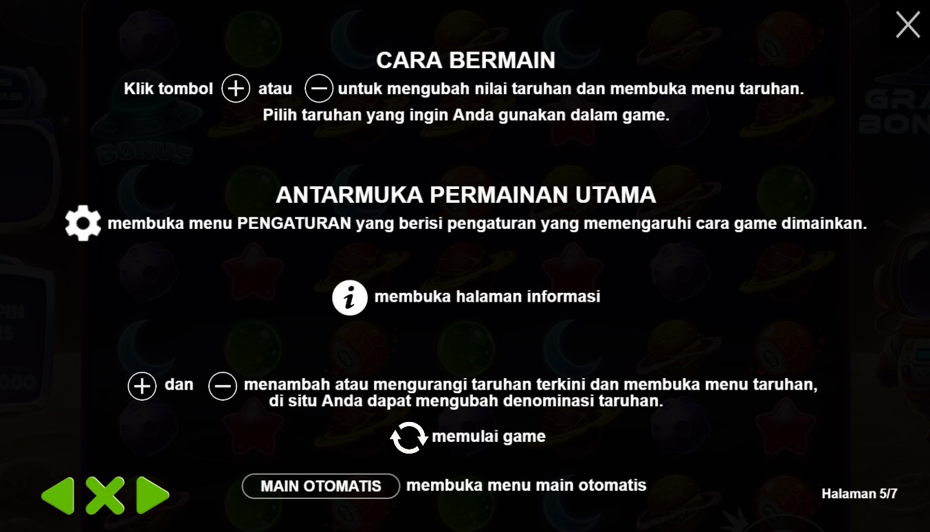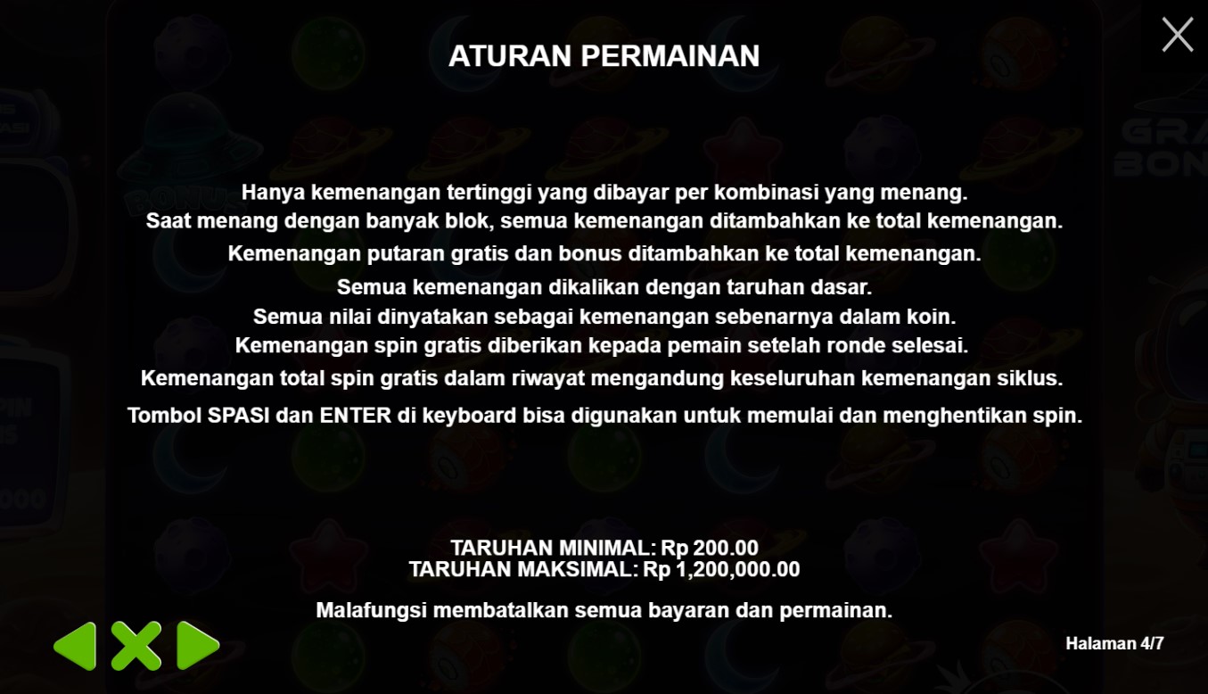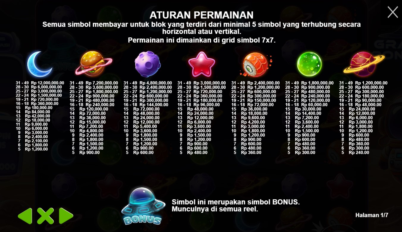 Paytable Slot Online Gravity Bonanza adalah panduan yang memperlihatkan simbol-simbol yang akan membawa pemain ke kemenangan besar. Simbol-simbol yang hadir dalam permainan ini mencakup berbagai elemen yang menghadirkan nuansa gravitasi yang unik, seperti planet, bintang, meteor, dan asteroid. Selain itu, simbol-simbol klasik seperti angka dan huruf juga turut hadir dalam permainan ini, memberikan kombinasi yang menarik dan beragam. Simbol Wild, yang biasanya digambarkan sebagai lubang hitam, berperan sebagai pengganti simbol lain untuk membentuk kombinasi kemenangan yang menguntungkan. Sedangkan simbol Scatter, yang sering kali diwakili oleh gambar pesawat luar angkasa, dapat memicu fitur bonus dan putaran gratis yang menggiurkan. Dengan memahami nilai dan fungsi dari setiap simbol, pemain dapat merencanakan strategi permainan mereka dengan lebih baik dan meningkatkan peluang untuk meraih kemenangan besar di Gravity Bonanza. Segera bergabunglah dalam petualangan gravitasi yang mengasyikkan ini dan rasakan sensasi kemenangan yang luar biasa dengan Gravity Bonanza, slot online terpercaya dari Pragmatic Play.