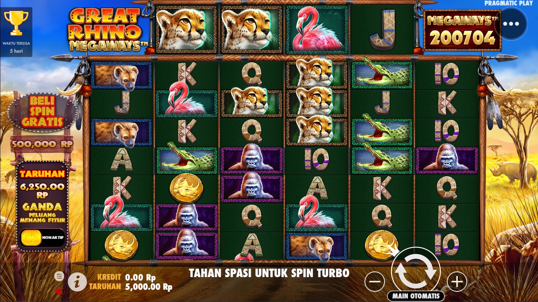 Great Rhino Megaways adalah petualangan tak terlupakan di dunia slot online terpercaya dari Pragmatic Play, di mana Anda akan merasakan keajaiban Megaways dan keberuntungan liar di antara binatang-binatang yang memukau. Dalam permainan ini, Anda akan dihadapkan pada kegembiraan tak terbatas dengan fitur Megaways yang memberikan ribuan cara berbeda untuk menang setiap kali gulungan berputar. Great Rhino Megaways menghadirkan simbol-simbol binatang yang mengagumkan seperti badak, singa, kuda nil, dan lainnya yang mengisi gulungan permainan, menciptakan atmosfer yang penuh dengan kekuatan dan pesona alam liar. Anda akan terpesona oleh keindahan lanskap savana yang ditampilkan dengan detail yang memukau.