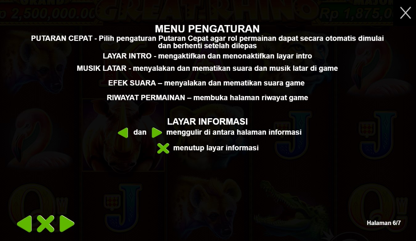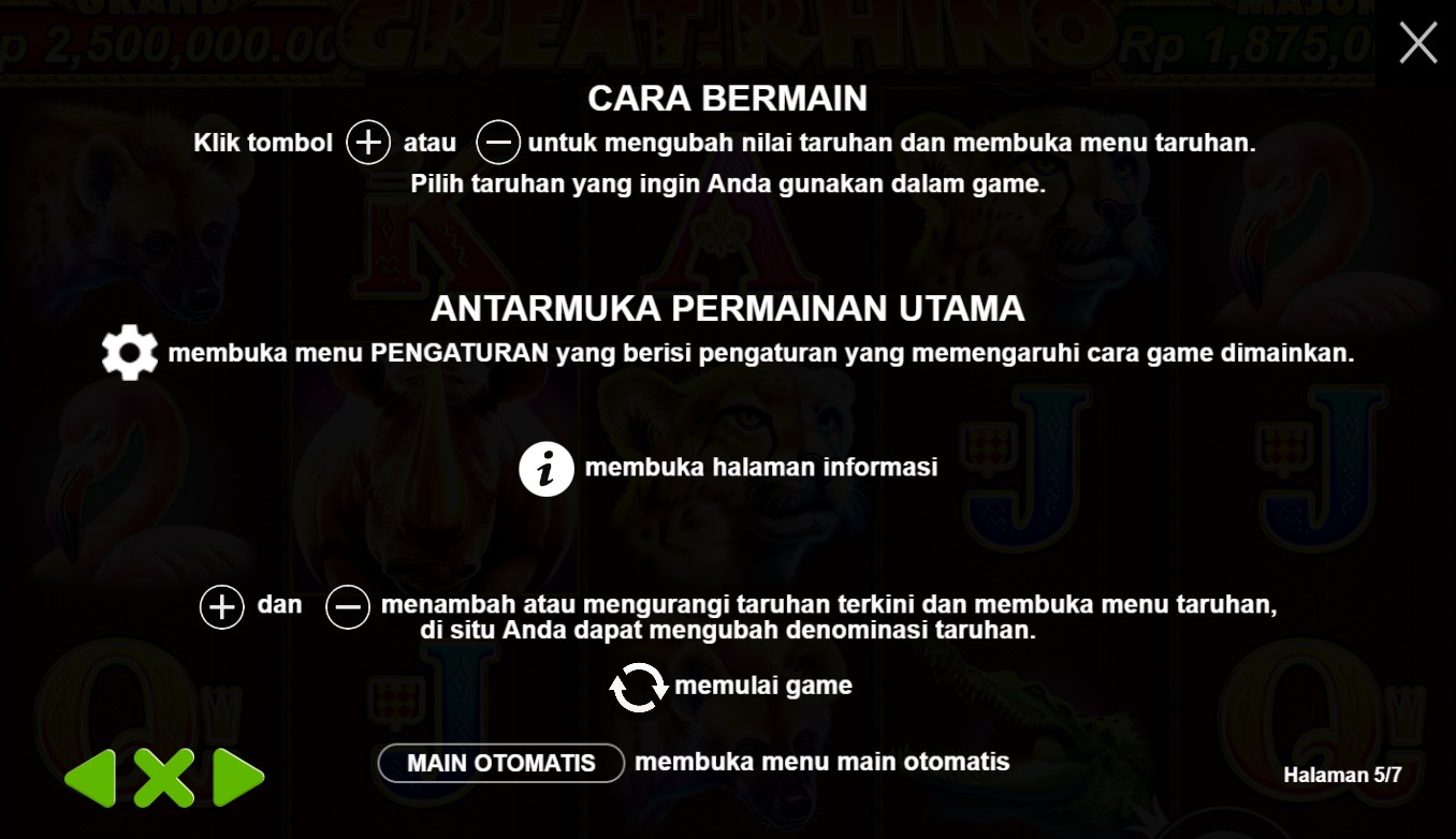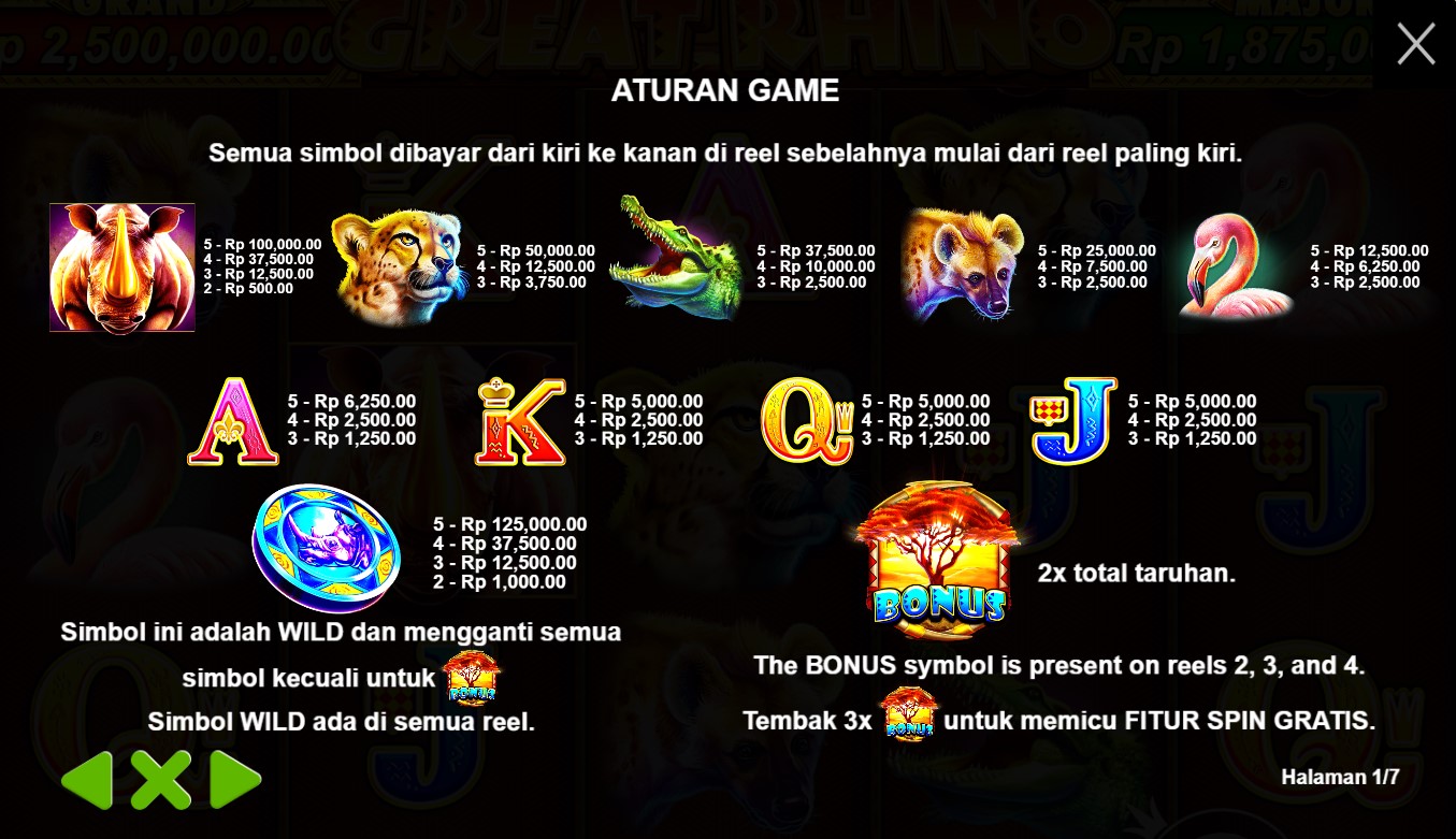 Paytable Great Rhino merupakan panduan yang membantu Anda mengungkap nilai simbol binatang yang kuat dan peluang kemenangan yang hebat di padang savana dalam slot online terpercaya ini. Dalam paytable ini, Anda akan menemukan informasi yang jelas dan terperinci tentang simbol-simbol yang menggambarkan rusa besar, singa gagah, dan hewan-hewan lain yang mempesona. Dengan memahami paytable ini, Anda dapat melacak simbol-simbol bernilai tinggi, merencanakan strategi taruhan Anda, dan memaksimalkan potensi kemenangan Anda dalam petualangan di alam liar. Temukan nilai-nilai simbol yang menakjubkan dalam Paytable Slot Online Terpercaya Great Rhino dan siapkan diri Anda untuk mengarungi padang savana dengan kepercayaan diri dan memburu kemenangan yang spektakuler.