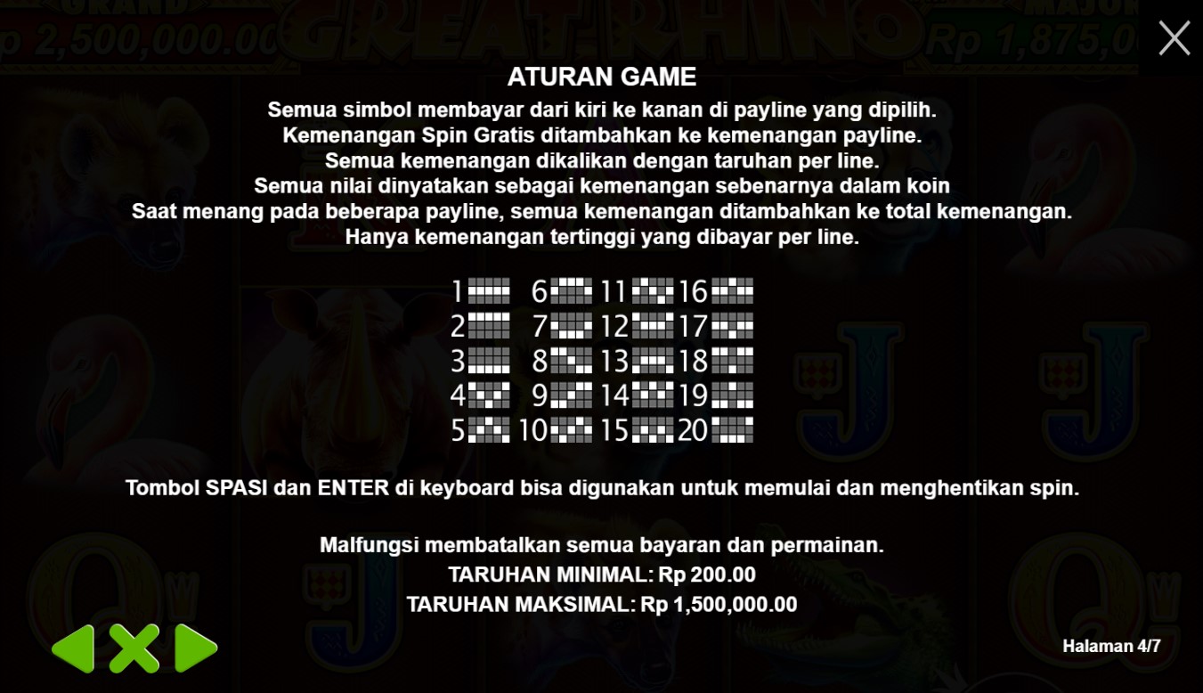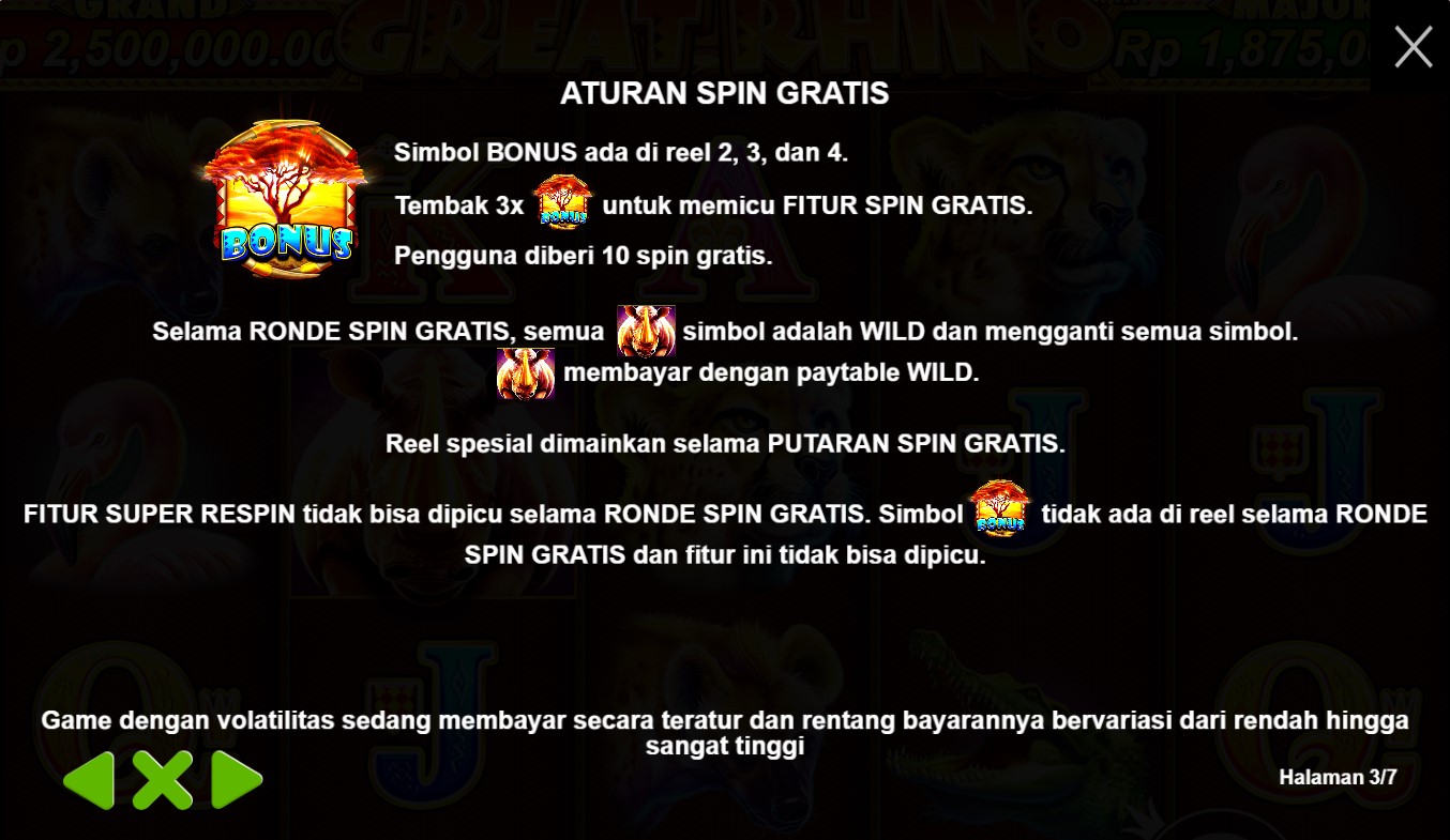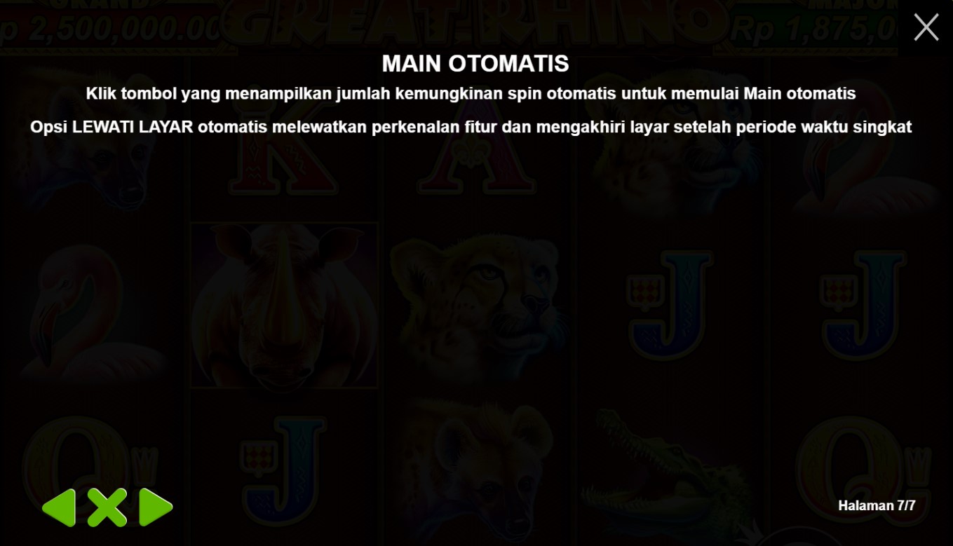 Paytable Great Rhino merupakan panduan yang membantu Anda mengungkap nilai simbol binatang yang kuat dan peluang kemenangan yang hebat di padang savana dalam slot online terpercaya ini. Dalam paytable ini, Anda akan menemukan informasi yang jelas dan terperinci tentang simbol-simbol yang menggambarkan rusa besar, singa gagah, dan hewan-hewan lain yang mempesona. Dengan memahami paytable ini, Anda dapat melacak simbol-simbol bernilai tinggi, merencanakan strategi taruhan Anda, dan memaksimalkan potensi kemenangan Anda dalam petualangan di alam liar. Temukan nilai-nilai simbol yang menakjubkan dalam Paytable Slot Online Terpercaya Great Rhino dan siapkan diri Anda untuk mengarungi padang savana dengan kepercayaan diri dan memburu kemenangan yang spektakuler.