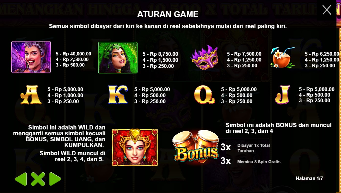 Paytable Heart Of Rio adalah panduan yang mengungkap simbol-simbol yang memikat dan potensi kemenangan dalam permainan slot online terpercaya ini. Dalam suasana yang dipenuhi semangat samba dan keceriaan kota Rio de Janeiro, permainan ini, dikembangkan oleh Pragmatic Play, menghadirkan grafis yang menakjubkan dan simbol-simbol yang mencerminkan keindahan budaya Brasil. Dalam Paytable Heart Of Rio, Anda akan menemukan simbol-simbol yang meliputi penari samba yang elegan, kostum berwarna-warni, alat musik perkusi yang menggembirakan, serta simbol ikonis seperti Rio Christ the Redeemer. Setiap simbol memiliki nilai yang berbeda, dan kombinasi yang tepat akan membawa Anda pada hadiah-hadiah yang mengesankan. Fitur-fitur bonus seperti putaran gratis dan simbol Wild akan meningkatkan peluang Anda untuk meraih kemenangan yang memikat. Dengan melihat Paytable Heart Of Rio, Anda akan memahami dengan lebih baik bagaimana memanfaatkan potensi kemenangan dan merasakan keceriaan serta semangat dalam permainan slot online ini.