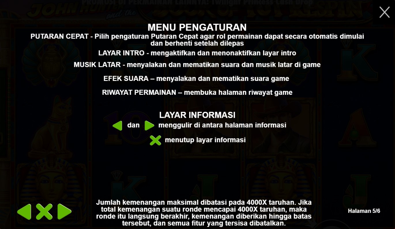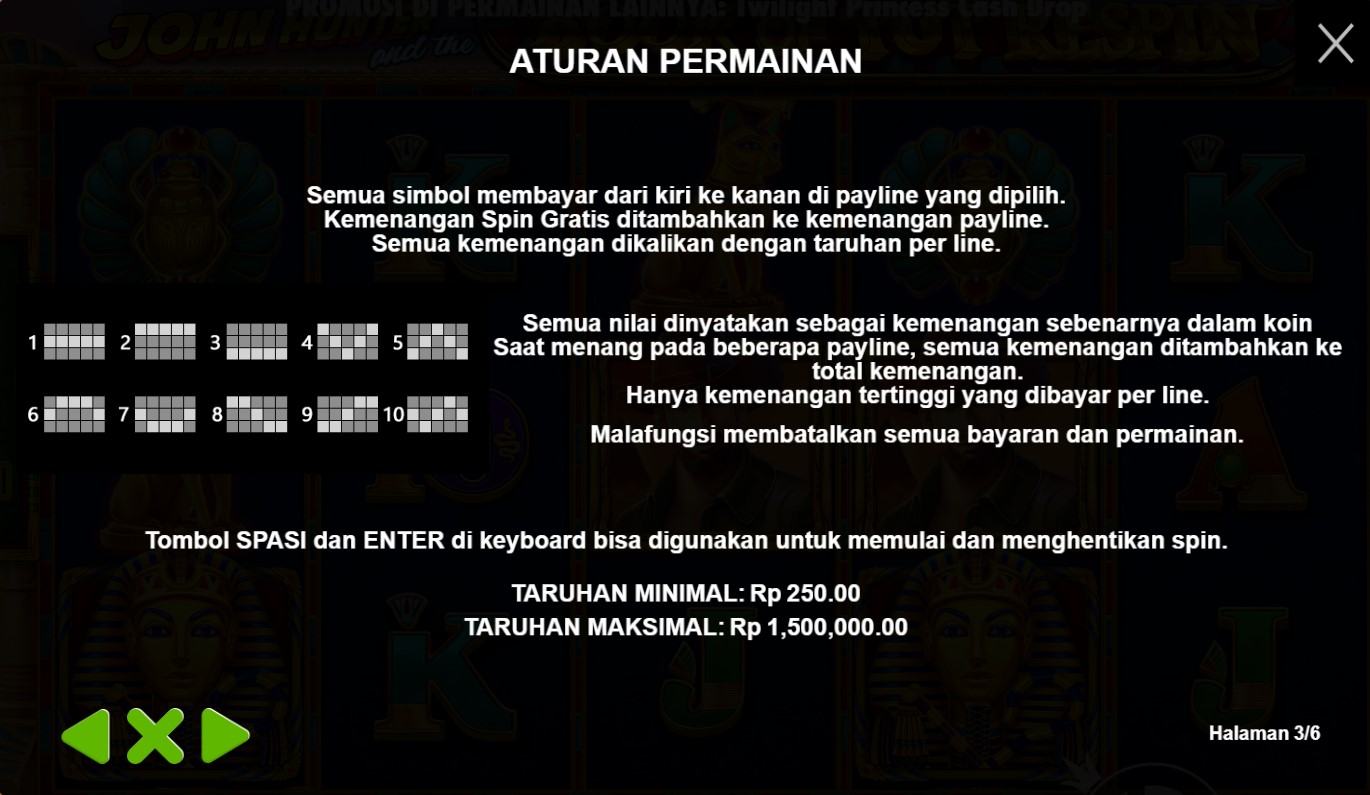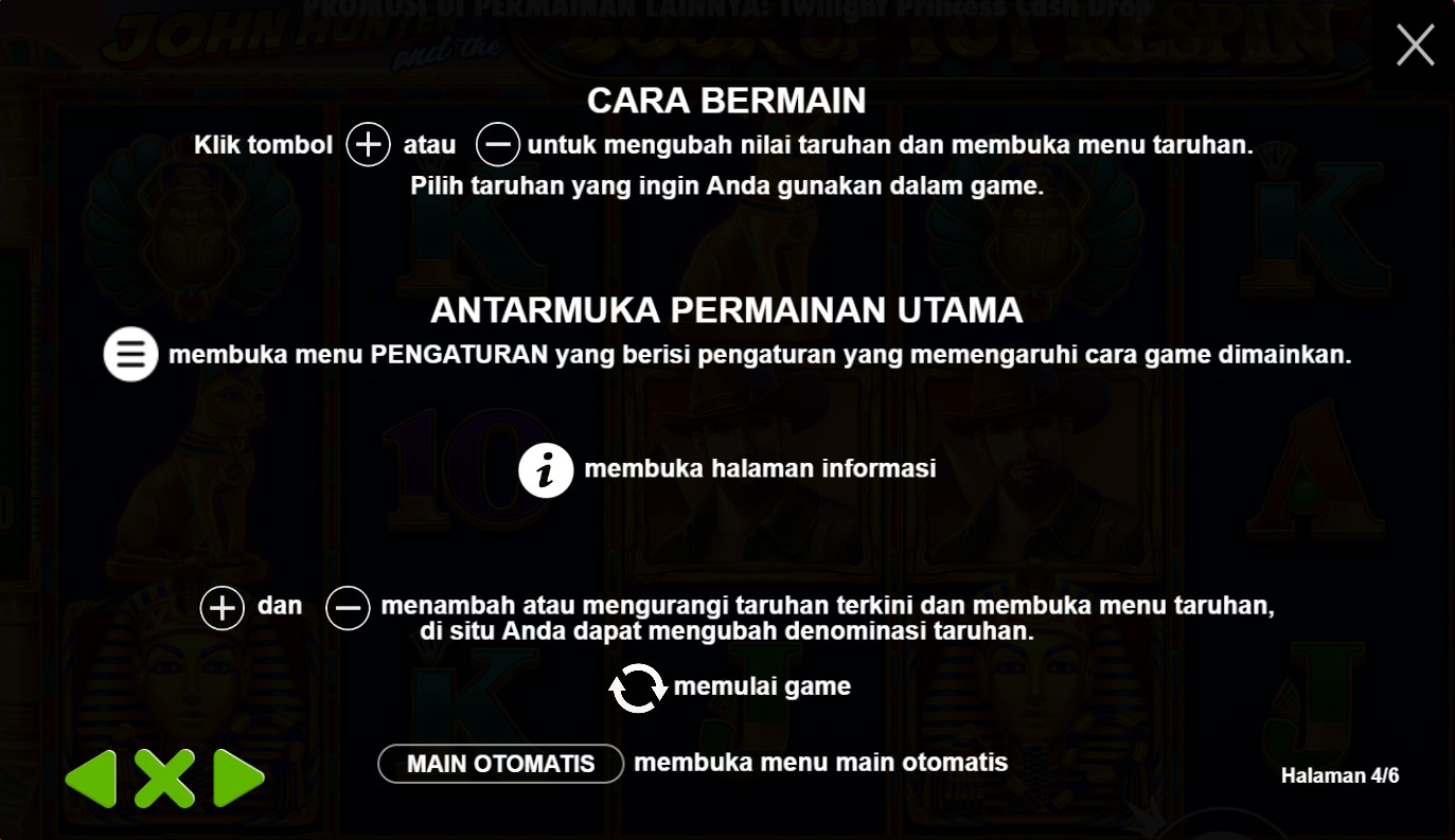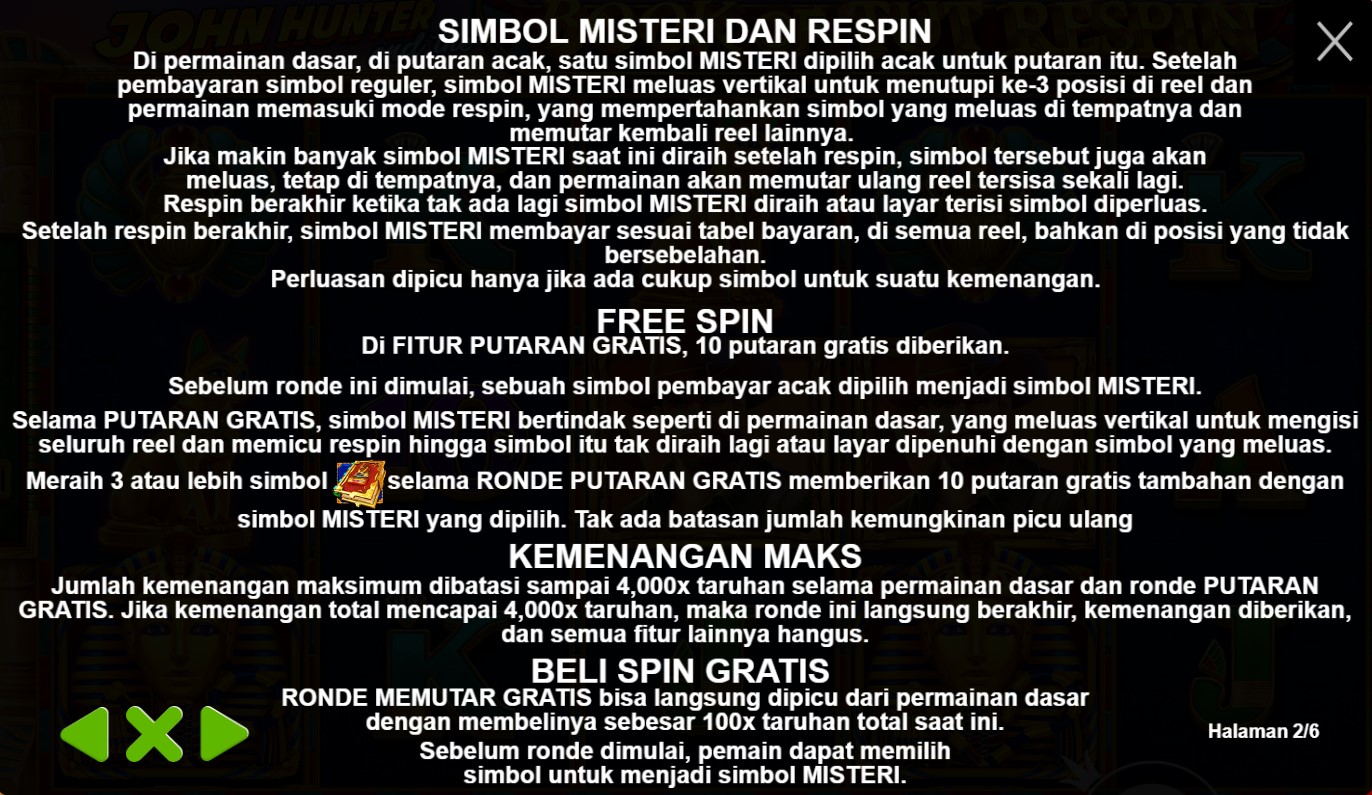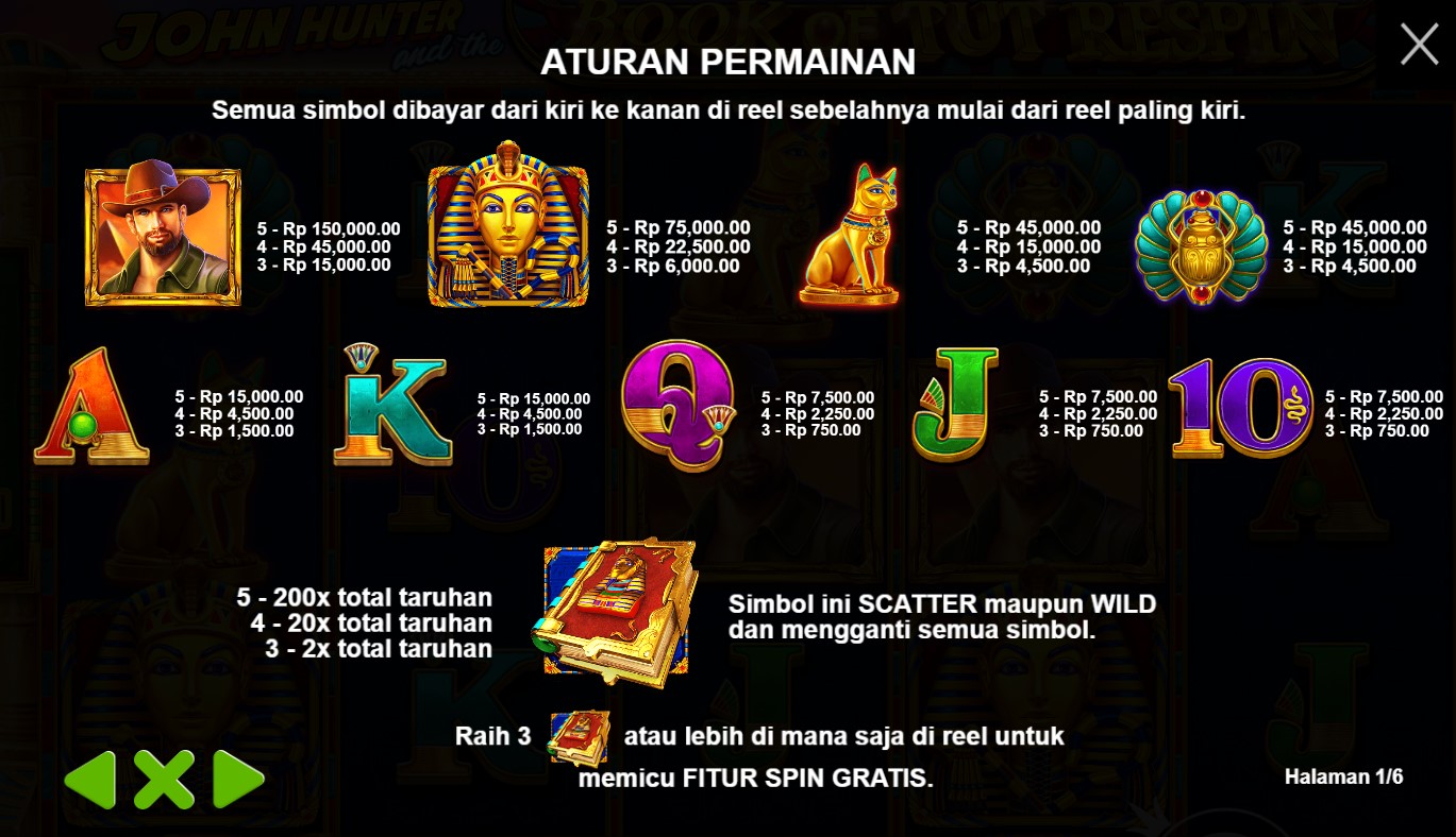 Paytable John Hunter & The Book Of Tut Respin adalah panduan yang membahas simbol-simbol menarik dan potensi kemenangan dalam permainan slot online terpercaya ini. Dalam petualangan epik yang melibatkan penjelajah pemberani, John Hunter, dan buku ajaib Tutankhamun, dikembangkan oleh Pragmatic Play, Anda akan menemui simbol-simbol yang terinspirasi oleh Mesir kuno, seperti arkeolog, artefak kuno, dan Dewa Anubis. Setiap simbol memiliki nilai yang berbeda, dan kombinasi yang tepat akan membawa Anda pada hadiah-hadiah yang menggiurkan. Dalam Paytable John Hunter & The Book Of Tut Respin, Anda akan menemukan informasi penting tentang simbol-simbol yang perlu Anda perhatikan dan strategi yang dapat Anda gunakan untuk meraih kemenangan dalam permainan slot online ini. Fitur-fitur bonus yang menarik, seperti fitur respin yang memberikan peluang ekstra untuk mencapai kombinasi kemenangan, serta putaran gratis dan simbol-simbol khusus, akan memperkaya pengalaman bermain Anda.