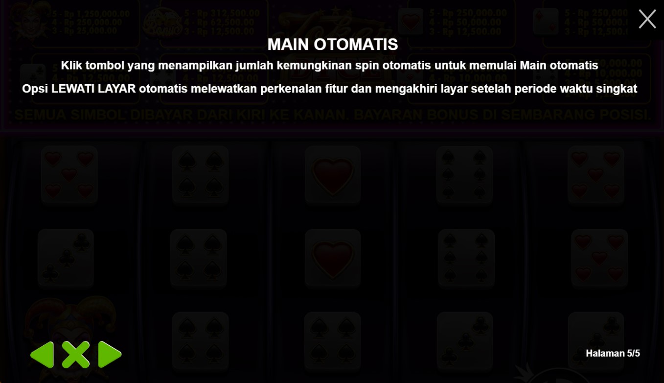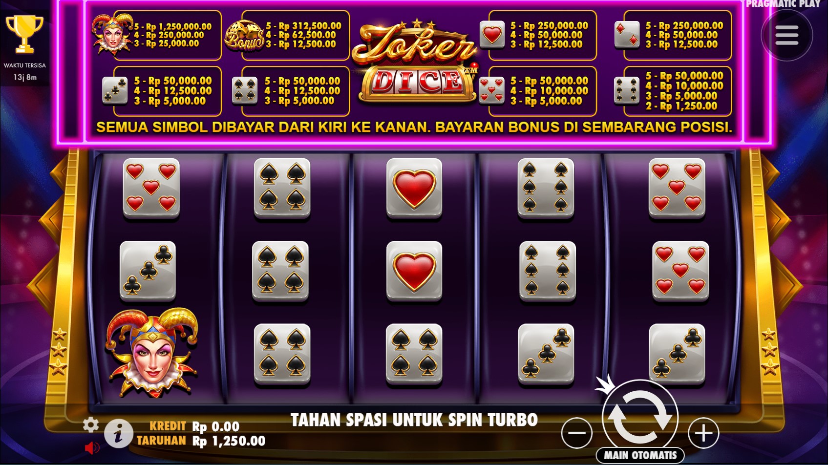 Joker Jewels Dice adalah game slot online yang menghadirkan kegembiraan dan keunikan dengan sentuhan aksi dari karakter Joker yang legendaris. Dikembangkan oleh Pragmatic Play, slot ini menawarkan pengalaman bermain yang penuh warna dan menyenangkan. Dalam Joker Jewels Dice, Anda akan dihadapkan pada gulungan yang dipenuhi dengan berbagai simbol yang mencerminkan kekayaan dan kemewahan. Pertama-tama, simbol-simbol Joker yang ceria dan bersemangat akan mengisi layar permainan Anda. Joker ini adalah simbol yang sangat bernilai, memberikan kesempatan besar untuk meraih kemenangan yang menguntungkan.