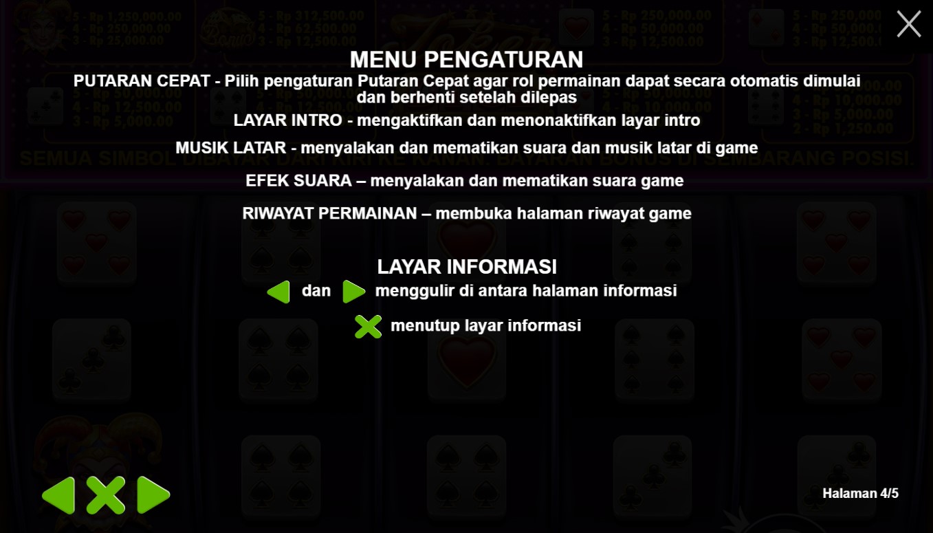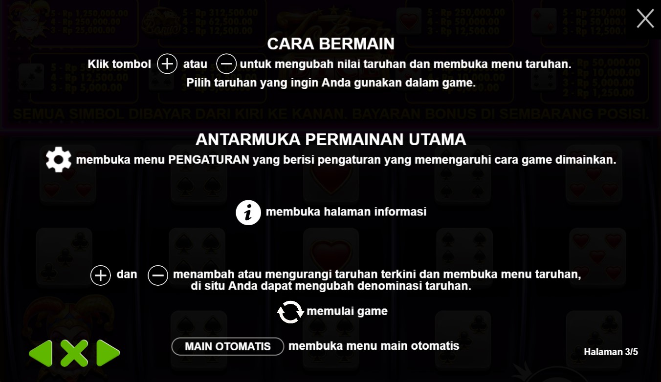 Paytable Slot Online Joker Jewels Dice adalah permainan slot online yang menghadirkan kegembiraan yang tak tertandingi dengan sentuhan aksi dari karakter Joker yang legendaris. Dalam game yang dipercaya ini, Anda akan menemukan berbagai simbol yang memikat dan memperkaya pengalaman bermain Anda. Simbol-simbol dalam Joker Jewels Dice mencerminkan kemewahan dan kegembiraan. Pertama-tama, Anda akan menemukan simbol Joker yang ceria dan bersemangat. Joker ini adalah simbol yang sangat bernilai, memberikan peluang besar untuk meraih kemenangan yang menguntungkan. Selain simbol Joker, Joker Jewels Dice juga menampilkan simbol-simbol permata yang berkilauan. Permata-permata ini melambangkan kemewahan dan kekayaan yang tak terhingga. Setiap simbol permata memiliki nilai yang berbeda-beda, memberikan kesempatan untuk memenangkan hadiah-hadiah yang menarik.