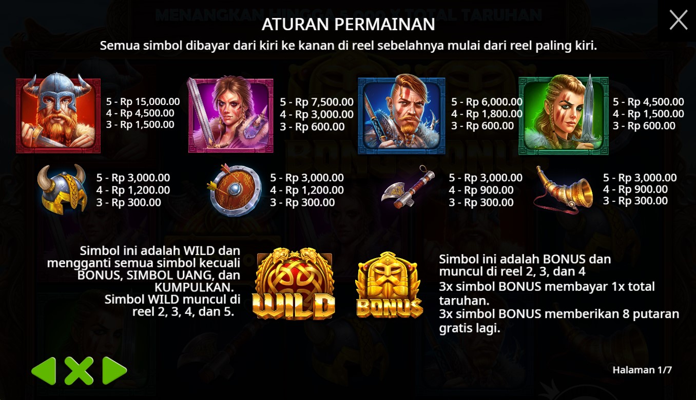 Paytable Slot Online Kingdom Of Asgard adalah permainan slot online terpercaya yang mengangkat tema mitologi Nordik, membawa pemain ke dalam dunia penuh keagungan dan kekuatan dari kerajaan Asgard. Sebagai simbol utama, terdapat wajah-wajah para dewa Nordik yang legendaris, seperti Odin, Thor, dan Loki. Diikuti oleh senjata-senjata khas seperti palu Thor, panah Sleipnir, dan pedang Gram.