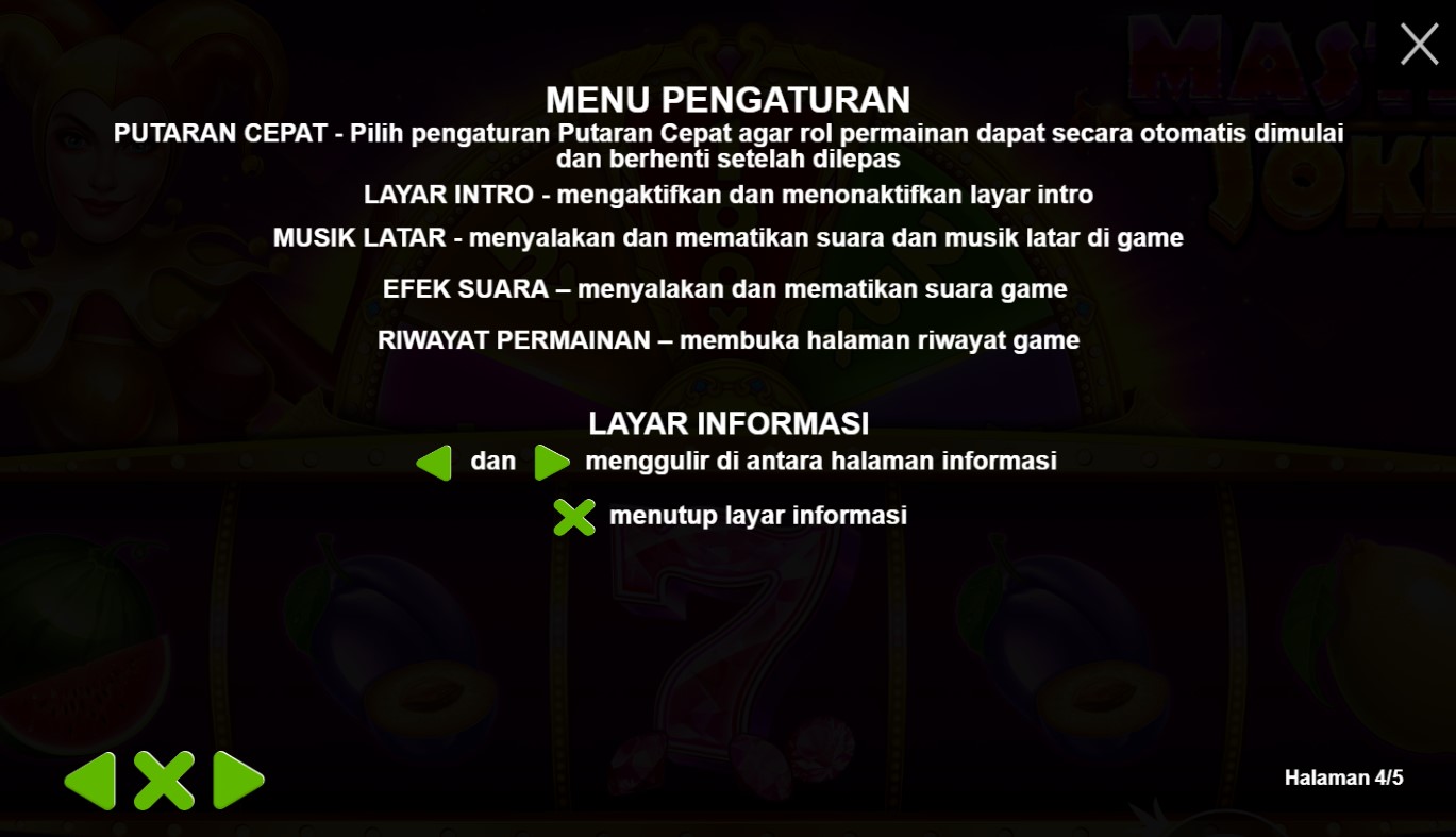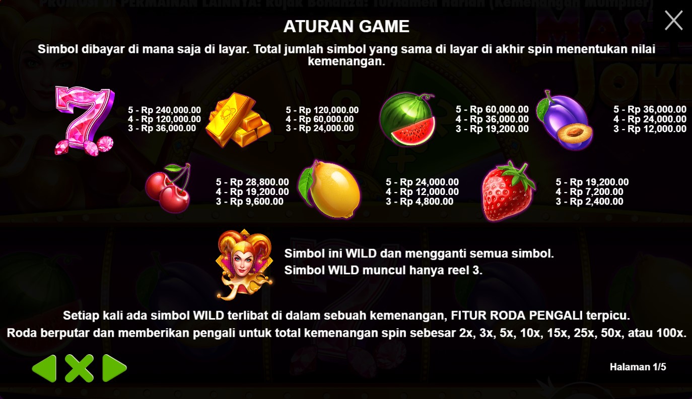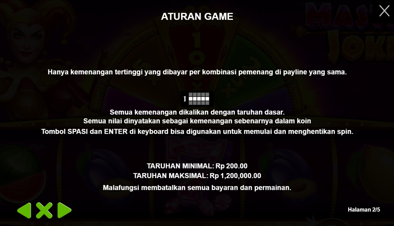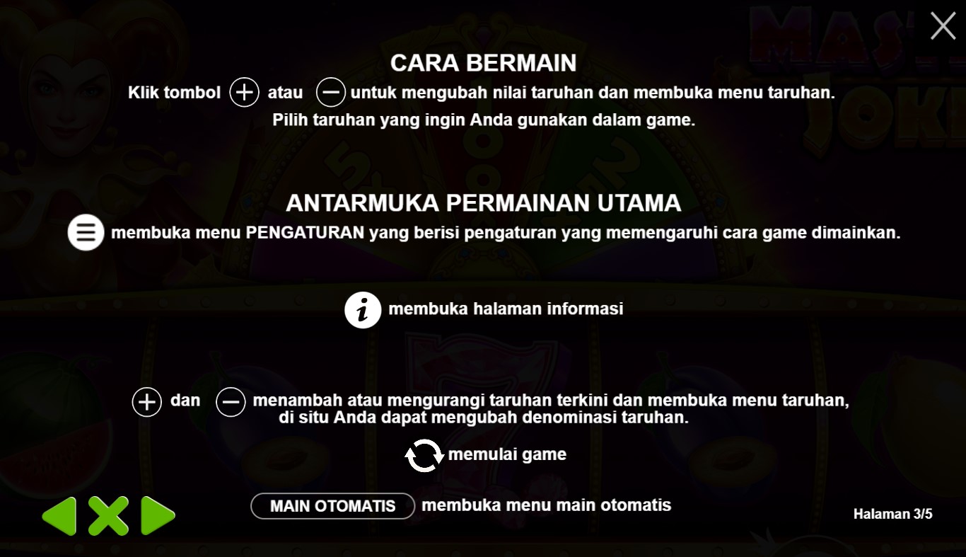 Paytable Slot Online Master Joker adalah panduan lengkap yang mengungkapkan rahasia kombinasi menang dan potensi kemenangan yang menakjubkan dalam permainan slot online terpercaya ini. Judul ini menjanjikan pemain akses ke informasi penting mengenai simbol-simbol yang menarik dan kemungkinan hadiah yang bisa didapatkan dalam Master Joker. Kata pertama paragraf ini diawali dengan kalimat "Paytable Slot Online Master Joker adalah" untuk menarik perhatian pembaca dan menekankan judul. Dalam Paytable Slot Online Master Joker, Anda akan menemukan tabel pembayaran yang terperinci, menampilkan nilai kemenangan untuk setiap simbol yang muncul di gulungan. Simbol-simbol klasik seperti buah-buahan yang lezat, lambang yang melambangkan keberuntungan, dan karakter Master Joker yang misterius akan memainkan peran penting dalam mencapai kemenangan yang menguntungkan. Anda akan mempelajari kombinasi simbol yang menghasilkan pembayaran tertinggi dan fitur-fitur bonus yang dapat meningkatkan potensi hadiah Anda.