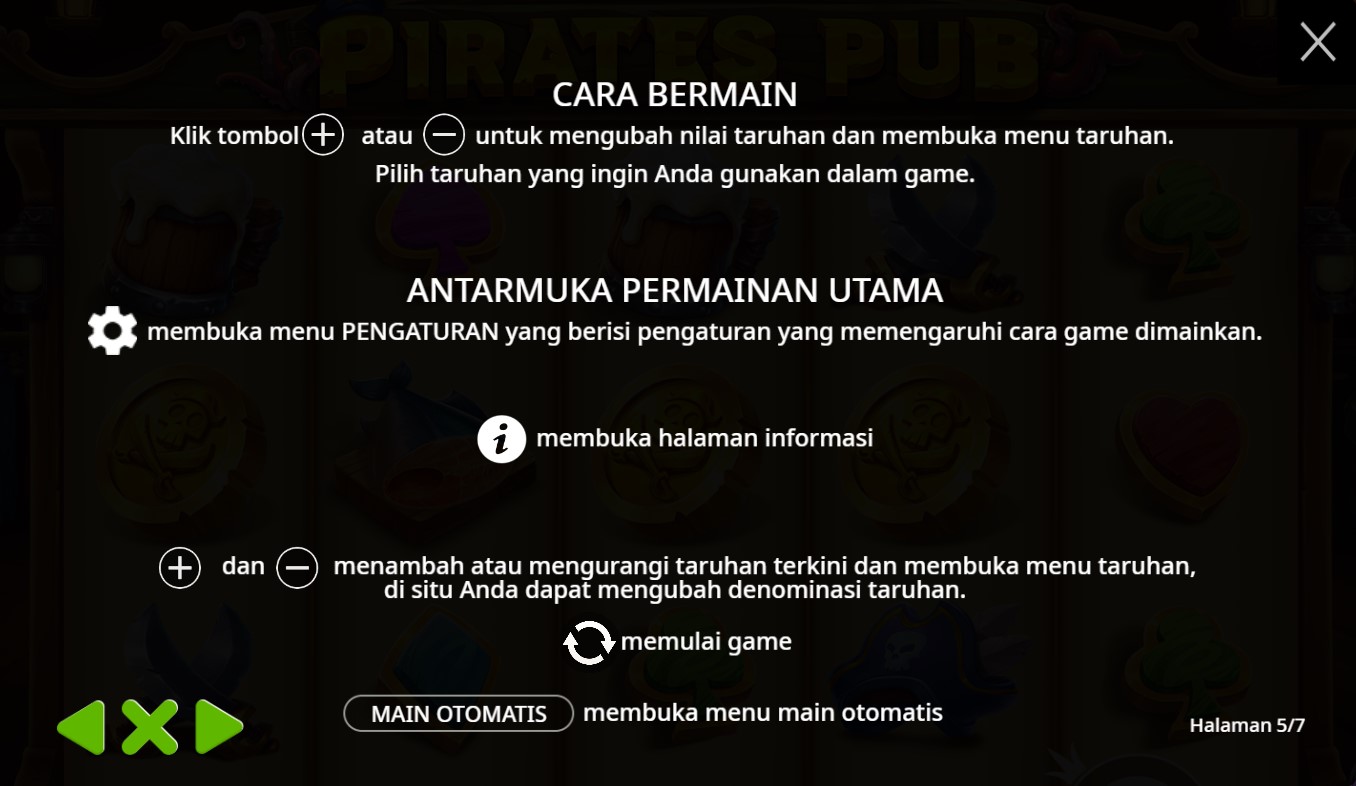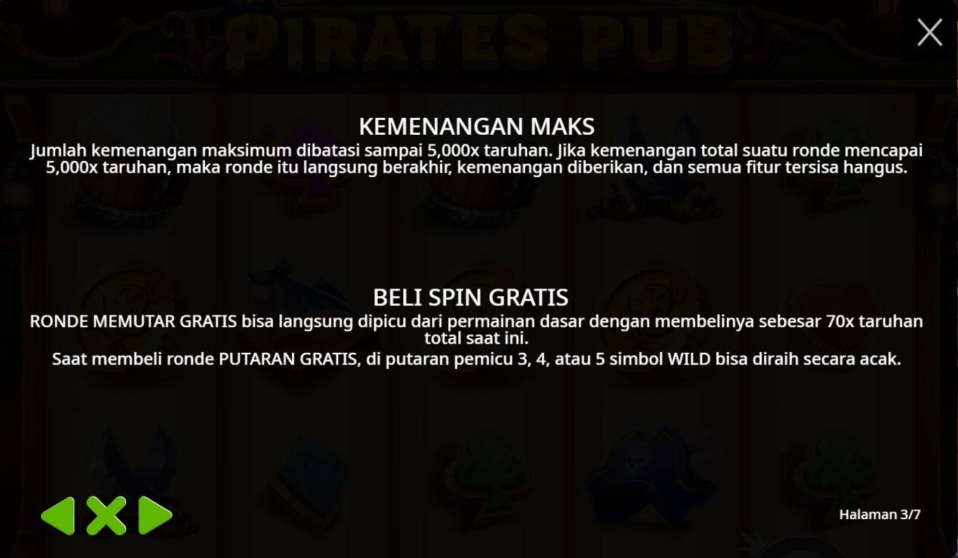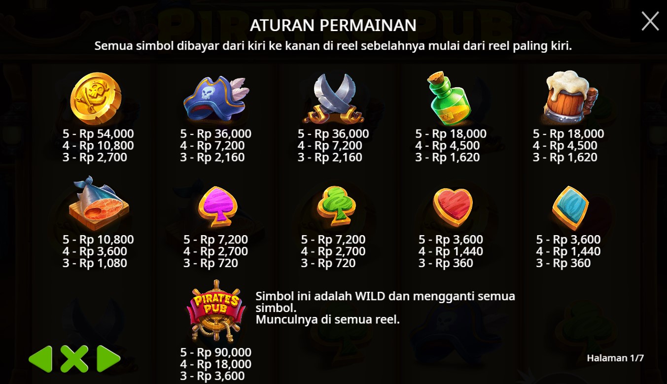 Paytable Slot Online Pirates Pub adalah petualangan seru di dunia bajak laut yang penuh dengan harta karun dan keseruan. Dalam permainan ini, setiap simbol memiliki perannya masing-masing dalam membawa pemain ke dalam pengalaman spektakuler. Anda akan menemukan simbol-simbol menarik seperti Kapten Bajak Laut yang berani, Peti Harta Karun yang mengandung bonus melimpah, serta Bendera Bajak Laut yang menambah suasana petualangan. Tak ketinggalan, simbol Minuman Khas yang menjadi ciri khas pub para bajak laut dan Simbol Jolly Roger yang ikonik. Dengan kombinasi simbol-simbol ini, setiap putaran memberikan peluang menakjubkan untuk meraih kemenangan besar.