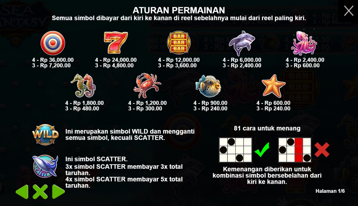 Paytable Slot Online Sea Fantasy adalah kunci utama untuk meraih kemenangan besar dalam game ini. Simbol-simbol yang menghiasi slot online ini mencakup berbagai gambar yang menggambarkan kehidupan laut yang menakjubkan. Mulai dari ikan-ikan berwarna-warni hingga makhluk laut legendaris, setiap simbol memiliki nilai yang berbeda-beda dan dapat memberikan kesempatan kepada pemain untuk meraih hadiah-hadiah fantastis. Simbol-simbol yang dapat ditemui dalam Sea Fantasy antara lain adalah ikan-ikan berwarna cerah, bintang laut berkilau, kerang mutiara yang berharga, dan tentakel raksasa yang misterius. Selain itu, simbol Wild dan Scatter juga hadir untuk meningkatkan peluang kemenangan pemain. Dengan memahami paytable dan nilai dari setiap simbol, pemain dapat merencanakan strategi permainan mereka dengan lebih baik dan meningkatkan peluang untuk meraih kemenangan besar di Sea Fantasy, slot online terpercaya dari Pragmatic Play.
