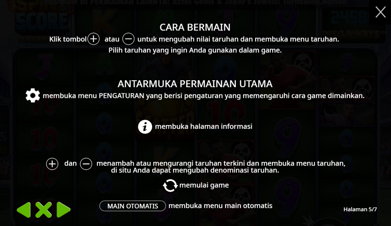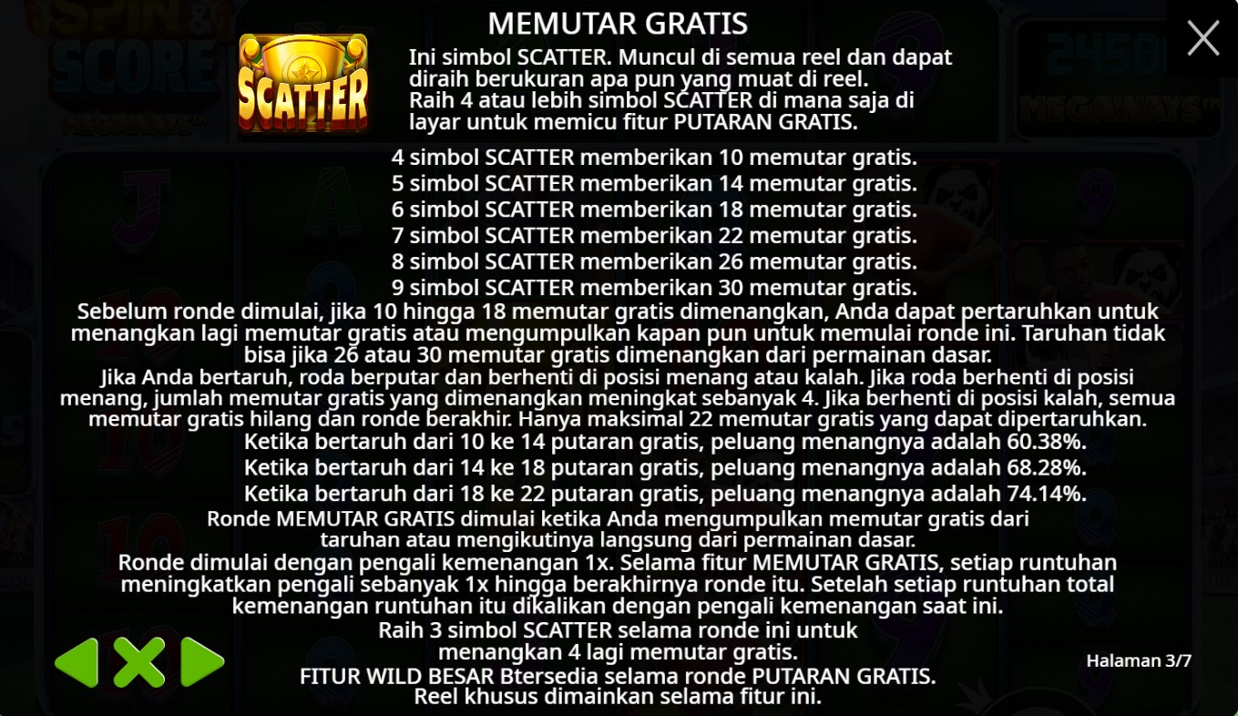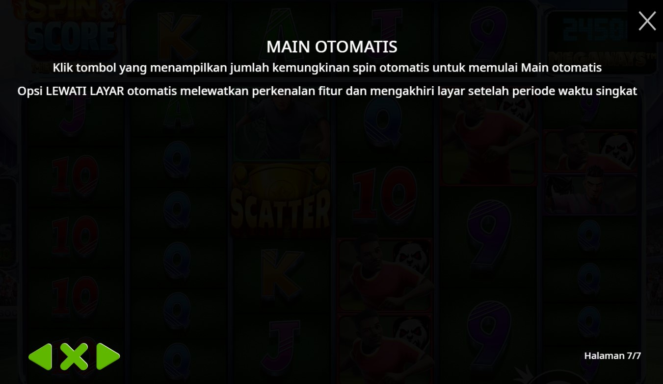 Paytable Slot Online Spin & Score Megaways adalah permainan slot online yang menawarkan peluang kemenangan besar melalui fitur Megaways yang inovatif. Dengan lebih dari 100.000 cara untuk memenangkan hadiah, game ini siap mengantarkan pemain ke petualangan menuju kemenangan spektakuler. Simbol-simbol utama yang dapat ditemukan di dalam game meliputi ikon-ikon bertema kekayaan, seperti berlian, emas, dan stack uang tunai. Selain itu, terdapat pula simbol kartu remi dari Ace hingga 10 yang turut berperan dalam pembentukan kombinasi pemenang. Simbol liar dan simbol scatter menjadi komponen penting yang dapat memicu fitur-fitur bonus yang menguntungkan.
