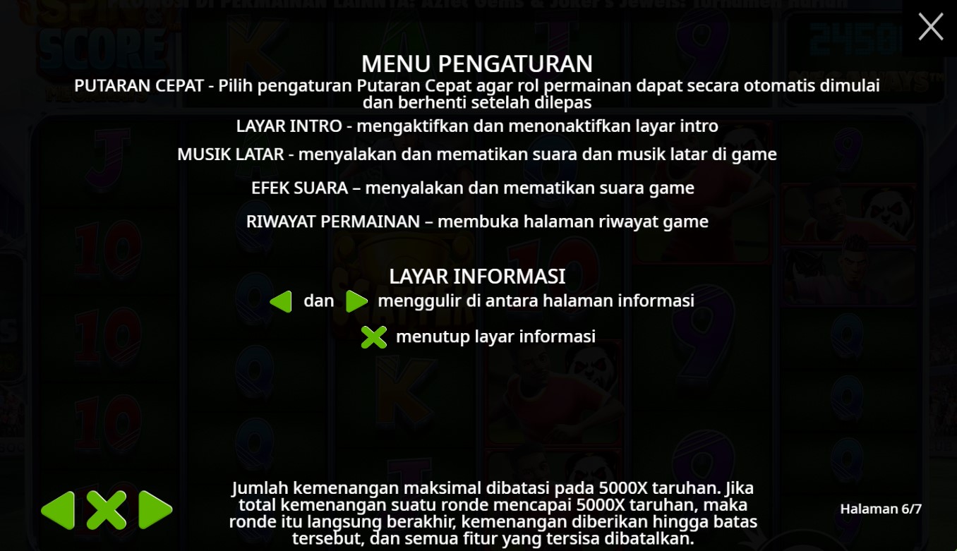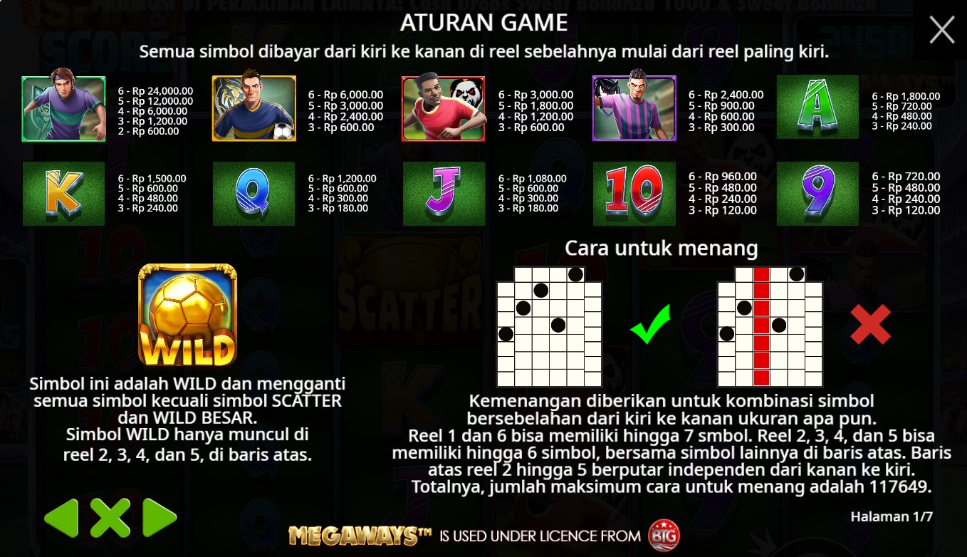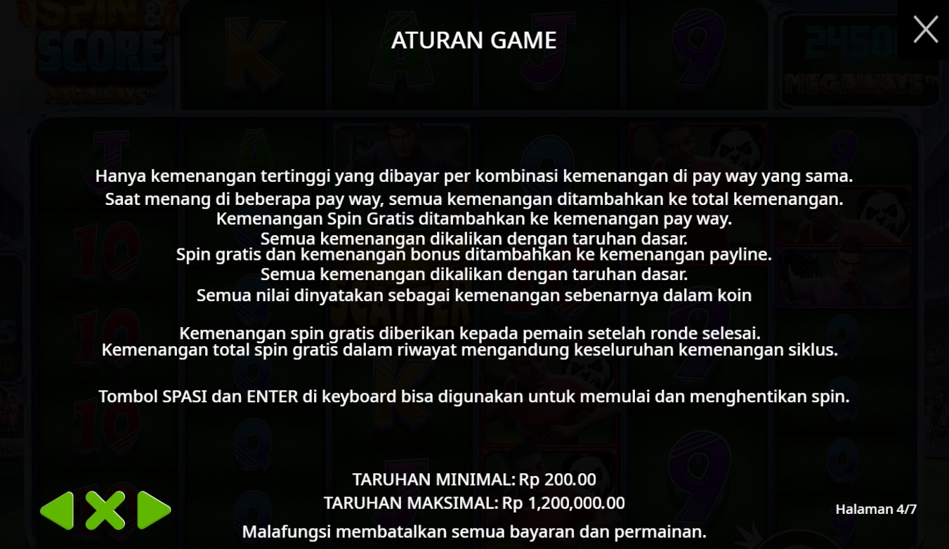 Paytable Slot Online Spin & Score Megaways adalah permainan slot online yang menawarkan peluang kemenangan besar melalui fitur Megaways yang inovatif. Dengan lebih dari 100.000 cara untuk memenangkan hadiah, game ini siap mengantarkan pemain ke petualangan menuju kemenangan spektakuler. Simbol-simbol utama yang dapat ditemukan di dalam game meliputi ikon-ikon bertema kekayaan, seperti berlian, emas, dan stack uang tunai. Selain itu, terdapat pula simbol kartu remi dari Ace hingga 10 yang turut berperan dalam pembentukan kombinasi pemenang. Simbol liar dan simbol scatter menjadi komponen penting yang dapat memicu fitur-fitur bonus yang menguntungkan.