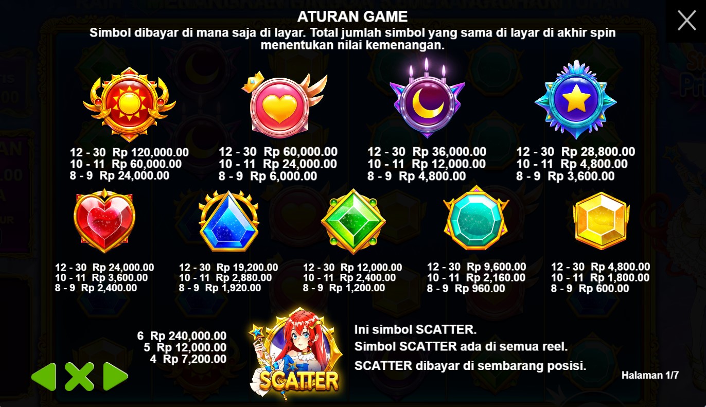 Starlight Princess menampilkan berbagai paytable menarik yang membuat pengalaman bermain semakin seru. Dalam game ini, terdapat paytable untuk simbol Wild yang dapat menggantikan simbol lain kecuali Scatter untuk membentuk kombinasi kemenangan. Selain itu, terdapat paytable untuk simbol Scatter, yang jika berhasil mendapatkan 3 atau lebih simbol Scatter, pemain dapat memicu fitur Free Spins yang memberikan putaran gratis dengan jumlah tergantung pada jumlah simbol Scatter yang muncul. Game ini juga memiliki paytable untuk fitur Respins yang dapat diaktifkan secara acak setelah putaran reguler, dimana pemain akan mendapatkan Respins dengan simbol Wild yang menempel di gulungan. Dengan adanya fitur Win Multiplier, setiap kemenangan berturut-turut akan meningkatkan nilai kemenangan hingga mencapai nilai tertentu, memberikan peluang besar untuk meraih kemenangan besar di Starlight Princess.