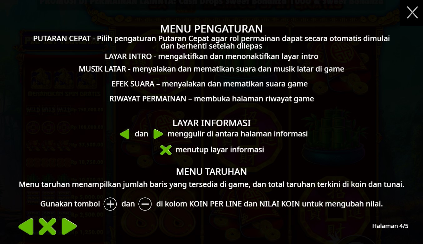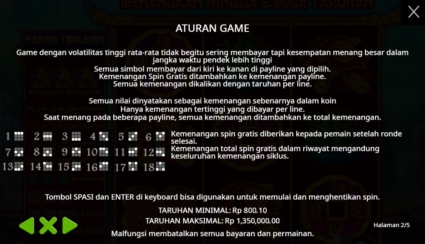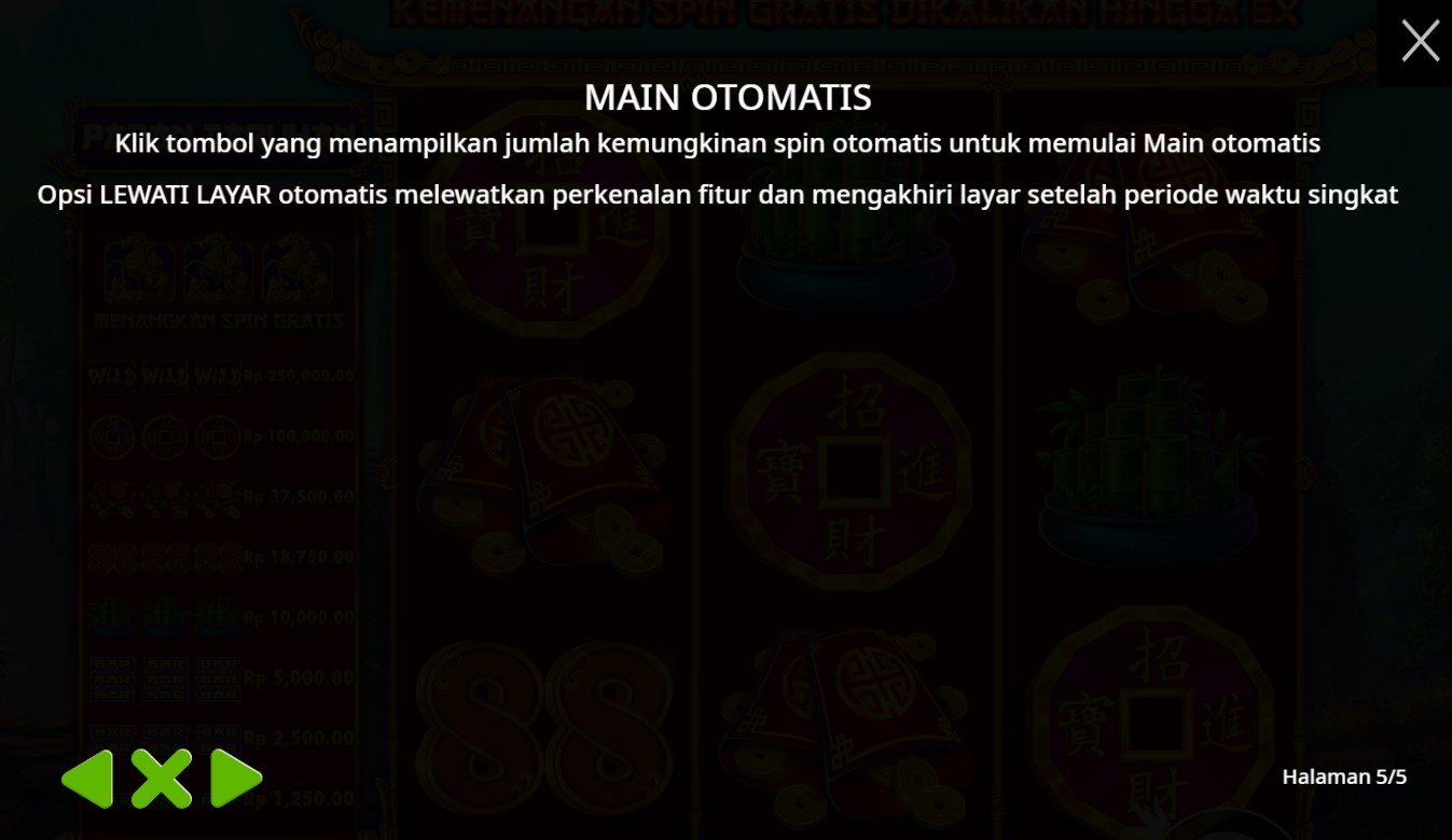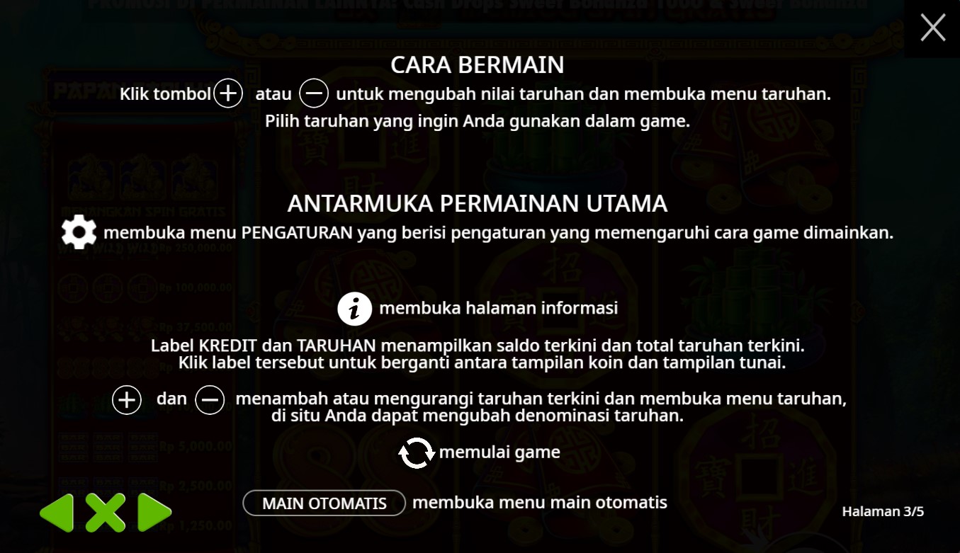 Paytable pada slot online "Treasure Horse" biasanya berisi informasi terkait simbol-simbol permainan, nilai pembayaran untuk setiap simbol, serta kombinasi simbol yang memberikan kemenangan. Meskipun saya tidak memiliki akses langsung ke informasi spesifik tentang paytable untuk "Treasure Horse," umumnya, paytable mencakup beberapa hal berikut: 1. **Simbol Dasar**: Menampilkan nilai dari simbol-simbol biasa seperti kartu remi (A, K, Q, J, 10) dan simbol tematik seperti kuda, peti harta karun, atau simbol lainnya yang relevan dengan tema permainan. 2. **Simbol Khusus**: Informasi tentang simbol liar (wild) dan simbol pencar (scatter), termasuk bagaimana mereka dapat digunakan untuk membentuk kombinasi pemenang. 3. **Fitur Bonus**: Deskripsi tentang fitur bonus, putaran gratis, dan cara untuk mengaktifkannya. 4. **Kombinasi Menang**: Detail mengenai kombinasi tertentu yang memberikan pembayaran tertinggi, serta aturan terkait seperti arah pembacaan kombinasi atau jumlah simbol yang dibutuhkan untuk menang. Jika Anda memiliki akses ke permainan tersebut, Anda bisa melihat paytable dengan mengklik ikon informasi (biasanya berupa tanda "?") yang ada di layar. Jika ada pertanyaan lebih spesifik mengenai permainan ini, silakan tanyakan!