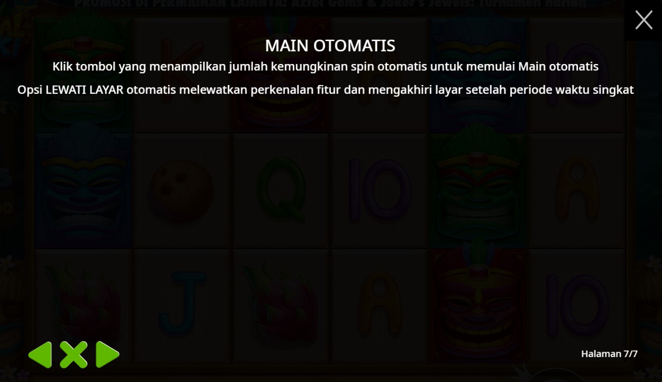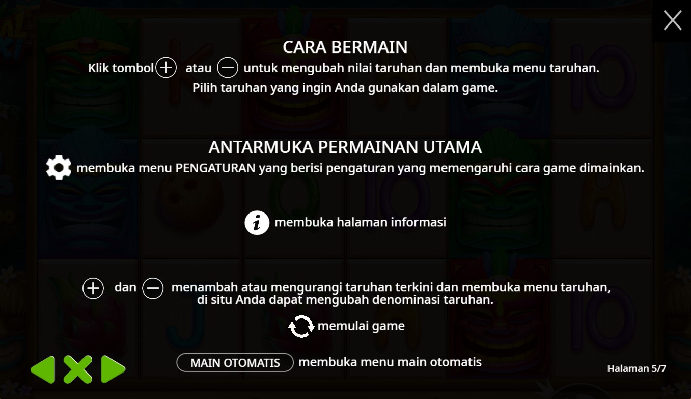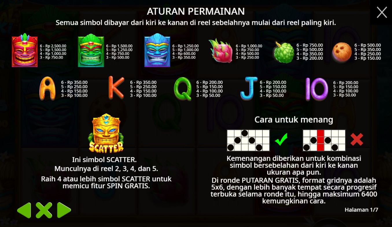Paytable Slot Online Tropical Tiki adalah sajian permainan slot online terpercaya dari Pragmatic Play yang mengangkat suasana tropis yang penuh warna dan keceriaan. Sebagai simbol utama, terdapat maskot topeng tiki yang khas, diikuti oleh buah-buahan tropis seperti nanas, mangga, dan kelapa muda. Simbol-simbol lain yang turut hadir adalah kartu remi yang dihiasi dengan motif-motif bunga dan dedaunan, serta peralatan tradisional seperti tifa dan panah. Fitur-fitur unggulan seperti putaran gratis, simbol-simbol bertumpuk, dan multiplikator hadir untuk memberikan kesempatan bagi pemain meraih kemenangan besar. Simbol maskot topeng tiki bertindak sebagai simbol liar, dapat menggantikan simbol lain untuk membentuk kombinasi pemenang yang lebih menguntungkan. Sementara itu, putaran gratis membuka pintu peluang mendapatkan jackpot fantastis.