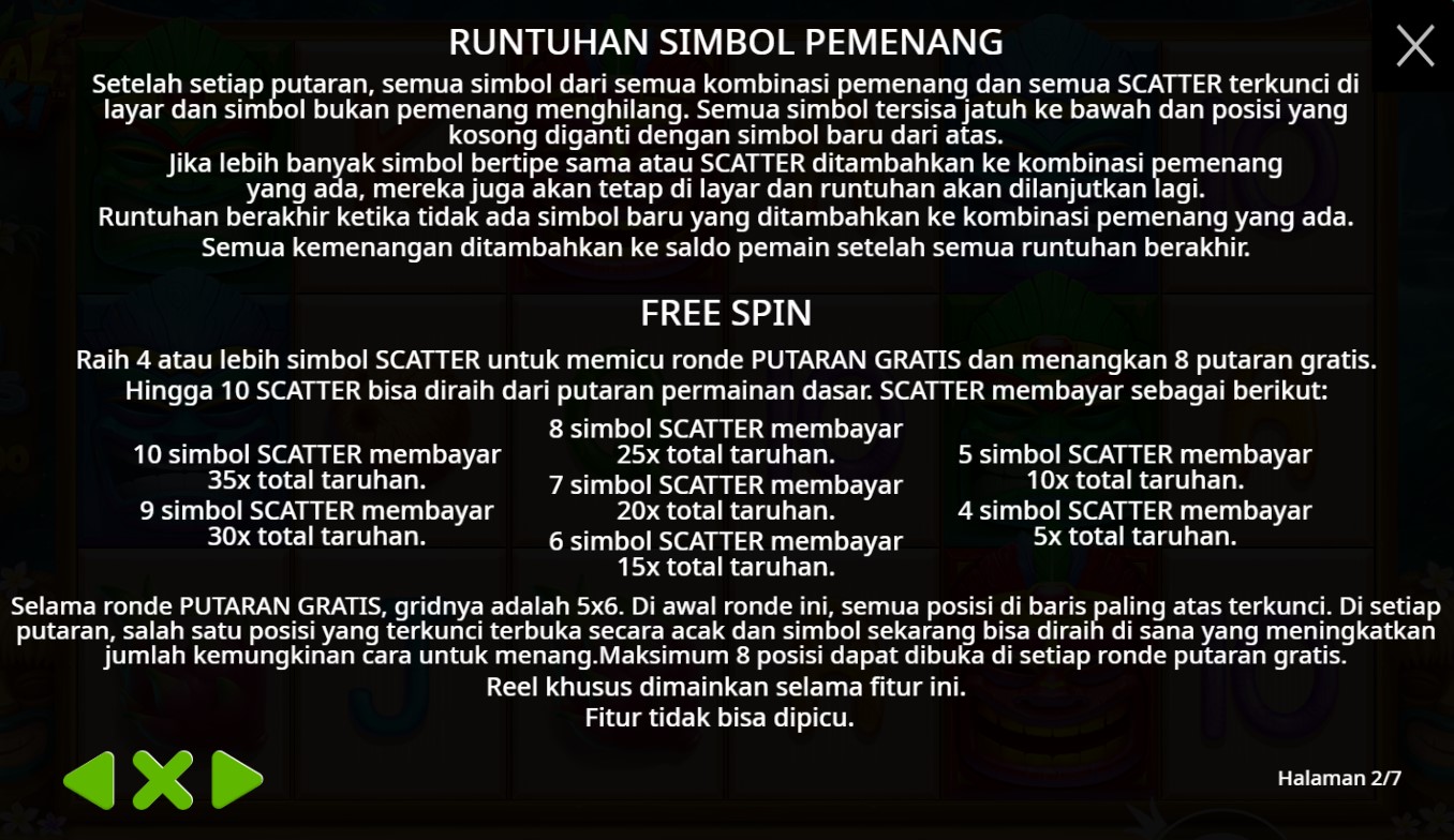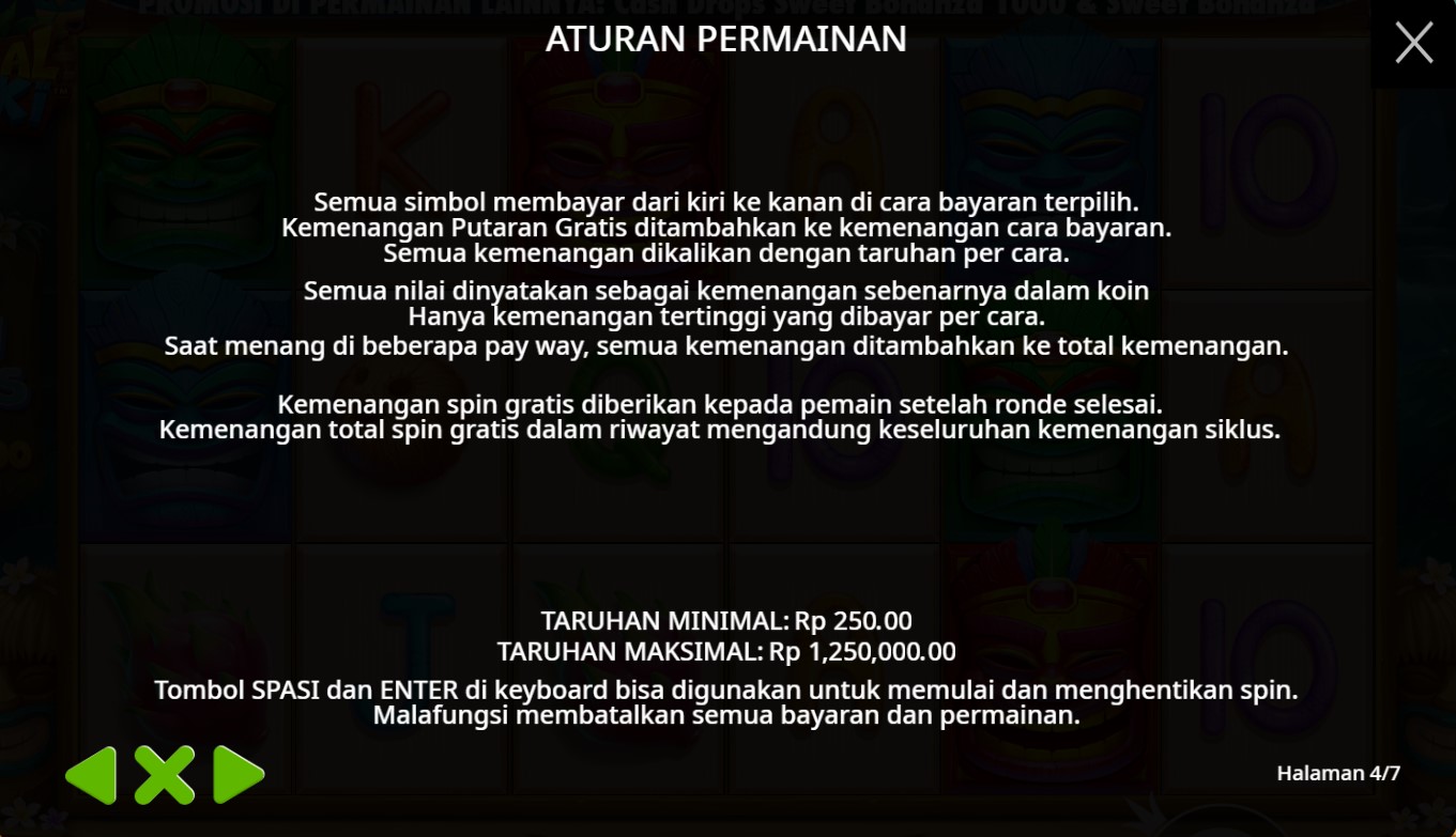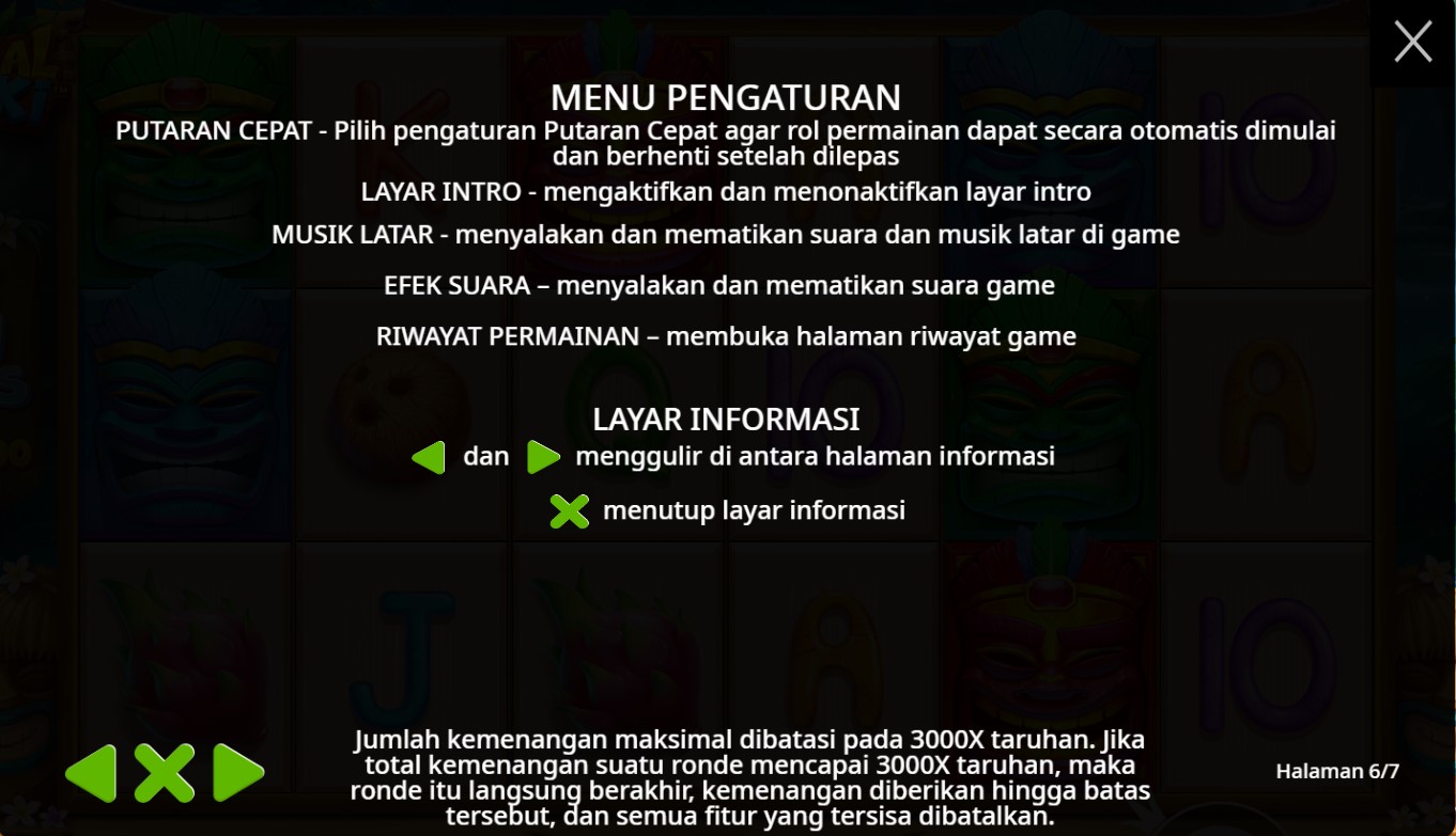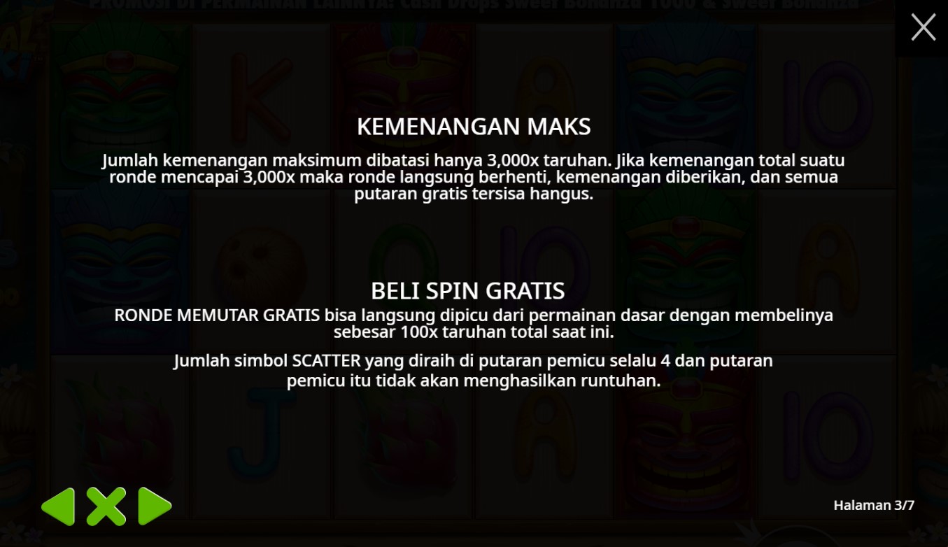 Paytable Slot Online Tropical Tiki adalah sajian permainan slot online terpercaya dari Pragmatic Play yang mengangkat suasana tropis yang penuh warna dan keceriaan. Sebagai simbol utama, terdapat maskot topeng tiki yang khas, diikuti oleh buah-buahan tropis seperti nanas, mangga, dan kelapa muda. Simbol-simbol lain yang turut hadir adalah kartu remi yang dihiasi dengan motif-motif bunga dan dedaunan, serta peralatan tradisional seperti tifa dan panah. Fitur-fitur unggulan seperti putaran gratis, simbol-simbol bertumpuk, dan multiplikator hadir untuk memberikan kesempatan bagi pemain meraih kemenangan besar. Simbol maskot topeng tiki bertindak sebagai simbol liar, dapat menggantikan simbol lain untuk membentuk kombinasi pemenang yang lebih menguntungkan. Sementara itu, putaran gratis membuka pintu peluang mendapatkan jackpot fantastis.
